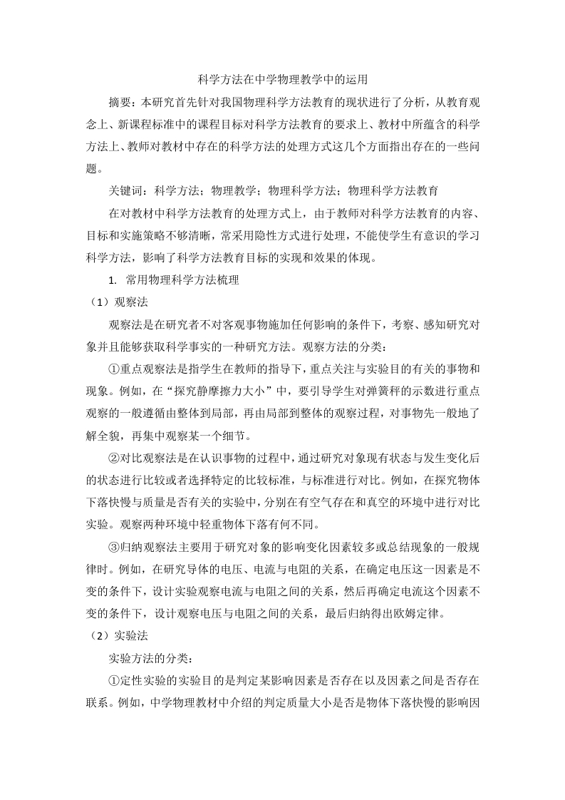 科学方法在中学物理教学中的运用摘要:本研究首先针对我国物理科学方法教育的现状进行了分析,从教育观念上、新课程标准中的课程目标对科学方法教育的要求上、教材中所蕴含的科学方法上、教师对教材中存在的科学方法的处理方式这几个方面指出存在的一些问题。关键词:科学方法:物理教学:物理科学方法:物理科学方法教育在对教材中科学方法教育的处理方式上,由于教师对科学方法教育的内容、目标和实施策略不够清晰,常采用隐性方式进行处理,不能使学生有意识的学习科学方法,影响了科学方法教育目标的实现和效果的体现。1.常用物理科学方法梳理(1)观察法观察法是在研究者不对客观事物施加任何影响的条件下,考察、感知研究对象并且能够获取科学事实的一种研究方法。观察方法的分类:①重点观察法是指学生在教师的指导下,重点关注与实验目的有关的事物和现象。例如,在“探究静摩擦力大小”中,要引导学生对弹簧秤的示数进行重点观察的一般遵循由整体到局部,再由局部到整体的观察过程,对事物先一般地了解全貌,再集中观察某一个细节。②对比观察法是在认识事物的过程中,通过研究对象现有状态与发生变化后的状态进行比较或者选择特定的比较标准,与标准进行对比。例如,在探究物体下落快慢与质量是否有关的实验中,分别在有空气存在和真空的环境中进行对比实验。观察两种环境中轻重物体下落有何不同。③归纳观察法主要用于研究对象的影响变化因素较多或总结现象的一般规律时。例如,在研究导体的电压、电流与电阻的关系,在确定电压这一因素是不变的条件下,设计实验观察电流与电阻之间的关系,然后再确定电流这个因素不变的条件下,设计观察电压与电阻之间的关系,最后归纳得出欧姆定律。(2)实验法实验方法的分类:①定性实验的实验目的是判定某影响因素是否存在以及因素之间是否存在联系。例如,中学物理教材中介绍的判定质量大小是否是物体下落快慢的影响因素的实验,影响惯性大小因素的实验等都属于定性实验。定量实验的实验目的包括对特定的研究对象数值进行测量,求影响因素之间确定的数量关系,或者用数量关系去验证具体物理规律的实验。例如,学习用打点计时器测速度、探究加速度与力、质量的关系,探究功与速度变化的关系等都属于定量实验。②探索性实验,是指人们从事研究工作时,为了探索事物或现象的性质及其规律时所进行的实践活动。验证性实验,是在研究者对研究对象有了一定的认识之后,根据已有的知识,对现象背后的原因、规律作出猜想和推测,为了检验其正确与否所设计的实验。③对比实验是通过设计实验进行对比、分析,通过异中求同或同中求异对现象进行总结,揭示所研究事物的某种属性或规律的实验。例如,在楞次定律的探究过程中采用对比实验分析实验现象。模拟实验,是在某些研究过程中,受客观条件的限制下无法对现象进行直观演示,就要人为地创造环境在模拟的条件下进行实验。(3)理想化方法理想化方法就是借助于逻辑思维能力和想象力,有意识地突出研究对象的主要条件,排除次要因素和无关因素的干扰,在大脑中形成理想化的研究客体或相互联系,来探索物理世界内在奥妙的方法。在物理学中,理想化方法一般有以下三种主要形式:物理条件的理想化、物理模型的理想化、物理实验的理想化。(4)比较与分类比较是在分析研究对象之间的共同点和差异点的目的下,所采取的研究方法和思维过程。在研究任何物理现象和规律的过程中,都可以通过比较来确定共同点和差异点。比较方法还为进一步的抽象概括做准备工作,是理论研究的重要方法之一,也是系统地科学地认识自然地重要方法。分类法亦称归类法,是在分析了根据研究对象的共同点和差异点的基础上,将研究对象分为不同种类的逻辑方法。(5)分析与综合分析法就是人们在思维过程中把研究对象由整体分解为若干组成部分、层次或要素,然后对它的各个部分、层次或要素分别进行研究,揭示它们的属性和本质:并研究这些部分、层次或要素之间的相互作用及其在整体对象中的地位,考察它们对研究对象的状态及发展变化的影响,从未知追溯到已知,最后达到对该对象的整体有较全面的认识。综合法就是把研究对象的各个组成部分联合起来加以研究,从而在整体中把握事物的本质的思维方法。但这种联合不是简单的机械的联合而是建立在辩证关系基础上的联合。因此,要深入地研究事物的现象和本质、各个方面和主要方面之间的关系。(6)归纳与演绎①归纳法:是从具体事物入手,抽象概括出具有普遍性的结论,这种认识的思维方法和推理形式叫做归纳法。归纳法认识事物的本质是由个性到共性、由个别到一般、由现象到本质、由具体到抽象的认识过程。用培根的话说,就是“从感觉与特殊事物中把公理引申出来,然后不断地逐渐上升,最后达到最普遍的公理”。②演绎法是根据一类事物都具有的本质和属性推断出同类事物中的个别对象也具有此本质和属性的思维方法和推理过程。演绎法是从普遍、一般到特殊、个别的认识过程,与归纳法相反。(7)类比法类比法是一种由特殊到一般再由一般到特殊的推理过程,在两个(或两类)研究对象在某些方面具有相同或相似属性的情况下,推出它们在其它方面