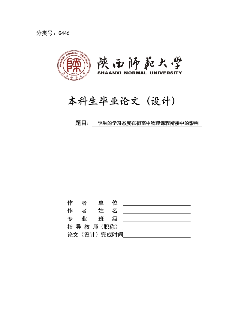 分类号:G446SHAANXI NORMAL UNIVERSITY本科生毕业论文(设计)题目:学生的学习态度在初高中物理课程衔接中的影响作者单位作者姓名专业班级指导教师(职称)论文(设计)完成时间学生的学习态度在初高中物理课程衔接中的影响作者(XXX)(陕西师范大学XXXXXXXXX学院陕西西安710062)摘要:作为一门重要的自然学科,物理的学习对于学生认识自然规律、理解科学内涵、养成探究精神、树立价值观都有着重要的作用,但是由于高中物理课堂所需要的学习方法和学习能力方面和初中的物理课堂有着显著的区别,所以很多学生难以适应,如何使高一学生适应高中物理课堂的教学,是摆在物理教学中重要的问题。笔者本文以学生的学习态度在初高中物理课程衔接中的影响为研究对象,在引言部分介绍了问题提出的背景、意义、国内外研究现状及本课题所用的方法及不足,接下来对初高中物理教学衔接的理论基础做了论述,从认知发展理论、建构主义学习理论、结构主义教学理论以及最优化教学理论四个方面做研究,继而是对初高中学生的学习态度进行研究,分别从中学生学习态度的现状、中学生学习态度的变化趋势、中学生学习态度与性别差异以及中学生学习态度与成绩的关系四个方面进行研究,最后是学生的学习态度在初高中物理课程衔接中的影响,从学习态度的意义、学习态度的动机、学习态度作为教学目标的情感领域以及学习态度对物理教学课程衔接的作用四个方面进行探究,得出结论。希望本文可以对从事高中物理课程教学的老师提供一,点参考。关键词:学习态度;初高中物理;物理课堂;教学衔接Affect Student Learning Attitude at the Beginning of High SchoolPhysics Curriculum Cohesion(****************,Shanxi Normal University,Xi'an 710062,Shanxi,China)Abstract:As an important natural sciences,physics learning for students tounderstand the laws of nature,understand the scientific connotation,to develop aspirit of inquiry,set values ??all have an important role,but due to high schoolphysics classroom learning needs and learning capacities and junior high schoolphysical classroom has a significant difference,it is difficult to adapt to many students,high school students how to adapt teaching high school physics class,the pendulum isimportant in physics teaching problems.The author of this article to affect students'learning attitudes for the study,in theintroduction part introduces the background of the issues raised,the significance,research status and methods used and less the subject at the beginning of high schoolphysics curriculum Cohesion,next to the beginning of high school theoretical physicsteaching basic convergence doing discussed,cognitive development theory,constructivist learning theory,structuralism teaching theory and teaching four aspectsof optimization theory to do research,and then is the beginning of high schoolstudents learning attitude studies,respectively,from study of middle school studentslearning attitude,change of attitude of high school students learning,secondaryschool students learning attitude and gender differences and learning attitude andperformance in four areas of the relationship between high school students,andfinally affect the attitude of students in middle and high school physics curriculumCohesion,from Importance of learning attitude,motivation attitudes,learning attitudeas affective domain teaching objectives and learning attitude physics curriculum toexplore the role of Cohesion four concluded.I hope this can provide a reference forteaching in high school physics teacher curriculum.i NKey words:learning attitude;Junior high school physics;Physics Classroom;Teaching Connection