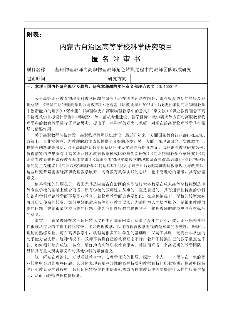 附表:内蒙古自治区高等学校科学研究项目匿名评审书项目名称基础物理教师向高职物理教师角色转换过程中的教师团队形成研究起止时间研究方向本项目国内外研究现状及趋势,研究本课题的实际意义和理论意义(限1000字)关于高等职业教育物理学科教学问题的研究无论在国内还是在国外,都有很多成功的经验及理论总结:《浅谈高职物理教学现状与改革》(池雪莲《职教论坛》2003.4)《浅谈五年制高职物理教学中创新能力的培养》(张小鹏)《物理学史在高职物理教学中的意义》(李文波)《职业教育理念下高职物理教学目标设计原则》(韩晓玢)等,都从专业建设、教学目标、教学要求等方面对高职教育物理学科的教育教学进行了理论思考,提出了一些崭新的观念与见解,对现在的高职物理教学具有指导与借鉴作用。关于高职教师队伍建设、高职物理教师队伍建设,最近几年来一方面国家教育行政部门在立法、政策上一直非常关注,为教师的职业成长提供了良好的环境:另一方面,在理论研究、实践教学上,也屡有创新成果出现,对于高职教育教学师资队伍建设实践具有指导意义。以理论与教学研究为例,值得借鉴的成果就有《高等职业技术教育教学模式比较与创新研究》《高职物理教学改革研究》《高职高专教育物理课程教学基本要求》《高职高专物理实验教学的现状调查与改革思路》《高职物理教学的特点及建议》《高职院校物理教学如何适应应用型人才培养》《浅谈高职物理教学现状与改革》。这些研究都紧密围绕高职物理教学展开,既有教育教学实践的总结,也不乏理论的思考,具有借鉴意义。值得关注的问题在于,我国尤其是内蒙古自治区的高职院校大多数是在成人高等院校特别是中等专业学校的基础上整合而成。原有学校的教师过去从事的一直是普通的、具有通识性特点的学科知识和学科理论教学而不是职业教育。就物理教学而言也是如此。在这种情况下,学校的转型意味着其历史使命的转变,如何更好地适应高等职业教育要求、为适用性人才培养服务,是很多教师面临的问题,也是很多学校面临的问题:作为应用性很强的物理学科,物理教师的转型更具有指标性的意义。事实上,很多教师在这一角色转化过程中面临着困惑:从事了多年的职业习惯、职业修养使他们很难从过去的工作中转化过来。比如物理教学,以往的教育教学重视的是知识的系统性、条理性、理论的熟练掌握:可在高职教学中,物理是很多工科学生的基础课,又是工具课,还需要非常强的动手能力做支撑。这种情况下,教师不转换自己的教育理念不行,教师不转换自己的教学重点也不行,如何很好地完成这一转变,更好地为高等职业教育服务,并进而形成一个高素质的教学团队,显然具有重大现实意义和对其他学科的示范意义。这一研究在理论上,可以通过教育学、心理学理论的指导,探讨一个人、一个团队在一生的职业转型中会遇到哪些问题,其具体表现有哪些共性的心理特质和教师独特的职业特质:探讨中国高等职业教育发展过程中,教师角色转换过程中培训机构或者校本教育中需要提供什么样的服务与帮助,从而为教师成长提供服务。二、项目研究的内容,预计突破哪些难题(限1000字)课题研究分别以基础物理教学的特点、要求和高等职业教育物理教学的特点、要求为出发点,分析两种不同类别的教育对教师的要求及其特点,从而研究教师在两种不同教育类别中需要具备的教师职业素养和职业水平、理论水平等。本课题研究分别以成人高等院校、中等职业学校的物理教师在学校转型为高等职业教育院校的过程中,角色转换遇到的问题为研究对象,分析在转型过程中遇到的职业困扰、障碍,存在的不适应高等职业教育要求的现象,通过教育教学实验,通过教师的教学观摩和教学研讨,尽快解决角色转换造成的问题,培养适应高等职业教育的教学团队,从而提高教师职业教育的执教技能和执教水平。课题研究需要突破的难题就是获得解决教师职业角色转换过程中的心理认识问题,包括角色转换的心理准备、角色转换的心理预期、角色转换的心理承受等:包括角色转化的专业适应、专业更新准备等:了解在教师职业角色转换过程中职业要求标准差异对教师造成的影响,教师的职业惰性在其中所起的作用,不同教育目标下教师职业能力、专业理论适应性差异问题,以教学观摩、教学研讨为手段,通过集体备课等方式,成功实现教师角色转换,通过成功的案例,利用示范效应,引导教师在转换过程中利用主观能动性,积极根据自身特点摸索实现转换,在转换过程中注重团队意识的培养并最终形成强力教学团队。以上这些问题很多属于隐性的,且具有个性化特点,需要利用物理学专业理论、心理学理论、教育理论指导,进行分析探讨,有很大难度,也迫切需要关注解决。三、现有研究基础,课题组开展此项研究具备的条件(限500字)本人所在学院就是一所由若干成人高等院校和中等专业学校组合而成的高等职业院校,作为其中的一分子,本人在学校转化过程中也遇到了角色转化的问题:很多同事在转化过程中遇到了很多困扰与障碍,通过调研所掌握的资料,有一些人角色转化四五年之后的教育教学工作还带有过去工作的特点:在教育理念、教育教学技能上,并没有真正适应高等职业教育的要求,所以研究具