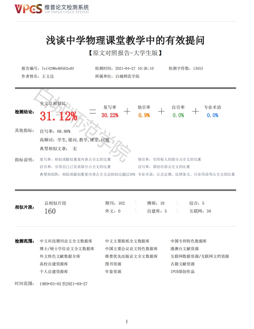 维普论文检测系统VIP PAPER CHECK SYSTEM浅谈中学物理课堂教学中的有效提问【原文对照报告-大学生版】报告编号:7e14298e80562e8f检测时间:2021-04-2710:26:10检测字符数:13453作者姓名:王文达所属单位:白城师范学院全文总相似比复写率他引率自引率专业术语检测结论:31.12%30.22%0.9%0.0%0.0%其他指标:自写率:68.88%高频词:学生,提问,教学,课堂,问题典型相似文章:无指标说明:复写率:相似或疑似重复内容占全文的比重他引率:引用他人的部分占全文的比重自引率:引用自己已发表部分占全文的比重自写率:原创内容占全文的比重典型相似性:相似或疑似重复内容占全文总相似比超过30%专业术语:公式定理、法律条文、行业用语等占全文的比重总相似片段期刊:102博硕:18综合:5相似片段:160外文:0自建库:5互联网:30检测范围:中文科技期刊论文全文数据库中文主要报纸全文数据库中国专利特色数据库博士/硕士学位论文全文数据库中国主要会议论文特色数据库港澳台文献资源外文特色文献数据全库维普优先出版论文全文数据库互联网数据资源/互联网文档资源高校自建资源库图书资源古籍文献资源个人自建资源库年鉴资源IPUB原创作品时间范围:1989-01-01至2021-04-27维普论文检测系统VIP PAPER CHECK SYSTEM原文对照颜色标注说明:■自写片段■复写片段(相似或疑似重复)口引用片段(引用)■专业术语(公式定理、法律条文、行业用语等)学校代码:10206学生学号:061174109白城师范学院毕业论文浅谈中学物理课堂教学中的有效提问On Effective Questioning in middle school physics classroom teaching学生姓名:王文达指导教师:董振江副教授学科专业:物理(师范)所在单位:物理与电子信息学院2021年6月毕业论文原创承诺书1.本人承诺:所呈交的毕业论文《浅谈中学物理课堂教学中的有效提问》,符合《白城师范学院毕业论文(设计)工作实施细则》中的各项要求,是在教师的指导下独立完成,无弄虚作假,抄袭剽窃情况。2.本人在毕业论文中引用他人的观点和研究成果,均在文中加以注释或以参考文献形式列出,对本文的研究工作做出重要贡献的个人和集体均已在文中注明。3.在毕业论文中出现的任何侵犯他人知识产权的行为,由本人承担相应的法律责任。4.本人知道学校关于保存、使用毕业论文的规定,即:按照学校要求提交论文和相关材料的印刷本和电子版本:同意学校保留毕业论文的复印件和电子版本,允许被查阅和借阅:学校可以采用影印、缩印或其他复制手段保存毕业论文,可以公布其中的全部或部分内容。以上承诺的法律结果将完全由本人承担!作者签名2021年6月4日摘要2维普论文检测系统VIP PAPER CHECK SYSTEM课堂提问是中学物理课堂教学的一个关键,课堂提问可以使教师了解学生对于所学知识的掌握情况,还可以调动学生学习的主动性、使学生注意力更加集中,有效的提问更有利于发挥学生的主体地位。本文主要研究在中学物理课堂教学中课堂提问的有效性,并通过分析当前中学物理课堂提问的现状,通过多个方面总结出课堂有效提问的策略,这对于提高中学物理的课堂教学效率和学生对于物理的兴趣起着至关重要的总用。关键词中学物理课堂;有效提问;教学策略AbstractClassroom questioning is a key to middle school physics classroom teaching.Classroomquestioning can make teachers understand students'mastery of knowledge,mobilize students'learninginitiative,make students pay more attention,and effective questioning is more conducive tostudents'dominant position.This paper mainly studies the effectiveness of Classroom Questioning inmiddle school physics classroom teaching,and through the analysis of the current situation ofmiddle school physics classroom questioning,summarizes the strategies of effective classroomquestioning through many aspects,which plays a vital role in improving the efficiency of middleschool physics classroom teaching and students'interest in physics.Keywords:Middle school physics class:Effective questioning:Teaching strategy不要删除行尾的分节符,此行不会被打印目录摘要IAbstractII目录III1绪论11.1选题背景1范学院1.2研究目的与研究意义11.2.1研究目的11.2.2研究意义11.3研究方法21.4研究现状22中学物理课堂教学中提问的有效性32.1有效提问的内涵32.1.1课堂提问32.1.2课堂有效提问32.2课堂有效提问的过程和作用32.2.1课堂有效提问的过程32.2.1课堂有效提问的作用33中学物理课堂教学有效提问的现状及产生原因43.1中学物理课堂教学有效提问的现状43.2中学物理课堂教学有效提问现状的产生原因44中学物理课堂教学有效提问的策略探究54.1提高教师专业素养54.2做好提问前的准备工作54.3选择合适的提问策略54.3.1提问时机恰到好处64.3.2提问对象安排合理64.3.3提问语言表达清晰,目标明确64.3.4提问形式多样化74.3.5有效的反馈评价7结论113