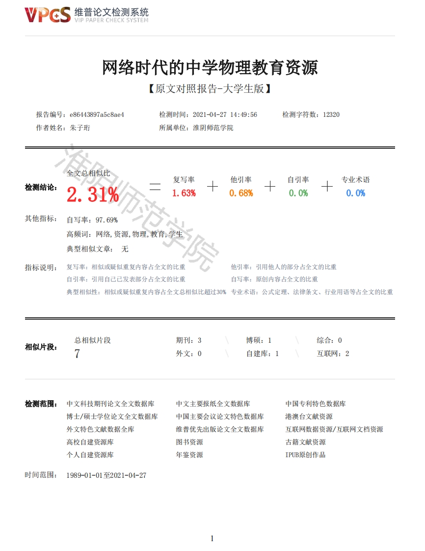维普论文检测系统/IP PAPER CHECK SYSTEM网络时代的中学物理教育资源【原文对照报告-大学生版】报告编号:e86443897a5c8ae4检测时间:2021-04-2714:49:56检测字符数:12320作者姓名:朱子珩所属单位:淮阴师范学院全文总相似比复写率他引率自引率专业术语检测结论:2.31%1.63%0.68%0.0%0.0%其他指标:自写率:97.69%高频词:网络,资源,物理,教育,学生典型相似文章:无指标说明:复写率:相似或疑似重复内容占全文的比重他引率:引用他人的部分占全文的比重自引率:引用自己已发表部分占全文的比重自写率:原创内容占全文的比重典型相似性:相似或疑似重复内容占全文总相似比超过30%专业术语:公式定理、法律条文、行业用语等占全文的比重总相似片段期刊:3博硕:1综合:0相似片段:外文:0自建库:1互联网:2检测范围:中文科技期刊论文全文数据库中文主要报纸全文数据库中国专利特色数据库博士/硕士学位论文全文数据库中国主要会议论文特色数据库港澳台文献资源外文特色文献数据全库维普优先出版论文全文数据库互联网数据资源/互联网文档资源高校自建资源库图书资源古籍文献资源个人自建资源库年鉴资源IPUB原创作品时间范围:1989-01-01至2021-04-27维普论文检测系统VIP PAPER CHECK SYSTEM原文对照颜色标注说明:■自写片段■复写片段(相似或疑似重复)■引用片段(引用)■专业术语(公式定理、法律条文、行业用语等)毕业论文HNU学生姓名朱子珩学号1718170032学院物理与电子电气工程学院专业物理学(乡村师范)题目网络时代的中学物理教育资源指导教师金本喜副教授2021年4月毕业论文独创性声明本人郑重声明:本论文是我个人在导师指导下进行的研究工作及取得的研究成果。本论文除引文外所有实验、数据和有关材料均是真实的。尽我所知,除了文中特别加以标注和致谢的地方外,论文中不包含其他人已经发表或撰写过的研究成果。其他同志对本研究所做的任何贡献均已在论文中作了明确的说明并表示了谢意。作者签名:日期:2021年4月26日摘要:随着科技的进步和新课程改革,网络教育资源的开发与利用程度对物理教学有十分重要的作用。网络资源的开发与利用对学生学习方式的改变起到了积极作用,它优化了物理教师的教学设计,体现了物理的学科特色,2维普论文检测系统VIP PAPER CHECK SYSTEM有助于三维课程目标的实现,且网络教育资源的使用还能使学生更加热爱物理和科学知识,营造一种轻松有趣的课堂气氛。本文主要剖析了网络教育资源在中学物理教学中运用的情况,并探讨其具体运用存在的问题,以及在教学过程中有效利用网络资源的方法。关键词:网络资源,中学物理教学,存在的问题,有效利用Abstract:With the development of science and technology and new curriculum reform,the degreeof exploitation and utilization of network resources plays an important role in physics teaching andit's beneficial to the transformation of students'learning style,optimize the teaching design ofphysics teachers,reflecting the subject characteristics of physics is helpful to the realization ofthe goal of the course.The use of network teaching resources can also make students more studentsmore passionate about physics and science,creating a fun and relaxed classroom atmosphere.Thispaper mainly analyzes the application status of network education resources in the middle schoolphysics teaching,explores its specific application of the existing problems and how to use networkresources effectively in the teaching process.Key words:network resources,physics teaching in middle school,problem,effective utilization目录0引言51网络时代中学物理教育资源61.1概述61.2分类61.3网络资源的国内外比较研究82.1网络教育资源在物理教学中的作用9范学院2中学物理教学中网络资源的作用和应用意义92.2网络教育资源在物理教学中的应用意义103网络资源在中学物理教学中的应用现状和存在的问题113.1网络教育资源在物理教学中的应用现状113.2网络教育资源在物理教学中的问题134如何在中学物理教学中有效应用网络资源144.1学会搜索合适的物理网络教育资源144.2有效利用网络资源进行教学15结论16参考文献17致谢180引言随着网络时代的来临,中学物理的教学模式也随之发生了变化。此前教师用一根粉笔便可以讲完整本书,现在要学会利用一些网络资源对初中物理的教学内容和教学方式进行补充和创新。合理利用网络教育资源可以帮助广大物理教师积累一定的教学经验,也可以帮助中学生稳步提升物理能力。教育乃一国之本,作为新时代物理教师在教育工作中要顺应网络时代的发展,紧跟社会科技的脚步,提高网络时代中学物理教育资源的实际利用率,提升教育工作者的工作效率和学生的学习能力,从而全方位地提升各地区的教育水平,进而推进社会的发展,以此来形成一个良性循环。从时代发展的趋势来看,教育的模式不应该是原地踏步毫无创新的。因此身为一名物理教师,首先应当学会创新,思考如何合理利用网络教育资源来激起学生对物理的学习兴趣是很有必要的。在课堂教学和网络教育资源融合的过程中,更要重视网络教育资源、教学目标和教学过程的粘合度,以便达到《初中物理新课程标准》的要求,提高网络教育资源的利用程度[1]。而对于学生来说,互联网的出现使他们在搜索资料方面又多了一大途径,可以在课后随时随地的查找到感兴趣的知识,极大的促进了学生的个性发展。但一个事物的好坏两面总是相伴出
