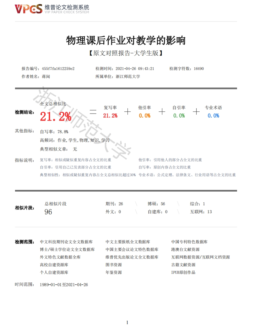 维普论文检测系统/IP PAPER CHECK SYSTEM物理课后作业对教学的影响【原文对照报告-大学生版】报告编号:455f7fa1612259e2检测时间:2021-04-2609:43:21检测字符数:16490作者姓名:蒋闽所属单位:浙江师范大学全文总相似比复写率他引率自引率专业术语检测结论:21.2%21.2%0.0%0.0%0.0%其他指标:自写率:78.8%高频词:作业,学生,物理,知识,学习典型相似文章:无指标说明:复写率:相似或疑似重复内容占全文的比重他引率:引用他人的部分占全文的比重自引率:引用自己已发表部分占全文的比重自写率:原创内容占全文的比重典型相似性:相似或疑似重复内容占全文总相似比超过30%专业术语:公式定理、法律条文、行业用语等占全文的比重总相似片段期刊:26博硕:56综合:1相似片段:96外文:0自建库:0互联网:13检测范围:中文科技期刊论文全文数据库中文主要报纸全文数据库中国专利特色数据库博士/硕士学位论文全文数据库中国主要会议论文特色数据库港澳台文献资源外文特色文献数据全库维普优先出版论文全文数据库互联网数据资源/互联网文档资源高校自建资源库图书资源古籍文献资源个人自建资源库年鉴资源IPUB原创作品时间范围:1989-01-01至2021-04-26维普论文检测系统VIP PAPER CHECK SYSTEM原文对照颜色标注说明:■自写片段■复写片段(相似或疑似重复)口引用片段(引用)■专业术语(公式定理、法律条文、行业用语等)浙江师范本科毕业设计(论文)(2021届)题目:物理课后作业对教学的影响学院:物理与电子信息工程学院专业:物理师范班级:物理172作者姓名:蒋闽学号:201730190203指导老师:蔡铁权职称:教授成绩:目录摘要:1英文摘要.11引言22相关概念32.1物理核心素养32.2作业43理论基础43.1建构主义学习理论43.2认识迁移理论53.3多元智能理论64高中物理课后作业调查及分析64.1问卷64.1.1调查对象62维普论文检测系统VIP PAPER CHECK SYSTEM4.1.2调查方法64.1.3问卷设计74.2调查结果的统计、分析与总结74.2.1学生问卷分析74.2.2教师访谈分析204.2.3调查总结215高中物理课后作业的改进措施225.1提高作业质量225.2创新作业类型方式225.3加强作业完成的监督、批改和反馈236总结23致谢24物理课后作业对教学的影响物理与电子信息工程学院物理师范专业蒋闽(201730190203)指导老师:蔡铁权(教授)摘要:本文通过问卷,调查了高一学生和老师对物理课后作业的想法和意见,并对学生物理课后作业的情况进行了收集,分析了学生物理课后作业的存在的问题和老师教学中存在的问题,并提出了自己的意见,对提高学生的物理核心素养提供了途径,对课后作业的优化也提出了自己的看法。关键词:物理课后作业:物理核心素养;作业优化The influence of physics homework on teachingTutor:Cai Tiequan (Professor)(School of Physics and Electronic Information Engineering,Physics Normal Major,Jiang Min201730190203)Abstract:Through questionnaire,this paper investigated fresh students of high middle schooland teachers of physics homework ideas and opinions,and the situation of physics homework to thestudent collects,analyzes the problems existing in the students physics homework and the problemsthat exist in the teacher teaching,and puts forward his own opinions,provides a way to improve thestudents'physical core literacy.Also put forward their own views on the optimization of homework.Key words:physics homework:Physics core literacy:Operation optimization1引言学生是社会主义接班人,要想学生德智体美劳得到全面发展,有正确的教育理念尤为重要。而教育的核心是课程,教师通过课程来组织教学活动、达到教育目的。在课程上可见学科教育思想和教育理念。为了适合我国国情和社会的发展,高中的课程改革是不停歇的。为了提高教师队伍的整体水平,提高我国基础教育的质量,国务院办公厅发布了指导意见,将对普通高中课程全面实施改革,推进人才培养模式的变革。物理学科是普通高中开设的一门自然科学领域的基础学科,物理学科的教育旨在提升学生的物理核心素养,使人类科学事业得到发展和传承,促进社会进步。从2020年新修订的2017年版本的普通高中物理课程标准可以看到,学生学习该学科后所必需的课程设置应该达到学业水平质量的标准划分更加明确和清晰。从物理核心素养的角度下来看,作业是基于物理课程标准进行编写的,学生完成作业是落实物理课程标准、提升学生物理学科核心素养的重要途径。浙江省在2017年进行高考改革,从以往的“文理分科”到“三加三”,考生统考语数英,再自主选择3门选考科目作为高考科目。如今,浙江省高考新政实施的将近四年,选择物理科目作为自己选考科目的人数仍然较少。在2017年年底,为了防止许多学生弃选物理状况发生,浙江省对选考物理科目有保护机制(浙江省选考没有达到6.5万人,也按照6.5万人赋分。例如有一万人物理选考,那么按照1%满分的赋分比例,前650名都是100分)。在2020年,“浙江高考300分上本科”的热门话题(选择物理总分279分就能上本科)也引起了广泛的争议。学生们对物理科目爱恨有加,对是否选择物理科目也犹豫不决。教师的教学环节包括备课、授课、批改、辅导和测评。学生的学习环节包括预习、听课、复习、考试和作业。3