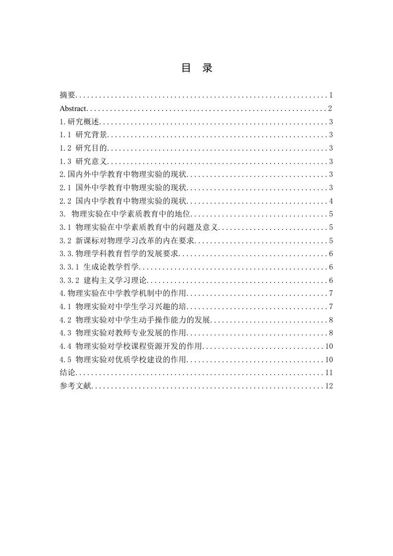 目录Abstract......1.1研究背景.1.2研究目的.2.国内外中学教育中物理实验的现状,32.1国外中学教育中物理实验的现状.2.2国内中学教育中物理实验的现状43.物理实验在中学素质教育中的地位...3.1物理实验在中学素质教育中的问题及意义3.2新课标对物理学习改革的内在要求3.3.物理学科教育哲学的发展要求.3.3.1生成论教学哲学...3.3.2建构主义学习理论...64.物理实验在中学教学机制中的作用....74.1物理实验对中学生学习兴趣的培.....74.2物理实验对中学生动手操作能力的发展84.3物理实验对教师专业发展的作用.4.5物理实验对优质学校建设的作用..10物理实验在在中学素质教育中的地位和作用摘要物理学课程实践知识的探究活动类似于在科学探究活动的人类社会,通过学校教育情景下的物理科学实验和实践,来推动科学探究和研究。根据新课程标准,在物理实验中促进中学生自我学习,加强深化物理学的教学,促进中学生的全面和谐发展,提高适应能力,提升中学生的综合素质。本文主要讨论了物理实验的重要性及作用,结合国内外现状以及教育哲学的理论基础,充分体现物理实验的地位和作用,让教师和中学生共同的研究和实践活动,充分体会探究物理实验的精神,在物理实验中积累经验知识,培养中学生的科学探究精神,培养实事求是和追求物理科学素养真理的精神。关键词物理教学:物理实验:地位:Physics Experiment status and role in quality education inmiddle schoolMajor:Class:Name:Instructor:Abstract Practical Course in Physics inquiry of knowledge in the scientific inquiryactivity similar to human society through scientific experiments and practice of schoolphysical education scenarios,to promote scientific inquiry and research.Under thenew curriculum standards,high school students in physics experiment to promoteself-learning,deepen teaching physics strengthen and promote the full andharmonious development of high school students,improve the ability to adapt,improve the overall quality of high school students.This paper discusses theimportance and role of physical experiments,combined with the status quo at homeand abroad as well as the theoretical basis of educational philosophy,fully reflect thestatus and role of physical experiments,so that common research and practicalactivities for teachers and high school students,to fully appreciate the spirit of inquiryphysics experiment accumulated experience and knowledge in physics experiments,cultivate the spirit of scientific inquiry Students'cultivate the spirit of seeking truthfrom facts and the pursuit of physical science literacy truth.Keywords Physics teaching physics experiment status2