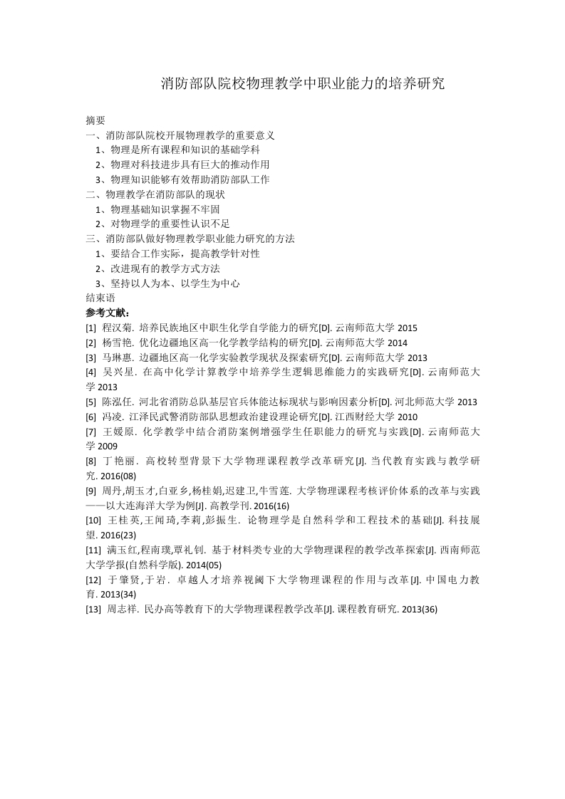 消防部队院校物理教学中职业能力的培养研究摘要一、消防部队院校开展物理教学的重要意义1、物理是所有课程和知识的基础学科2、物理对科技进步具有巨大的推动作用3、物理知识能够有效帮助消防部队工作二、物理教学在消防部队的现状1、物理基础知识掌握不牢固2、对物理学的重要性认识不足三、消防部队做好物理教学职业能力研究的方法1、要结合工作实际,提高教学针对性2、改进现有的教学方式方法3、坚持以人为本、以学生为中心结束语参考文献:[1]程汉菊.培养民族地区中职生化学自学能力的研究D].云南师范大学2015[2]杨雪艳.优化边骚地区高一化学教学结构的研究D].云南师范大学2014[3]马琳惠.边疆地区高一化学实验教学现状及探索研究D].云南师范大学2013[4吴兴星.在高中化学计算教学中培养学生逻辑思维能力的实践研究[D].云南师范大学2013[5]陈泓任.河北省消防总队基层宫兵体能达标现状与影响因素分析D].河北师范大学2013[6)冯凌.江泽民武警消防部队思想政治建设理论研究D].江西财经大学2010[王媛原.化学教学中结合消防案例增强学生任职能力的研究与实践D].云南师范大学2009[8]丁艳丽.高校转型背景下大学物理课程教学改革研究).当代教育实践与教学研究.2016(08)[9周丹,胡玉才,白亚乡,杨桂娟,迟建卫,牛雪莲.大学物理课程考核评价体系的改革与实践一一以大连海洋大学为例.高教学刊.2016(16)[10]王桂英,王闻琦,李莉,彭振生.论物理学是自然科学和工程技术的基础).科技展望.2016(23)[11)满玉红,程南璞,覃礼钊.基于材料类专业的大学物理课程的教学改革探索.西南师范大学学报(自然科学版).2014(05)[12]于肇贤,于岩.卓越人才培养视阈下大学物理课程的作用与改革).中国电力教育.2013(34)[13)周志祥.民办高等教育下的大学物理课程教学改革U).课程教育研究.2013(36)