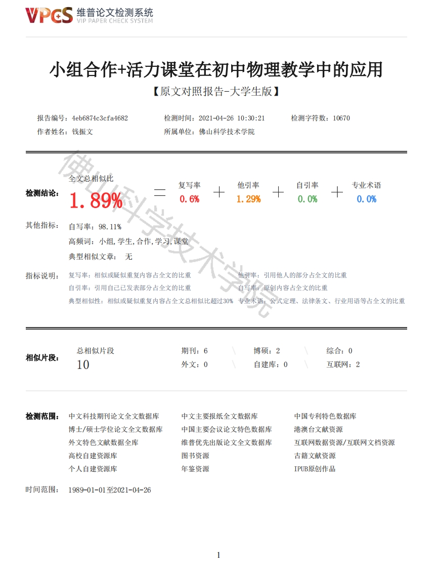 维普论文检测系统/IP PAPER CHECK SYSTEM小组合作+活力课堂在初中物理教学中的应用【原文对照报告-大学生版】报告编号:4eb6874c3cfa4682检测时间:2021-04-2610:30:21检测字符数:10670作者姓名:钱振文所属单位:佛山科学技术学院全文总相似比复写率他引率自引率专业术语检测结论:1.89%0.6%1.29%0.0%0.0%其他指标:自写率:98.11%高频词:小组,学生,合作,学习,课堂典型相似文章:无指标说明:复写率:相似或疑似重复内容占全文的比重引用他人的部分占全文的比重自引率:引用自己已发表部分占全文的比重自写率:原创内容占全文的比重典型相似性:相似或疑似重复内容占全文总相似比超过30%专业术语:公式定理、法律条文、行业用语等占全文的比重总相似片段期刊:6博硕:2综合:0相似片段:10外文:0自建库:0互联网:2检测范围:中文科技期刊论文全文数据库中文主要报纸全文数据库中国专利特色数据库博士/硕士学位论文全文数据库中国主要会议论文特色数据库港澳台文献资源外文特色文献数据全库维普优先出版论文全文数据库互联网数据资源/互联网文档资源高校自建资源库图书资源古籍文献资源个人自建资源库年鉴资源IPUB原创作品时间范围:1989-01-01至2021-04-26维普论文检测系统VIP PAPER CHECK SYSTEM原文对照颜色标注说明:■自写片段■复写片段(相似或疑似重复)口引用片段(引用)■专业术语(公式定理、法律条文、行业用语等)Foshan University本科生毕业论文小组合作+活力课堂在初中物理教学中的应用学院:物理与光电工程学院专业:物理学(师范)学号:20170280128学生姓名:钱振文指导教师:谭鹏副教授二O二一年五月摘要近年来,由于新的课程改革取得进展,形成了团队合作的学习模式。基于研究小组合作学习模式与中学物理教学的衔接方法,我在2021年到莘村中学进行见习和实习。在这段时间里,我体验到了“小组合作+”活力课堂在莘村中学的教学实践。论文先从“小组合作+”活力课堂理念和理论基础开始,合作学习模式加强了学生的交流,促进学生对知识的疏导。现代社会需要合作才能,而合作学习将合作学习理论具体化,使学生能够更加好地适应社会发展。在这个过程中,我们做了很多事情。首先,我们观察了莘村中学教学和夕会等的开设。其次,明确课堂上合作学习的具体方法,包括定期的新课和复习课。最后,进行调查问卷和提出改进措施。总之,小组合作对学生的关注度高。当然,小组合作学习模式和其他学习模式的推广还有很长一段路要走,我们需要更深一层的、广泛的研究和实践教育。关键词:初中物理教学、教学案例、小组合作学习AbstractIn recent years,due to the progress of the new curriculum reform,a team learning model has2维普论文检测系统VIP PAPER CHECK SYSTEMbeen formed.Based on the research group cooperative learning mode and the connection method ofmiddle school physics teaching,I went to Xincun middle school for probation and practice in 2021.During this period,I experienced the teaching practice of "group cooperation +"dynamic classroomin Shencun middle school.The paper starts with the concept and theoretical basis of "group cooperation +vitalityclassroom,and the cooperative learning mode strengthens the communication between students andpromotes the students'knowledge guidance.Modern society needs cooperative ability,and cooperativelearning makes cooperative learning theory concrete,so that students can better adapt to socialdevelopment.In the process,we have done a lot.First,we observed the opening of Xincun middle schoolteaching and the evening meeting.Secondly,the specific methods of cooperative learning in classare defined,including regular new classes and review classes.Finally,the questionnaire andimprovement measures are put forward.In a word,group cooperation pays more attention to students.Of course,there is still a longway to go for the promotion of group cooperative learning mode and other learning modes.We needdeeper and extensive research and practical education.Key words:junior high school physics teaching,teaching cases,group cooperative learning目录1引言31.1研究背景和意义31.2研究的现状41.3研究的方法42“小组合作+”活力课堂的理论基础52.1“小组合作+”活力课堂理念52.2教学互动理论5学技术学院2.3主体性教育理论52.4合作学习理论53“小组合作+”在初中物理教学中的应用63.1“小组合作+”活力课堂设计63.2“小组合作+”活力课堂特点63.3构建合作学习小组63.4“小组合作+”活力课堂保障措施73.5“小组合作+”活力课堂好课标准83.6小组的评价机制84“小组合作+”活力课堂的教学案例94.1“小组合作+”活力课堂五个环节94.2“小组合作+”活力课堂的优点95结论及尚存在的问题105.1小组合作学习的经验总结105.2小组合作学习调查问卷的分析105.3小组合作学习存在的问题13参考文献14致谢15小组合作+活力课堂在初中物理教学中的应用姓名:钱振文学号:20170280128班级:17物理学(师范)1引言1.1研究背景和意义3