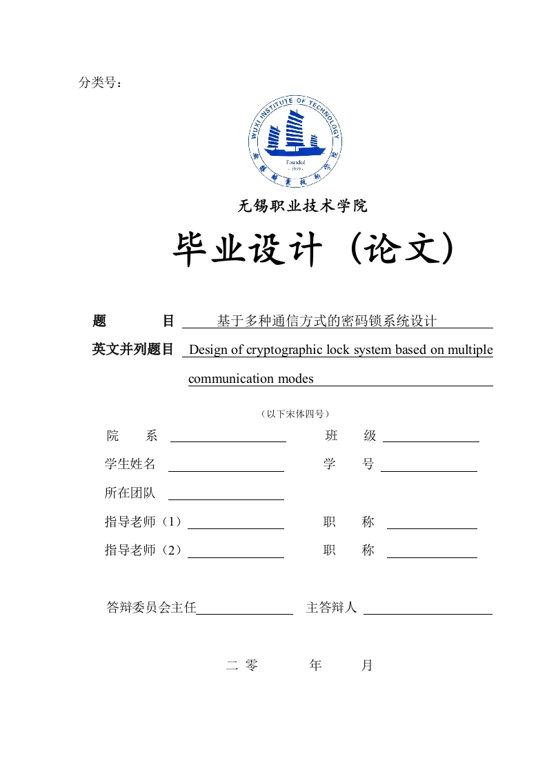 分类号:无锡职业技术学院毕业设计(论文)题目基于多种通信方式的密码锁系统设计英文并列题目Design of cryptographic lock system based on multiplecommunication modes(以下宋体四号)院系班级学生姓名学号所在团队指导老师(1)职称指导老师(2)职称答辩委员会主任主答辩人二零年月目录一、绪论…(一)调查目的3(二)调查范围22(二)系统构成部分…31、主机的主要组成部分…32、从机的主要组成部分…4三、电路硬件的构造.…4(一)控制模板的设计(二)红外发射装置和红外接收装置的设计.4(三)显示器电路的设计(四)电磁锁电路的设计(五)报警器的设计,(六)键盘的设计10四、系统的组成…(一)系统组成12(二)硬件电路.….13五、软件的开发…(一)主机软件运用.(三)从机软件运用.14五、结论…参考文献…..16无锡职业技术学院毕业设计(论文)说明书基于多种通信方式的密码锁系统设计摘要:本论文主要研究的是一个以C51单片机为核心的密码镀设计。系统的硬件电路主要是由主要机电路和从要机电路组成。其中,主机电路主要由主单片机、红外线接收电路、液品显示器电路、按键控电路以及报警线电路组成:从要机电路是由从单片机、红外线发射电路和按键线电路等组成。本设计的可以实现从密码输入、密码的显示、开一些镀、要事报警。本设计方素合理真切、实用性高、安全性能较好,可以在工农业技术、通讯技术,家用的密码关键词:单片机密码镀,红外线,蓝牙Design of cryptographic lock system based onmultiple communication modesAbstract:This paper mainly studies the design of a cryptographic lock based on C51 single chip computer.The hardwarecircuit of the system is mainly composed of the main machine circuit and the slave machine circuit.Among them,the hostcircuit is mainly composed of single chip computer,infrared receiving circuit,LCD circuit,key control circuit and alarm linecircuit;the slave circuit is composed of single chip computer,infrared transmitting circuit and key line circuit.This designcan realize password input,password display,unlock some locks and alarm about important matters.The design scheme isreasonable,practical and safe.It can be used in many fields,such as industrial and agricultural technology,communicationtechnology,home password lock and door lock system,to improve the utilization rate and to facilitate people's life.Keywords:Single Chip Microcomputer Password Lock,Infrared Ray,Bluetooth一、绪论(一)调查目的每天的生活日常中,住宅里与有些部门的安全防范、某些单位的文件档案类、财务报表和某些个人资料的保存都是以加把锁的办法来保护这些问题。假如使用传统的钥匙来开锁,我们都常常需要携带很多把钥匙,叽里咣啷的,使用极不方便,而且钥匙丢失后安全性即大打折扣。所以某些具有防盗声报警声等等功能的电子类密码锁替代类的密码产量变少、安全性能差的普通式密码锁已是必然趋势的方向。随着科学技术的不断发展不断进步,人们开始对对日常生活中的一些安全保险东西的要求越来越高,越来越强。所以为了满足人们对一些锁的使用技能,增加它的某些安全技能,用高强的密码来代替钥匙的所谓保护技能的密码锁从中开始发扬光大。“保护”锁所谓的密码锁基本上具有安全性能高、生产成本比较低、功能效率消耗的慢、极其容易操作、只要所谓的记住你所涉及的密码就能打开锁这些优点,所以使用的方向尤其多。(二)调查范围目前我们使用的电器密码锁大多数是在基于单片机的技术,是在以单片机为基础的第1页共21页