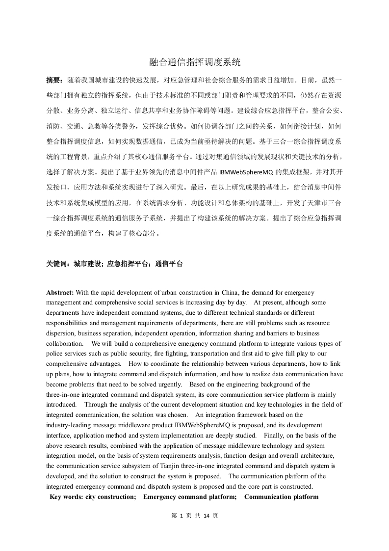 融合通信指挥调度系统摘要:随着我国城市建设的快速发展,对应急管理和社会综合服务的需求日益增加。目前,虽然一些部门拥有独立的指挥系统,但由于技术标准的不同或部门职责和管理要求的不同,仍然存在资源分散、业务分离、独立运行、信息共享和业务协作障碍等问题。建设综合应急指挥平台,整合公安、消防、交通、急救等各类警务,发挥综合优势。如何协调各部门之间的关系,如何衔接计划,如何整合指挥调度信息,如何实现数据通信,己成为当前亟待解决的问题。基于三合一综合指挥调度系统的工程背景,重点介绍了其核心通信服务平台。通过对集通信领域的发展现状和关键技术的分析,选择了解决方案。提出了基于业界领先的消息中间件产品IBMWebSphereMQ的集成框架,并对其开发接口、应用方法和系统实现进行了深入研究。最后,在以上研究成果的基础上,结合消息中间件技术和系统集成模型的应用,在系统需求分析、功能设计和总体架构的基础上,开发了天津市三合一综合指挥调度系统的通信服务子系统,并提出了构建该系统的解决方案。提出了综合应急指挥调度系统的通信平台,构建了核心部分。关键词:城市建设;应急指挥平台:通信平台Abstract:With the rapid development of urban construction in China,the demand for emergencymanagement and comprehensive social services is increasing day by day.At present,although somedepartments have independent command systems,due to different technical standards or differentresponsibilities and management requirements of departments,there are still problems such as resourcedispersion,business separation,independent operation,information sharing and barriers to businesscollaboration.We will build a comprehensive emergency command platform to integrate various types ofpolice services such as public security,fire fighting,transportation and first aid to give full play to ourcomprehensive advantages.How to coordinate the relationship between various departments,how to linkup plans,how to integrate command and dispatch information,and how to realize data communication havebecome problems that need to be solved urgently.Based on the engineering background of thethree-in-one integrated command and dispatch system,its core communication service platform is mainlyintroduced.Through the analysis of the current development situation and key technologies in the field ofintegrated communication,the solution was chosen.An integration framework based on theindustry-leading message middleware product IBMWebSphereMQ is proposed,and its developmentinterface,application method and system implementation are deeply studied.Finally,on the basis of theabove research results,combined with the application of message middleware technology and systemintegration model,on the basis of system requirements analysis,function design and overall architecture,the communication service subsystem of Tianjin three-in-one integrated command and dispatch system isdeveloped,and the solution to construct the system is proposed.The communication platform of theintegrated emergency command and dispatch system is proposed and the core part is constructed.Key words:city construction;Emergency command platform;Communication platform第1页共14页录1.指挥调度发展中存在的问题…311指挥调度的发展.31.2存在的问题32.1平台搭建2.系统应用…2.1应用方式2.2技术选型…2.3产品选型3.数字录音子系统31系统功能…3.2方案设计…4.指挥调度子系统…4.1系统功能104.2方案设计.…105.结语…参考文献…第2页共14页引言统一通信是计算机技术与传统通信技术相结合的一种新型通信方式,正在蓬勃发展。目前,统一通信的主要发展趋势是移动化、视频化、云协作等。统一通信的核心思想是随时随地通过任何设备进行自由通信。设备的自由通信使移动性成为现实。在统一通信的基础上,结合视频、位置和用户基本信息,可以很好地扩展系统的调度手段。在此背景下,移动可视统一通信指挥系统应运而生、发展完善。1.指挥调度发展中存在的问题1.1指挥调度的发展通信指挥调度一直是各集团用户和业务部门信息发展的重点,是当前战场信息条件下战斗胜利的重要保障。它涉及战场信息采集、信号传输、指挥中心指挥调度、军事信息报告、通信和指挥传递等多个环节。针对这一重要命题,有一些成功的实践和应用总结,如基于视频的指挥调度系统1],总结了视频在指挥调度中的作用和应用形式:文献[2]讨论了战术互联网技术在指挥调度中的应用,以及pu它提出了战术互联网的基本形式:文献3]借鉴了外国军队的经验。重点阐述了移动应用技术对提高指挥调度灵活性的意义。不难看出,可视化、移动性和网络连接已成为指挥和调度的重要技术手段。1.2存在的问题现有指挥调度系统迫切需要解决以下问题:(1)安全问题安全是指挥调度系统中的关键问题。如何使系统安全有效地工作是不言而喻的。不仅要考虑终端用户的访问控制,还要考虑数据传输和数据本身的安全性,以及移动设备的安全性。(2)多样性一些现有的指挥调度系统只有语音调度,或者需要与独立的视频监控系统对接。各种信息不足,信息形式单调。(3)实现多网统一通信、多设备互联互通第3页共14页