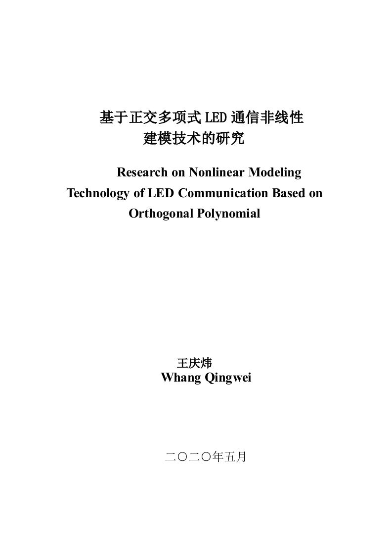 基于正交多项式LD通信非线性建模技术的研究Research on Nonlinear ModelingTechnology of LED Communication Based onOrthogonal Polynomial王庆炜Whang Qingwei基于正交多项式LED通信非线性建模技术的研究摘要近年来,被称为“绿色照明”的发光二极管技术正在迅速发展。LED(Light-emitting Diode,发光二极管)通信或可见光通信是一个有前途的领域,并且越来越受到研究的关注。LED是LED通信中非线性的主要来源:通过利用存储多项式和一系列相关补偿措施使得LED非线性建模成功。但是存储多项式系数的估计值存在数值不稳定性,导致建模不准确并且优化非线性性能较差,因此需要对非线性进行有效建模,并通过预失真或后失真技术来优化非线性,以避免通信性能严重下降。本文的主要工作内容如下:通过定性分析和仿真,研究LED通信接收前端的输出噪声与非线性失真情况,指出非线性失真才是制约LED通信中的最主要因素。首先提出了一种基于正交多项式的非线性建模技术,利用带有脉冲幅度调制(PAM)信号的LED通信,寻求有效的LED非线性建模和适当的非线性优化技术,以优化LED通信中的非线性和减少信道中的ISI(Inter-Symbol Interference,码间干扰)失真影响。其次视距LED通信的一个困难在于:多径色散会导致高数据速率下的ISI影响。我们扩展了基于正交多项式的LED建模技术的工作,并考虑了由于LED记忆效应和多径色散导致的LED非线性和ISI失真。提出了一种基于正交多项式技术的LED非线性和复合ISI通道联合估计方法。使得ISI光通道和具有记忆效应的LED非线性可以被共同被估计和优化处理:应用低复杂度的频域均衡来消除由于LED记忆效应和光学ISI信道而造成的失真影响,最后运用后失真器优化无记忆效应的LED非线性:仿真结果表明所提出的技术可以有效地处理LED的非线性和ISI失真效应。关键词:发光二极管(LED)通信;非线性;记忆多项式;正交多项式;符号间干扰(ISI)失真AbstractIn recent years,light-emitting diodes (LEDs)technology,known as"GreenIllumination",is growing rapidly.LED communications,or visible light communicationsis a promising field and is getting more and more research focus.LED is the majorsource of nonlinearity in LED communications,and the nonlinearity needs to bemodelled effectively and thereby mitigated through pre-distortion or post-distortion toavoid severe degradation of communication performance.The primary objectives of this thesis are to develop effective and efficient LEDnonlinearity modelling and proper nonlinearity mitigation as well as signal detectiontechniques to mitigate the nonlinear and inter-symbol interference (ISD)distortions inLED communications.Memory polynomial is often used for LED nonlinearity modelling and mitigation inthe literature.However,the estimation of memory polynomial coefficients suffers fromnumerical instability,resulting in inaccurate modelling and poor performance innonlinearity mitigation.Firstly,we focus on LED nonlinearity modelling and mitigationusing memory polynomials.To solve the above numerical instability problem,wepropose an alternative LED nonlinearity modelling technique based on orthogonalpolynomials.For the first time,we develop a special set of orthogonal polynomial basisfor LED communications with pulse amplitude modulation (PAM)signalling for LEDnonlinear system modeling.Due to the use of the orthogonal polynomials,the new basismatrix for the nonlinear model is quasi-orthogonal,which avoids the numericalinstability problem during the estimation of the polynomial coefficients,and leads tolow complexity and accurate LED nonlinearity modeling.Furthermore,a pre-distorter isemployed to mitigate the LED nonlinearity.Simulations show that the proposedtechnique significantly outperforms the conventional memory polynomial basedtechniques.Secondly,another challenge in indoor LED communications is that multipathdispersion can lead to ISI at high data rates.We extend our work on orthogonalpolynomial based LED modelling technique and consider both the LED nonlinearityand ISI distortions due to LED memory effect and multipath dispersion.A jointestimation approach to LED nonlinearity and composite ISI channel based onorthogonal polynomial technique is proposed.Then,we design a receiver which consistsof three modules,a nonlinearity and composite channel estimator,a frequency domain