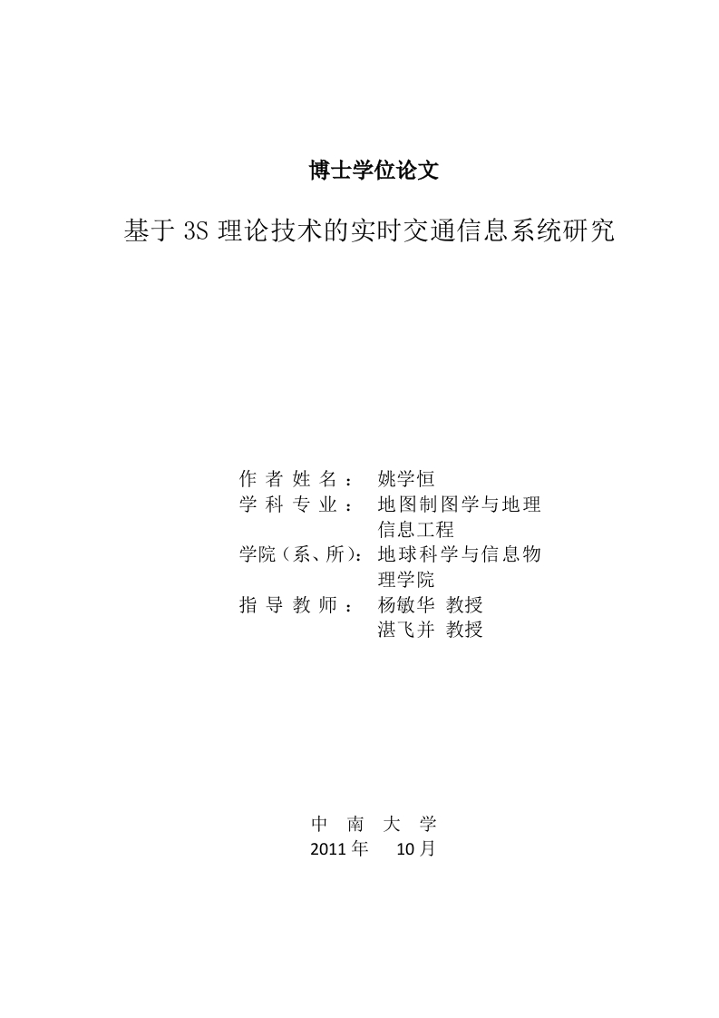 博士学位论文基于3S理论技术的实时交通信息系统研究作者姓名:姚学恒学科专业:地图制图学与地理信息工程学院(系、所):地球科学与信息物理学院指导教师:杨敏华教授湛飞并教授中南大学2011年10月分类号VDC密级博士学位论文基于3S的实时交通信息系统研究Research on Real-Time Traffic Information SystemBased on 3S作者姓名:姚学恒学科专业:地图制图学与地理信息工程学院(系、所):地球科学与信息物理学院指导教师:杨敏华教授湛飞并教授论文答辩日期答辩委员会主席中南大学年月原创性声明本人声明,所呈交的学位论文是本人在导师指导下进行的研究工作及取得的研究成果。尽我所知,除了论文中特别加以标注和致谢的地方外,论文中不包含其他人已经发表或撰写过的研究成果,也不包含为获得中南大学或其他单位的学位或证书而使用过的材料。与我共同工作的同志对本研究所作的贡献均已在论文中作了明确的说明。作者签名:日期:年月日学位论文版权使用授权书本人了解中南大学有关保留、使用学位论文的规定,即:学校有权保留学位论文并根据国家或湖南省有关部门规定送交学位论文,允许学位论文被查阅和借阅:学校可以公布学位论文的全部或部分内容,可以采用复印、缩印或其它手段保存学位论文。同时授权中国科学技术信息研究所将本学位论文收录到《中国学位论文全文数据库》,并通过网络向社会公众提供信息服务。作者签名:导师签名日期:年月日