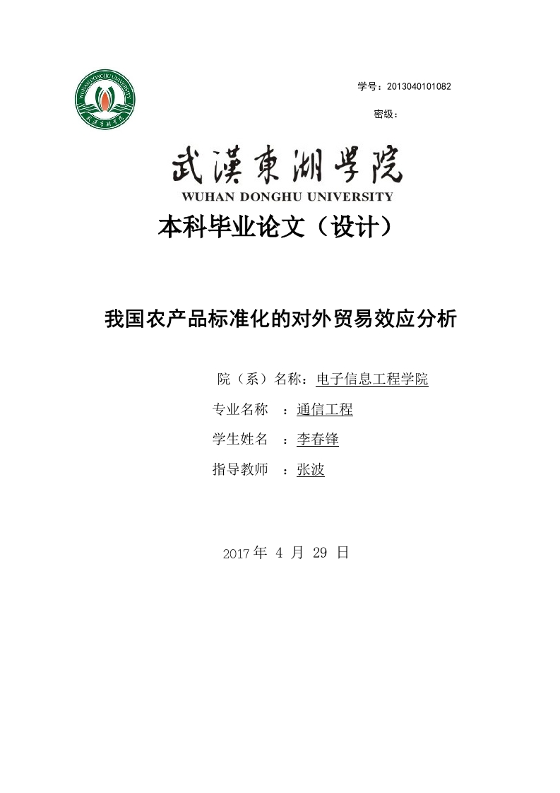 学号:2013040101082密级:WUHAN DONGHU UNIVERSITY本科毕业论文(设计)我国农产品标准化的对外贸易效应分析院(系)名称:电子信息工程学院专业名称:通信工程学生姓名:李春锋指导教师:张波2017年4月29日郑重声明本人郑重声明:所呈交的论文是本人在导师的指导下独立进行研究所取得的研究成果。除了文中特别加以标注引用的内容外,本论文不包含任何其他个人或集体己经发表或撰写的成果作品。对本文的研究做出重要贡献的个人和集体,均已在文中以明确方式标明。本人完全意识到本声明的法律后果由本人承担。论文作者签名:李春锋日期:2017年4月29日基于MATLAB的通信原理实验平台设计摘要基于原始虚拟实验平台,本文对JMatLink Java和MATLAB数字通信虚拟实验平台进行了设计和分析,虚拟平台的目标是为了解决教学当中出现的问题,促进软件开发成本的下降,促进教学目标得到实现,而且实验平台包括了服务器以及客户端,促进计算机性能的提升,而且使用的XL技术保存组件,MATLAB作为背景,对计算机的仿真能力进行分析,客户端使用的Java Applet这种程序,可以通过组件技术对设备组件进行分析,平台的独立性比较好,而且软件也同样具有可扩展性,实验的结果可以进行动态显示,以平台为基础提出了PCM实验,分析了平台组件开发的过程以及操作机制,通过这个举例,积极的发挥了平台的可行性以及可操作性,实用价值比较高。关键词:虚拟试验平台;MATLAB:JMatLink;Java Bean组件