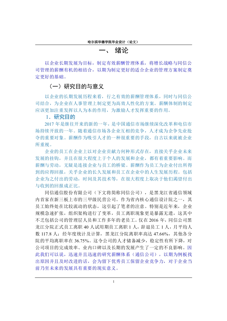 哈尔滨华德学院毕业设计(论文)一、绪论以企业长期发展为目标,制定有效薪酬管理体系,将增长战略与同信公司管理的薪酬有机的相结合,以期为制定更好的适合企业的管理方案制定奠定更好的基础。(一)研究目的与意义以企业的长期发展历程来看,行之有效的薪酬管理体系,同时与同信公司结合,为企业在人事管理上制定更为高效人性化的方案。薪酬体制的制定应该更加注重发挥以人为本的作用,为激励人才发挥重要的作用。1.研究目的2017年是继往开来的新的一年,是中国通信市场继续深化改革和电信市场持续开放的一年。随着通信市场各企业互相的竞争,人才成为企争先业抢夺的重要对象。薪酬作为吸引人才的一种很重要的手段,自古以来就被企业所重视。企业的员工在企业上以对企业贡献力何种形式存在,直接关乎企业未来发展的挂钩,并且在很大程度上于个人的发展和企业,都有着重要影响。而薪酬与劳动,无疑是连接企业与员工的桥梁。薪酬作为员工为企业付出所得到的应得回报,关乎企业的长久发展和员工在企业中的人生发展历程。包括企业为之付出的劳动,时间及其技术等,在很大程度上取决于他们渴望付出与收到的回报成正比。同信通信股份有限公司(下文将简称同信公司),是黑龙江省通信领域内首家在新三板上市的三甲级民营公司。作为省内核心通信设计院之一,其员工始终处在比较流动的状态,这引起了笔者的注意。特别是近年来,企业规模急速扩张,组织架构进行了变革,员工离职现象更是暴露无遗,这其中不乏包括公司的管理层人员和工作多年的老员工。仅在2016年,同信公司黑龙江分院正式员工离职40人试用期员工离职1人,辞退员工1人,月平均人数117.8人:经年度统计及计算,黑龙江分院离职率高达47.66%,其他各分院的平均离职率在36.75%。这令公司的人才储备减少,稳定性有所下降,对公司项目的完成效率、业内口碑以及长期的发展产生了一定的不良影响。因此我们可以说,迅速并且迅速的研究薪酬体系(通信公司),以期为例板找出原因并且及时改进的话,会为留下优秀员工保留企业竞争力,对于企业当前乃至未来的发展具有重要的现实意义。哈尔滨华德学院毕业设计(论文)本文试图从通信公司开始说起,浅谈并且分心它所运用得薪酬体系及其目前发展的有待改进的地方,以期不断改革并且发展。使之能够真正适用于公司的增长战略需求,对员工产生实实在在的激励作用,吸引有价值的员工,从而增强企业在省内同行业中的竞争力与影响力,也希望为通信行业公司薪酬体系的设计提供案例分析依据。2.研究意义现代企业人力资源管理的核心制度体系是薪酬体系,一个薪酬体系的好与坏直接关系到员工工作的积极性与否,薪酬体系的制定科学合理与否更是直接关系到企业的未来发展方向和高度。同信公司的管理人员薪酬体系为本次考试的模版,以贴近现实的角度分析观察,找出目前在人员管理上存在的相关问题并且群策群力找出相应的解决方法,以期消灭不良影响。指出如何对改进后的体系进行保障,发挥薪酬对员工应有的激励性作用,使员工对薪酬的合理期望得到满足,增强其对公司的满意度与信任感,调动公司员工的主动性与创造性,促进员工的专业技能与素质都有所提升,实现企业的发展愿景,有利于企业效益和员工发展的比翼双飞,为劳动者塑造良好的劳动氛围和环境。从理论意义上来说,通过本文的研究,能够为通信行业的其他企业在设计薪酬体系时提供参考,令同行业内的其他公司避免出现本公司之前出现的问题,少走弯路。因此,深入研究同信公司管理人员薪酬体系,找出相应的解决措施对我国企业具有重要的理论和现实意义。(二)相关概念界定想要研究同信公司管理人员的薪酬体系,首先要知道管理人员、薪酬体系、薪酬设计等相关概念。1.管理人员的概念在对企业的管理中,管理人员被认定为非常重要的企业拼图存在,其发挥着指挥协调完成预定任务的关键作用,他们在企业中占据鳌头位置,对于企业的影响是牵一发而动全身。企业的管理人员可以大致分为三类:一是处在金字塔尖的人员,然后依次向下为中层和基层管理人员。处在金字塔尖的人员,对于企业有着宏观上的把控权,可以制定企业大的未来发展方向。他们人员数量较少,占据着金字塔的塔尖位置。处于金字塔的中间位置,则是大部分与其他同事一起完成上传下达的相关任务,并且也会直接企业相关策哈尔滨华德学院毕业设计(论文)略的执行。而处在金字塔底部的人员,则是人数最多,并且一般都是贯彻执行为主的位置。在管理人员中,公司董事在一定程度是一种特殊的存在,所以本文的研究对象暂不把董事列在名单之列。总副经理,各部分的中间管理人员作为本次研究模板重要研究对象。2.薪酬体系的概念薪酬体系的构建,是企业为了构建企业目标对于企业员工的薪酬做出一定的补偿。现在学界比较认同的是全面薪酬。二十世纪九十年代初,美国著名学者john E.Tropmam第一次提出了全面薪酬的概念。全面薪酬的定义,是指我们平时所理解的光义上的金钱之外,还包括员工的兴趣,爱好及其对企业的精神需求等,并且不断实时调整适合员工发展,企业的员工可以在众多的企业中选择自己的薪酬组合,而对于企业来说,这种薪酬除了金钱之外更多的保证了员工对于非货币之外的的内