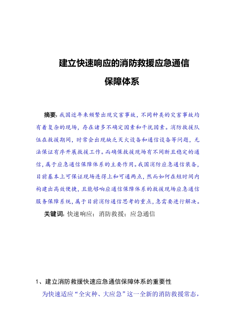 建立快速响应的消防救援应急通信保障体系摘要:我国近年来频繁出现灾害事故,不同种类的灾害事故均有着复杂的现场,存在诸多不确定因素和干扰因素。消防救援队伍在救援期间,时常会出现缺乏灭火设备和通信设备等问题,无法保证有序开展救援工作。而确保救援现场有不间断且稳定的通信,属于应急通信保障体系的主要作用。我国消防应急通信装备,目前基本上可保证现场连得上和可通两,点,然而如何在短时间内构建出高效便捷,且能够响应通信保障体系的救援现场应急通信服务保障系统,属于目前消防通信思考的重,点,急需要进行解决。关键词:快速响应;消防救援;应急通信1、建立消防救援快速应急通信保障体系的重要性为快速适应“全灾种、大应急”这一全新的消防救援常态,黄明部长明确了应急通信保障体系工作目标,即实现“组成网、随人走,不中断、连得上,听得见、看得清,能图传、能分析”。采用何种方式可第一时间交换灾情传输给指挥部,后者进行有效指挥并作出科学的决策,进一步增强处理灾害效率和质量,提高应对能力,而这也是应急通信救援保障系统的根本任务。搭建可迅速反应的应急通信保障系统,有效连接指挥部和救援现场。尤其是在出现地震、泥石流、洪水等大型地质灾害时,现场通信功能通常会受到严重干扰,而要在现场快速搭建切实有效的消防应急通信网络是至关重要的。通信保障人员应在现场迅速组建作战单位、前方指挥部、总队(支队)指挥中心之间的立体通信联络网,确保指令能够快速准确的传达,保证按照科学决策开展作战行动,从而降低出现各类作战安全事故和盲目救援等问题可能性。2、现场应急通信保障的基本特征消防救援现场通常在比较恶劣的情况下进行,而消防救援人员需要确保在此环境内能够正常通信,以此来切实提供救援效率和质量。消防救援现场应急通信通常会显示出有多样化形势、场景丰富和突发性等特征。2.1时间突发由于灾害发生通常在一瞬间,且发生了灾害之后需要消防救援人员迅速赶往现场,这也就意味着消防救援人员没有充足的时间临时准备应急通信的各项事宜,对于应急通信的使用与调派都具有突发性和紧迫性,因此救援工作和保障工作均十分重要,应时刻保持在待命状态。2.2环境复杂在多样化的恶劣灾害中开展消防救援工作,应急通信的使用场景复杂多变,如危化品事故、洪涝、地震、火灾、台风等,并且需要救援的环境既有高空又有地下,甚至还需要在水下进行救援工作。同时,通常灾害的发生也会导致其环境的通信中断,还可能会出现电力供应中断、交通阻碍等问题,因此在恶劣的环境中对于应急通信的保障能力的考验尤为关键。2.3形式多样消防救援通信保障的形式多样、手段灵活。因为应急通信不仅仅可以通过文字、语音等常规的通信形式保障通信,还可以通过视频、数据等传递信息,需要使用到无线链路、微波链路、有线链路以及卫星链路等多种通信手段。在消防救援现场,较佳的通信方式是视频与语音形式的通信,因为这两种方式可以最为直观且快速地实现指挥部对救援现场的了解以及高效的指挥救援沟通。但是如果现场条件受到限制,就需要保障文字、数据等简单基本的沟通形式,确保最大限度将信息与外界进行传递。3、建立快速响应的应急通信保障体系的关键点建立消防救援快速响应的应急通信保障体系,关键在“快