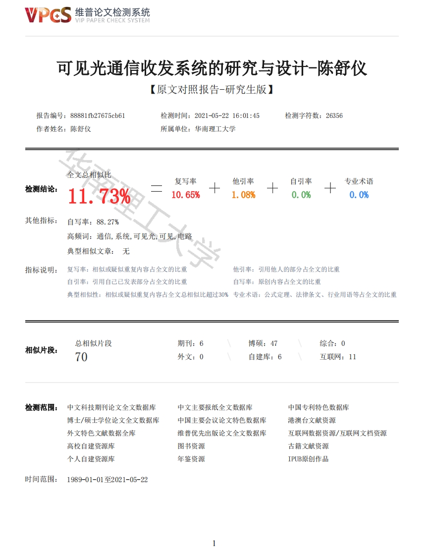 维普论文检测系统/IP PAPER CHECK SYSTEM可见光通信收发系统的研究与设计-陈舒仪【原文对照报告-研究生版】报告编号:88881fb27675cb61检测时间:2021-05-2216:01:45检测字符数:26356作者姓名:陈舒仪所属单位:华南理工大学全文总相似比复写率他引率自引率专业术语检测结论:11.73%10.65%1.08%0.0%0.0%其他指标:自写率:88.27%高频词:通信,系统,可见光,可见,电路典型相似文章:无指标说明:复写率:相似或疑似重复内容占全文的比重他引率:引用他人的部分占全文的比重自引率:引用自己已发表部分占全文的比重自写率:原创内容占全文的比重典型相似性:相似或疑似重复内容占全文总相似比超过30%专业术语:公式定理、法律条文、行业用语等占全文的比重总相似片段期刊:6博硕:47综合:0相似片段:70外文:0自建库:6互联网:11检测范围:中文科技期刊论文全文数据库中文主要报纸全文数据库中国专利特色数据库博士/硕士学位论文全文数据库中国主要会议论文特色数据库港澳台文献资源外文特色文献数据全库维普优先出版论文全文数据库互联网数据资源/互联网文档资源高校自建资源库图书资源古籍文献资源个人自建资源库年鉴资源IPUB原创作品时间范围:1989-01-01至2021-05-22维普论文检测系统VIP PAPER CHECK SYSTEM原文对照颜色标注说明:■自写片段■复写片段(相似或疑似重复)引用片段(引用)■专业术语(公式定理、法律条文、行业用语等)South China University of Technology本科毕业设计(论文)可见光通信收发系统的研究与设计学院电子与信息学院专业电子科学与技术学生姓名陈舒仪学生学号201730271405指导教师刘汉华提交日期2021年5月19日摘要LD凭借着节能、环保、高效、低功耗、寿命长等优点,逐渐替代了传统的照明工具,成为了未来市场的主力军。可见光通信技术是利用了LD作为光源,基于LED高速频率响应特性,同时实现照明与通信两个功能。可见光通信技术是当前无线电通信的研究热门,因可见光具有与传统无线电不同的电磁特性,以及其两用性提供了潜在的应用价值。本文对可见光通信系统进行研究分析,在实验电路板的基础上通过程序设计实现了音频传输功能。研究工作主要包括:(1)学习了可见光通信技术相关原理与研究背景,分析了可见光通信技术的研究价值和发展历程,对LD基本的调制原理、常见的可见光通信信道模型与调制方式进行了研究:(2)对基于MSP430G2553单片机设计的可见光通信电路板进行了研究学习,该电路板核心是MSP430G2553单片机最小系统,还包含了音频输入、LED驱动、光电检测、DA转换和音频播放模块:(3)通过对MSP430G2553编程,采取了UART串口通信进行了00K调制和解调、基于ADC完成了AD转换,最终实现了所需功能:(4)对可见光通信系统进行了音频传输测试,传输距离能够达到1m。关键词:白光LD;可见光通信;O0K调制AbstractWith the advantages of energy conservation,environmental protection,high efficiency,low power2维普论文检测系统VIP PAPER CHECK SYSTEMconsumption and long service life,LED gradually replaces traditional lighting tools and becomes themain force in the future market.Visible light communication (VLC)technology utilizes LED as thelight source.Based on the high-speed frequency response characteristics of LED,VLC realizesillumination and communication functions at the same time.At present VLC technology is a hotresearch field in radio communication,because visible light has different electromagneticcharacteristics from traditional radios,and its dual use provides potential application value.In this paper,the VLC system is studied and analyzed.Based on the circuit board and viaprogramming,audio transmission function is finally realized.The main research work includes:(1)Learn the knowledge and research background of VLC technology,analyze the research valueand development history of VLC technology,and study the LED modulation principle,VLC channel modeland modulation mode;(2)Learn the design of visible light communication circuit based on MSP430G2553 MicroprogrammedControl Unit (MCU),including MSP430G2553 MCU minimum system,audio input,LED drive,photoelectricdetection,DA conversion and audio amplification;(3)Learn the programming of MSP430G2553,realize 00K modulation and demodulation of signals byusing UART serial communication and AD conversion by using ADC,and eventually implement functionsof the system;(4)Test the audio transmission on the VLC system,and the transmission distance can reach 1m.Keywords:White LED:Visible light communication;00K modulation目录摘要IAbstractI目录I第一章绪论11.1引言11.2研究背景11.3研究现状21.4论文结构3第二章可见光通信技术42.1发光二极管42.1.1白光LED发光原理42.1.2白光LED伏安特性52.1.3白光LD调制特性62.2可见光通信信道模型72.3可见光通信调制技术82.4本章总结9第三章可见光通信系统电路设计103.1系统总体设计103.2主控器设计113.2.1MSP430G2553单片机113.2.2MSP430G2553最小系统123.3可见光通信系统发射端电路133.3.1音频输入电路133.3.2LD驱动电路133.3.3可见光通信系统发射端总电路143.4可见光通信系统接收端电路153.4.1光电检测电路153