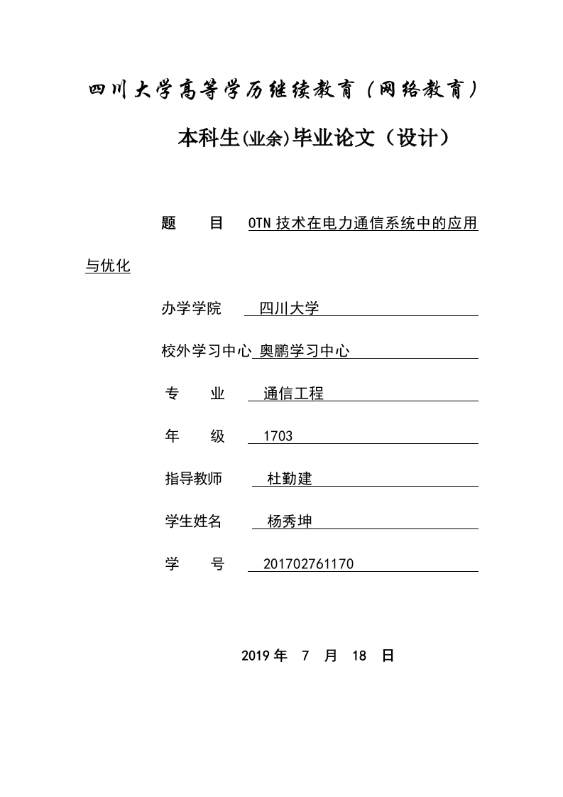 四川大学高等学历继续教育(网络教育)本科生(业余)毕业论文(设计)题目OTN技术在电力通信系统中的应用与优化办学学院四川大学校外学习中心奥鹏学习中心专业通信工程年级1703指导教师杜勤建学生姓名杨秀坤学号2017027611702019年7月18日OTN技术在电力通信系统中的应用与优化专业:通信工程学生:杨秀坤指导教师:杜勤建摘要电力系统通信网,作为电力行业的专用通信网,是电力系统不可缺少的组成部分,伴随着电力系统信息化、智能化发展需求的不断提升,电力系统通信网承载的业务逐渐从单一的调度监控业务、安全生产业务、营销业务、电话业务向多媒体的经营管理、行政管理业务演变,其业务类型也由单一的SDH,PDH制式演变为GE,10GE等,其承载了数据、图像、语音等多种媒体信息。鉴于信息通信在电力公司生产管理过程发挥着越来越重大的作用,电力通信网络不但要满足了电力系统特有的大容量通信传输要求,而且需要保证相关业务的安全、可靠。具有一定的现实意义。针对于此对于该课题进行相关的研究是至关重要的。关键词:OTN:组网优化:电力系统:通信网络Application and optimization of OTN technology inpower communication systemMajor:Communication engineeringStudent:yangxiukunSupervisor:duqinjianAbstractPower system communication network,as a special communication network ofelectric power industry,is an integral part of power system,along with the improvingof the power system information,intelligent development needs,bearing the businessgradually from a single power system communication network scheduling monitoringbusiness,safety in production,marketing,business,telephone service to themultimedia management,administrative management business evolution,its businesstype also by a single SDH,PDH system evolution for GE,10 GE and so on,itscarrying data,images,voice and other media information.Considering thatinformation communication plays an increasingly important role in the production andmanagement process of electric power companies,the electric power communicationnetwork not only needs to meet the special requirements of large-capacitycommunication transmission of electric power system,but also needs to ensure thesafety and reliability of related businesses.Has certain practical significance.Aimingat this,it is crucial to carry out relevant research on this subject.Key words:Otns;Network optimization;Power systems;Communicationnetwork