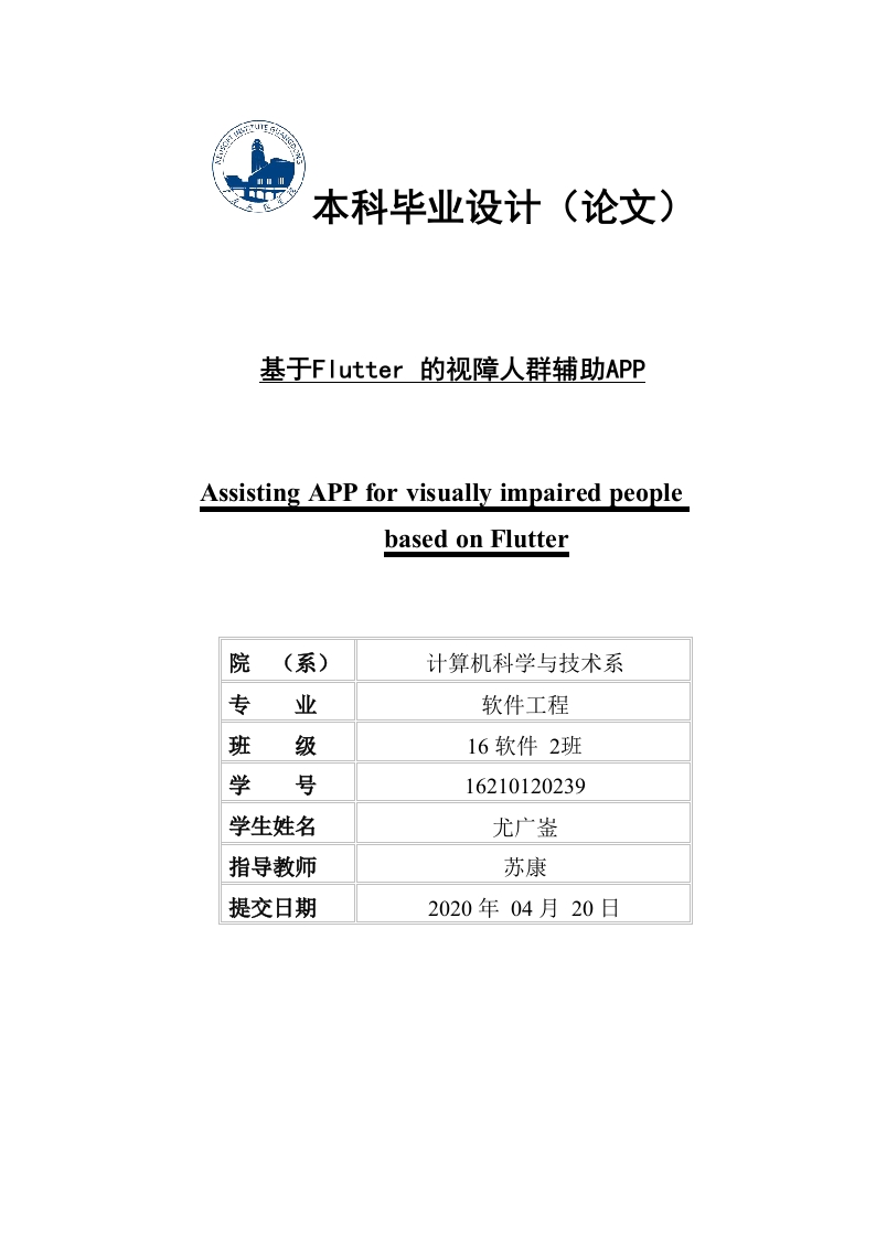 本科毕业设计(论文)基于Flutter的视障人群辅助APPAssisting APP for visually impaired peoplebased on Flutter计算机科学与技术系专业软件工程班级16软件2班学号16210120239学生姓名指导教师苏康提交日期2020年04月20日毕业设计(论文)原创性声明本人郑重声明:所呈交的毕业设计(论文),是本人在指导老师的指导下,独立进行的设计(研究)工作及取得的成果,论文中引用他人的文献、数据、图件、资料均已明确标注出,论文中的结论和结果为本人独立完成,不包含他人已经发表或撰写的作品及成果。对本文的研究作出贡献的个人和集体,均已在论文中作了明确的说明。本人完全意识到本声明的法律结果由本人承担。毕业论文作者(签字):签字日期:年月成绩评定成绩项论文成绩(百分制)折合比例实得成绩(折合分)指导教师成绩30%评阅教师成绩20%答辩成绩50%总评成绩注:毕业设计(论文)成绩按百分制评定。答辩成绩不及格的(评分低于60分的),则该毕业设计(论文)总评成绩为答辩成绩。