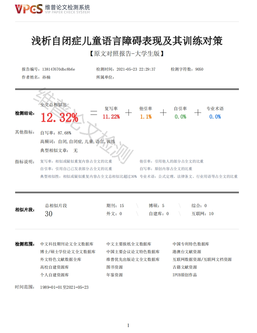 维普论文检测系统/IP PAPER CHECK SYSTEM浅析自闭症儿童语言障碍表现及其训练对策【原文对照报告-大学生版】报告编号:138147670dbc8b6e检测时间:2021-05-2322:29:37检测字符数:9050作者姓名:孙楠所属单位:全文总相似比复写率他引率自引率专业术语检测结论:12.32%11.22%1.1%0.0%0.0%其他指标:自写率:87.68%高频词:自闭,自闭症,儿童,语言,训练典型相似文章:无指标说明:复写率:相似或疑似重复内容占全文的比重他引率:引用他人的部分占全文的比重自引率:引用自己已发表部分占全文的比重自写率:原创内容占全文的比重典型相似性:相似或疑似重复内容占全文总相似比超过30%专业术语:公式定理、法律条文、行业用语等占全文的比重总相似片段期刊:15博硕:5综合:0相似片段:30外文:0自建库:0互联网:10检测范围:中文科技期刊论文全文数据库中文主要报纸全文数据库中国专利特色数据库博士/硕士学位论文全文数据库中国主要会议论文特色数据库港澳台文献资源外文特色文献数据全库维普优先出版论文全文数据库互联网数据资源/互联网文档资源高校自建资源库图书资源古籍文献资源个人自建资源库年鉴资源IPUB原创作品时间范围:1989-01-01至2021-05-23维普论文检测系统VIP PAPER CHECK SYSTEM原文对照颜色标注说明:■自写片段■复写片段(相似或疑似重复)引用片段(引用)■专业术语(公式定理、法律条文、行业用语等)内蒙古民族幼儿师范高等考科学校学校代码:14463学号:浅析自闭症儿童语言障碍表现及其训练对策专业特殊教育系(部)姓名孙楠班级指导老师(手写)职称完成时间摘要自闭症已经成为儿童精神的第一大杀手,在众多国家和地区都有所分布。而目前自闭症患者的数量逐年上升,越来越多的国家意识到了自闭症对于儿童成长和交流的危害,因此自闭症受到世界各国的广泛关注和深入研究。行为刻板、兴趣狭窄、语言障碍、社交障碍等都是自闭症的主要症状。由于大部分自闭症患者均存在不同程度上的语言障碍,因此语言障碍也被认为是自闭症儿童核心症状之一。语言障碍不仅会影响到自闭症儿童的正常交流与互动,也严重阻碍了自闭症儿童认知理解能力的提高。因此本文将自闭症儿童语言障碍作为主要研究对象。首先介绍了论文选题的研究背景,目的,意义以及对于自闭症及语言障碍的相关文献综述。其次界定了自闭症和语言障碍的概念范围。第三部分和第四部分则主要介绍了自闭症儿童语言障碍的四种表现形式以及障碍产生的原因。最后从感觉统合训练、气息训练、口部肌肉训练,舌头灵活性训练,以及语言训练教学方法等五方面提出相对应的训练策略。关键词:自闭症儿童:语言障碍:语言训练目录一、引言1(一)研究背景1(二)研究目的及意义1(三)文献综述2(四)研究方法3二、自闭症概述及语言障碍相关概念界定3(一)自闭症3(二)语言障碍42维普论文检测系统VIP PAPER CHECK SYSTEM三、自闭症儿童语言障碍表现形式4(一)语言发展迟缓4(二)语言重复4(三)构音异常5(四)词汇理解困难5四、自闭症儿童语言障碍原因6(一)器质性因素61.声带受损62.呼吸器官功能弱63.舌头不灵活64.口部肌肉过松或过紧6(二)非器质性因素71.语言能力发展迟缓72.认知理解力发展缓慢7五、自闭症儿童的语言训练对策7(一)感觉统合训练7(二)气息训练8(三)口部肌肉训练8(四)舌头灵活性训练9(五)语言训练教学法91.回合式教学法92.自然教学法10论文检测结论10参考文献11一、引言(一)研究背景自闭症患者数量逐渐增加,然而却没有有效的药物进行控制,对自闭症的产生原因也尚不明确,因此自闭症已经成为世界各国首要解决的公共卫生挑战。越来越多的国家颁布相关法案,加大财政拨款以帮扶自闭症患者。例如美国以《残疾人教育法案》的形式将自闭症纳入特殊教育中,此外还加大资金投入来进行自闭症研究与教育:法国也出台了各项法律和国家自闭症计划来帮扶自闭症患者。我国关于自闭症的研究始于1982年,并于2005年将自闭症列入中国残疾人名录。2015年,自闭症行业报告数据指出自闭症发病率正逐年上升,发病率达到了1/68,其中男孩的发病率为1/42。张艳华指出目前我国现有自闭症患者1000万,自闭症儿童占据1/5。但遗憾的是,截止2015年我国还没有针对自闭症的展开相关调查。此时我国对于自闭症的研究处于薄弱环节,其康复和教育手段也大多引进国外技术。2017年,自闭症行业报告数据指出我国自闭症患者正以每年20万的速度增长,此时自闭症发病率已经达到了1/45,成为儿童精神残疾的第一大杀手。报告中同时也指出早期干预行为对自闭症儿童康复的重要性。2019年,第3份自闭症行业报告主要论述了我国自闭症康复教育机构面临的主要问题。随着时间的推移,我国自闭症患者数量逐年上升,但还未形成针对自闭症患者教育、康复等各方面完善的训练体系,因此我们必须提高对自闭症患者的重视程度,分析自闭症儿童语言障碍的表现形式以及产生语言障碍的主要原因,并提出针对自闭症儿童语言训练的相关对策,希望能够对恢复自闭症儿童语言能力起到促进作用。(二)研究目的及意义自闭症发病率逐年上升,但其发病原因不明确,已经成为儿童精神健康的第一大杀手。由于缺少治疗自闭症的有效药物,因此只能通过康复训练来干预自闭症。本文以自闭症儿童语言障碍为主要研究对象,分析自闭症儿童语言障碍的表