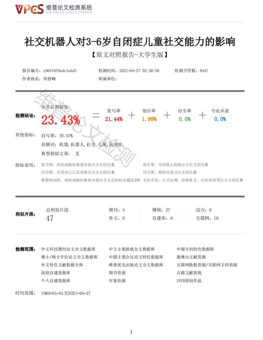 维普论文检测系统/IP PAPER CHECK SYSTEM社交机器人对3-6岁自闭症儿童社交能力的影响【原文对照报告-大学生版】报告编号:c90f4479edc1ebd1检测时间:2021-04-2702:30:39检测字符数:8447作者姓名:利晋峰所属单位:全文总相似比复写率他引率自引率专业术语检测结论:23.43%21.44%1.99%0.0%0.0%其他指标:自写率:76.57%高频词:机器,机器人,社交,儿童,自闭症典型相似文章:无指标说明:复写率:相似或疑似重复内容占全文的比重他引率:引用他人的部分占全文的比重自引率:引用自己已发表部分占全文的比重自写率:原创内容占全文的比重典型相似性:相似或疑似重复内容占全文总相似比超过30%专业术语:公式定理、法律条文、行业用语等占全文的比重总相似片段期刊:4博硕:27综合:0相似片段:47外文:0自建库:0互联网:16检测范围:中文科技期刊论文全文数据库中文主要报纸全文数据库中国专利特色数据库博士/硕士学位论文全文数据库中国主要会议论文特色数据库港澳台文献资源外文特色文献数据全库维普优先出版论文全文数据库互联网数据资源/互联网文档资源高校自建资源库图书资源古籍文献资源个人自建资源库年鉴资源IPUB原创作品时间范围:1989-01-01至2021-04-27维普论文检测系统VIP PAPER CHECK SYSTEM原文对照颜色标注说明:■自写片段■复写片段(相似或疑似重复)口引用片段(引用)■专业术语(公式定理、法律条文、行业用语等)广州体育学院学士学位论文社交机器人对3-6岁自闭症儿童社交能力的影响学号201706120106姓名利晋峰院系运动与健康学院专业特殊教育指导教师方春露年月摘要研究背景:随着社会的快速发展,出现自闭症的儿童日益剧增,将严重影响其家庭的幸福指数。研究目的:人类治疗师和社交机器人分别对自闭症儿童打招呼、手指指示跟随、眼神注视跟随三种社交活动进行干预,探究社交机器人对儿童社交能力的影响,为自闭症儿童的康复训练提供有效的借鉴。研究方法:采用被试内实验设计,选取某市特殊教育学校20名自闭症学生作为研究对象。人类治疗师和社交机器人分别对孩子进行社交干预,以《儿童行为记录表》采集数据,并进行数理统计,对比分析人类治疗师和社交机器人的自闭症儿童的社交能力。研究结果:(1)在打招呼和眼神注视跟随社交活动中儿童对两者的限神注视次数没有明显的差异(p>0.05),在手指指示跟随中,儿童对两者的眼神注视次数存在显著差异(p<0.05),对社交机器人的平均注视次数高于人类治疗师。(2)在打招呼、手指指示跟随和眼神注视跟随三种社交活动中,儿童对两者的平均注视时长都存在高度显著性差异(p<0.01),对社交机器人的平均注视时长高于人类治疗师。(3)在打招呼和手指指示社交活动中,儿童对两者的靠近行为次数存在高度显著性差异(p<0.01),对社交机器人的靠近行为次数多于人类治疗师,在眼神注视跟随2维普论文检测系统VIP PAPER CHECK SYSTEM中,儿童对两者的靠近行为次数没有显著差异(p>0.05)。(4)在打招呼、手指指示跟随和眼神注视跟随三种社交活动中,儿童对两者的接触行为次数都存在显著差异(p<0.05),对社交机器人的接触行为次数多于人类治疗师。研究结论:与人类治疗师相比较,社交机器人对自闭症儿童更具吸引力,较易诱发自闭症儿童社交活动,促进自闭症儿童社交能力的发展。关键词:自闭症儿童:社交机器人:社交能力目录1.绪论11.1研究背景11.2研究意义22.文献综述32.1机器人的相关研究32.2社交机器人的起源与发展32.3NA0机器人开发平台42.4社会交往能力的概念42.5使用社交机器人进行干预的方式53.研究方法73.1研究对象73.2研究方法73.2.1文献资料法73.2.2访谈法73.2.3实验研究法81)实验工具8论文检测2)实验过程93.2.4数理统计法104.实验结果与分析105研究结论136.展望137.参考文献14附录17致谢181.绪论1.1研究背景自闭症是一种广泛存在的神经发育障碍。其典型特征之一是社交能力的缺失[1]。社交能力缺失导致自闭症患者无法在日常生活中进行正常的社交活动,一些普通的面部表情和肢体行为都会让其感到恐惧,拒绝与他人进行交流。随着自闭症儿童不断的成长,其社交障碍的状况不仅得不到改善,还会变得更加严峻[2]。近年来,自闭症发病率不断增加。根据全国残疾人普查结果,我国自闭症患者约336.3万人,居精神残疾人首位[3]。机器人是20世纪最伟大的发明之一,经常在教育领域受到很多关注,并被应用于机器人教育、人与机器的互相作用和自闭症儿童教育[4]。与其他类型的机器人相比,社交机器人有三种功能性。一是可以及时做出反馈,让自闭症的孩子们可以获得成就感。二是因为有运动功能,其自身的特性不同与人类,可以不同程度的与自闭症孩子进行体育活动和各种游戏,是一种主动的玩具:三是能够为其输入指令,让自闭症孩子自己动手操控机器人完成特定的行为,从而实现对指令的学习[5]。本研究主要探讨社会机器人诱导自闭症儿童社会行为的可行性。1.2研究意义随着社会高科技飞速发展,较多行业呈现了机器人操作作业。通过本研究,探讨自闭症儿童是否对社交机器人感兴趣,并通过与机器人的接触,观察其是否能提高儿童的社交能力,进而探讨机器人对自闭症儿童社交能力的干预效果,探索自闭症儿童尽快回归主流社会的康复手段,促进我国自闭症儿童康复事业的发展,提高自闭症儿童的康复效果,帮助减轻康复治疗师的负担,减轻自