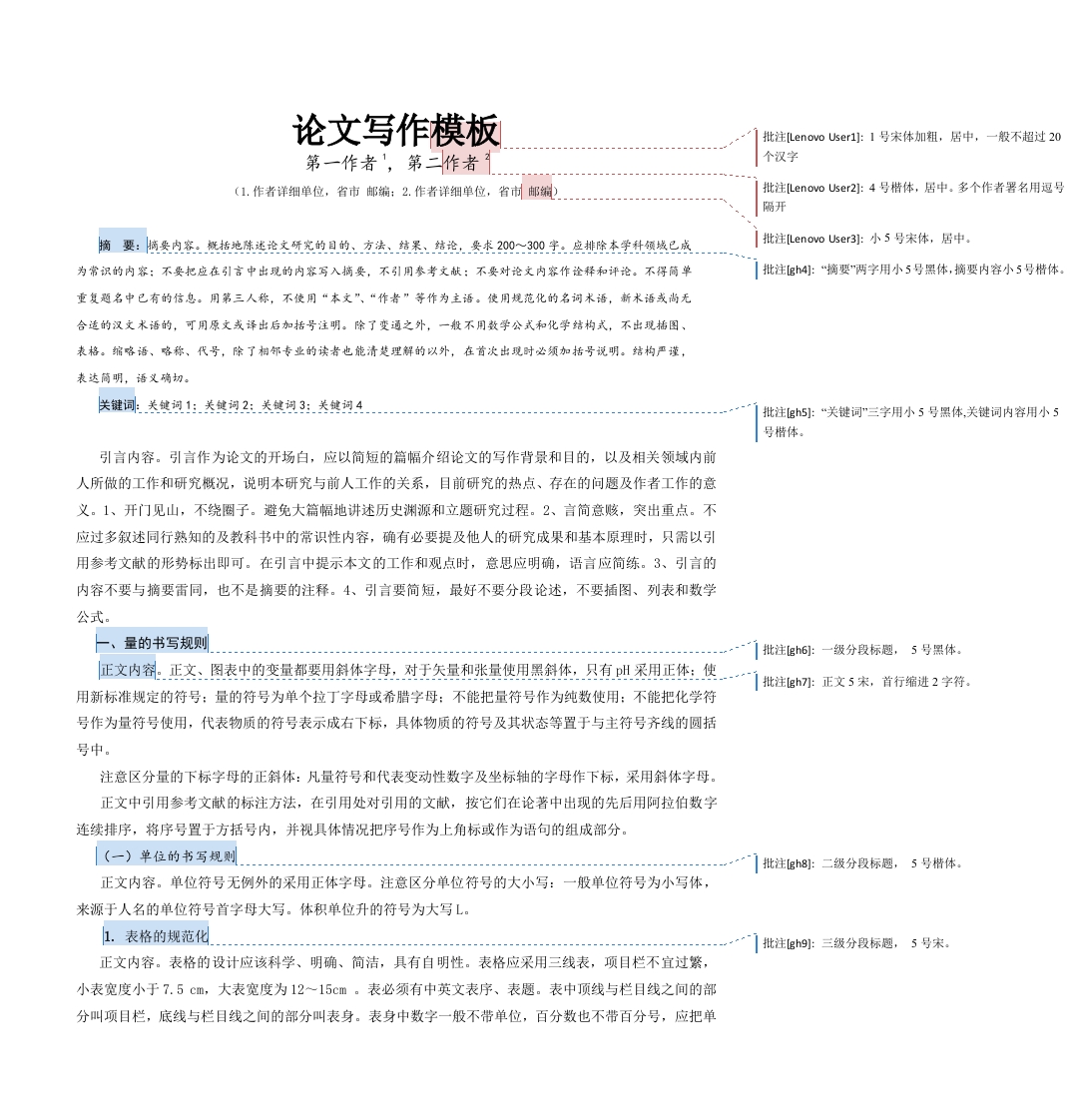 论文写作模板批注Lenovo User1:1号宋体加粗,居中,一般不超过20第一作者,第二作者个汉字(1.作者详细单位,省市邮编:2.作者详细单位,省市邮端)批注[Lenovo User2:4号楷体,居中。多个作者署名用逗号隔开|批注Lenovo User3.引:小5号宋体,居中。为常识的内客:不要把应在引言中出现的内客写入摘要,不引用参考文献:不要对论文内家作诠释和评论。不得简单批注gh4:“摘要两字用小5号黑体,摘要内容小5号楷体。重复题名中已有的信息。用第三人称,不使用“本文”、“作者”等作为主语。使用规范化的名词术语,新术语或尚无合适的汉文术语的,可用原文或译出后加括号注明。除了变通之外,一般不用数学公式和化学结构式,不出现插图、表格。缩咯语、咯称、代号,除了相邻专业的读者也能清楚理解的以外,在首次出现时必须加括号说明。结构严谨,表达简明,语义确切。批注gh5]小:“关键词”三字用小5号黑体,关键词内容用小5号楷体。引言内容。引言作为论文的开场白,应以简短的篇幅介绍论文的写作背景和目的,以及相关领域内前人所做的工作和研究概况,说明本研究与前人工作的关系,目前研究的热点、存在的问题及作者工作的意义。1、开门见山,不绕圈子。避免大篇幅地讲述历史渊源和立题研究过程。2、言简意赅,突出重点。不应过多叙述同行熟知的及教科书中的常识性内容,确有必要提及他人的研究成果和基本原理时,只需以引用参考文献的形势标出即可。在引言中提示本文的工作和观点时,意思应明确,语言应简练。3、引言的内容不要与摘要雷同,也不是摘要的注释。4、引言要简短,最好不要分段论述,不要插图、列表和数学一、量的书写规则批注gh6:一级分段标趣,5号黑体。正文内容。正文、图表中的变量都要用斜体字母,对于矢量和张量使用黑斜体,只有H采用正体:使1批注gh7:正文5宋,首行缩进2字符。用新标准规定的符号:量的符号为单个拉丁字母或希腊字母:不能把量符号作为纯数使用:不能把化学符号作为量符号使用,代表物质的符号表示成右下标,具体物质的符号及其状态等置于与主符号齐线的圆括号中。注意区分量的下标字母的正斜体:凡量符号和代表变动性数字及坐标轴的字母作下标,采用斜体字母。正文中引用参考文献的标注方法,在引用处对引用的文献,按它们在论著中出现的先后用阿拉伯数字连续排序,将序号置于方括号内,并视具体情况把序号作为上角标或作为语句的组成部分。(一)单位的书写规则批注gh8:二级分段标题,5号楷体。正文内容。单位符号无例外的采用正体字母。注意区分单位符号的大小写:一般单位符号为小写体,来源于人名的单位符号首字母大写。体积单位升的符号为大写L。1.表格的规范化|批注gh9:三级分段标趣,5号宋。正文内容。表格的设计应该科学、明确、简洁,具有自明性。表格应采用三线表,项目栏不宜过繁,小表宽度小于7.5cm,大表宽度为12~15cm。表必须有中英文表序、表题。表中顶线与栏目线之间的部分叫项目栏,底线与栏目线之间的部分叫表身。表身中数字一般不带单位,百分数也不带百分号,应把单位符号和百分号等归并在栏目中。如果表中栏目中单位均相同,则可把共同的单位提出来标示在表格顶线上方的右端(不加“单位”二字)。表身中同一栏各行的数值应以个位(或小数点),且有效位数相同。上下左右相邻栏内的文字或数字相同时,应重复写出。表1表题批注gh10小:表序、表趣,小5号黑。产量1批注gh11小:表中,汉字小5号宋,线条磅数应在0.50.75磅。数字和字母用小S号Times New Roman,左对齐。二、图的规范化正文内容。插图尽可能不用彩色图。小图宽度小于7.5cm,大图宽度为12~15cm。图必须有图序、图题。函数图只在靠近坐标线处残留一小段标值短线,其余部分省略。加注坐标所代表的量及单位。标值排印在坐标外侧,紧靠标值短线的地方:标值的有效数字为3位。若有图注,靠近放在图下部,图序、图批注gh12小:图中汉字小5号宋,数字和字母用小5号Times题的上方New Roman,变量用斜体,单位用正体。6005004002001200220032004被引年/年图1xx学报年被引量三、数学符号和数学式的编排规范正文内容。变量、变动附标及函数用斜体字母表示。点、线段及弧用斜体字母表示。在特定场合中视为常数的参数也用斜体字母表示。对具有特殊定义的函数和值不变的数学常数用正体字母表示。具有特殊定义的算子也用正体字母表示。矩阵符号用大写的黑斜体字母表示,矩阵元素用白斜体字母表示。公式及公式中的符号说明尽量接排以节省版面。把带有复杂上角标的指数函数©写成xpt。公式的主体应排在同一水平线上:繁分式的主辅线要分清。长公式在运算符号后回行:长分式转行时,先将分母写成负幂指数的形式,然后转行:矩阵和行列式不能转行。矩阵元素包含式子时,每一列应以中心线上下对齐,行要左右排齐:元素为单个字母或数字时,每列应使正负号对齐。对角矩阵中对角元素所在的列应明显区分,不能上下重叠。简单的和常识性的运算公式和推导过程不要列写。四、结论正文内容。结论不应是正文中各段小结的简单重复,它应以正文中的实验或考察得到的现象、数据的阐述分析为依据,完整、准确、简洁地指出以下内容:1)由对研究对象进行考察或实验得到的结果所揭示的原理及其普遍性:2)研究中有无发现例外或本论文尚难以解释