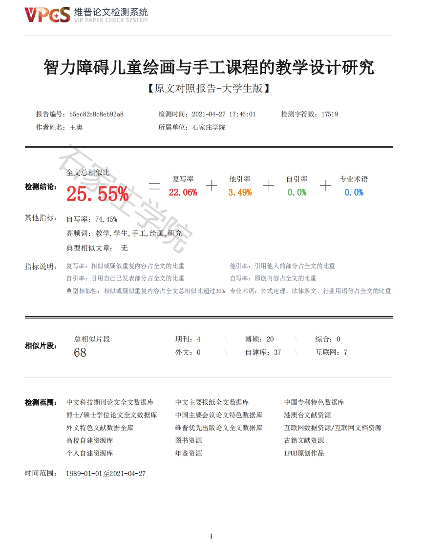 维普论文检测系统/IP PAPER CHECK SYSTEM智力障碍儿童绘画与手工课程的教学设计研究【原文对照报告-大学生版】报告编号:b5ec82c8c8eb92a8检测时间:2021-04-2717:46:01检测字符数:17519作者姓名:王奥所属单位:石家庄学院全文总相似比复写率他引率自引率专业术语检测结论:25.55%22.06%3.49%0.0%0.0%其他指标:自写率:74.45%高频词:教学,学生,手工,绘画,研究典型相似文章:无指标说明:复写率:相似或疑似重复内容占全文的比重他引率:引用他人的部分占全文的比重自引率:引用自己已发表部分占全文的比重自写率:原创内容占全文的比重典型相似性:相似或疑似重复内容占全文总相似比超过30%专业术语:公式定理、法律条文、行业用语等占全文的比重总相似片段期刊:4博硕:20综合:0相似片段:68外文:0自建库:37互联网:7检测范围:中文科技期刊论文全文数据库中文主要报纸全文数据库中国专利特色数据库博士/硕士学位论文全文数据库中国主要会议论文特色数据库港澳台文献资源外文特色文献数据全库维普优先出版论文全文数据库互联网数据资源/互联网文档资源高校自建资源库图书资源古籍文献资源个人自建资源库年鉴资源IPUB原创作品时间范围:1989-01-01至2021-04-27维普论文检测系统VIP PAPER CHECK SYSTEM原文对照颜色标注说明:■自写片段■复写片段(相似或疑似重复)口引用片段(引用)■专业术语(公式定理、法律条文、行业用语等)SHIJIAZHUANG UNIVERSITY毕业论文题目:智力障碍儿童绘画与手工课程的教学设计研究学院:教师教育学院专业:特殊教育班级:17级特殊教育本科一班姓名:王奥学号20171219030指导教师:刘真讲师2021年4月20日毕业论文诚信承诺书本人郑重承诺所提交的毕业论文《智力障碍儿童绘画与手工课程的教学设计研究》,是在指导教师的指导下,严格按照学校和学院的规定完成的。1.本人在毕业论文中引用他人的观点和参考资料均加以注释和说明。2.本人承诺在毕业论文选题和研究过程中没有抄袭他人研究成果和伪造相关数据等行为。3.在毕业论文中对侵犯任何方面知识产权的行为,由本人承担相应的法律责任。学生签名:王奥日期:智力障碍儿童绘画与手工课程的教学设计研究【摘要】培智学校的绘画与手工课程是培养和发展学生绘画与手工制作能力的一门重要课程,绘画与手工课程对培养学生绘画与手工制作能力以及促进学生的发展具有重要作用。研究选取了石家庄市某机构某班级中的3名智力2维普论文检测系统VIP PAPER CHECK SYSTEM障碍儿童作为研究对象,采取文献研究法、观察法和行动研究法,对该班级进行绘画与手工课程的集体教学。在2个月的教学活动中,参照培智学校义务教育绘画与手工课程标准中的领域目标和课程内容,结合学生的基本情况,设计并实施教学计划,对智力障碍儿童进行绘画与手工课程的教学,通过对教学结果分析,3名学生的绘画与手工制作能力均有不同程度的提升,其中在“造型·表现”和“设计·应用”领域提升较大,在“欣赏·评述”和“综合·探索”领域提升较小。因此本研究探索出了如何进行智力障碍儿童绘画与手工课程教学方案的设计与制定。【关键词】智力障碍儿童绘画与手工课程实践教学Research on the instructional design of drawing and handcraft course for children with mentalretardation[Abstract]The course of painting and handwork in the school is an important course tocultivate and develop the students'ability of painting and handwork.The course of paintingand handwork plays an important role in cultivating students'ability of painting and handworkand promoting their development.This study selected 3 children with mental retardation from someclasses in Shijiazhuang as the research objects,and adopted literature research method,observationmethod and action research method to carry out the collective teaching of painting and handcraftcourse in this class.In the teaching activities of the two months,consult society-adaptationschools compulsory education in painting and manual field goal and course content of curriculumstandards,combined with the students'classroom performance,for mental retardation childrenpainting and manual course,according to the analysis of the teaching results of three students inpainting and handmade ability all have different degrees of ascension,one in "modelling,performance"and "design,application field is larger,the"appreciation,review "and"integrated,exploring "ascension is smaller.Therefore,it is proved that the teaching of painting and handworkcourses is effective in cultivating and promoting students ability.[Key Words Mentally handicapped child Drawing and Handicraft Coursespractical teaching目录1引言11.1研究背景11.2研究意义11.2.1理论意义11.2.2实践意义12文献综述22.1核心概念界定22.1.1绘画与手工课程22.1.2智力障碍22.1.3教学设计22.2研究现状22.2.1国外研究现状22.2.2国内研究现状33研究设计33.1研究目的43.2研究对象43.3研究方法43.3.1文献研究法43.3.2观察法43.3.3行动研究法43.4研究工具43.4.1《培智学校义务教育绘画与手工课程标准》53