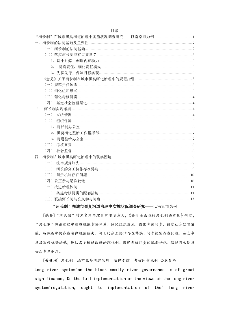 目录“河长制”在城市黑臭河道治理中实施状况调查研究一一以南京市为例.1一、河长制的法制基础及重要性…(一)河长制的法制基础…2(二)落实河长制具有重要意义1、切中时弊,创造内在动力32、明确责任,细化责任模式.33、先探先行,保障目标实现3二、《意见》关于河长制在城市黑臭河道治理中的规范指引33(二)细化组织形式3(三)强化考核问责.(四)拓宽社会监督渠道.4三、河长制实践考察…451、河长制办公室…2、黑臭河道整治工作指挥部73、河道整治办公室7.8(四)社会监督四、河长制在城市黑臭河道治理中的现实困境9(一)法律规范缺失(二)河长的分工协作存在弊病.(四)公正参与层次较低…(一)改进治理体制…(二)搭建考核问责的配套措施.11(三)联接河长制与公众参与制度.12“河长制”在城市黑臭河道治理中实施状况调查研究一一以南京市为例[摘要]“河长制”对黑臭河治理具有重要意义,《关于全面推行河长制的意见》规定,“河长制”实施过程中应当规范责任体系、细化组织形式、强化考核问贡、拓宽社会监督渠道。而实践中仍存在法律规范缺失、河长的分工协作存在弊病、问责机制存在问题、公众参与层次较低等缺憾,迫切需要通过改进治理体制、搭建考核问责的配套措施、联接河长制与公众参与制度。[关键词]河长制城市黑臭河道治理法律支撑考核问责机制公众参与Long river system"on the black smelly river governance is of greatsignificance,On the full implementation of the views of the long riversystem"regulation,ought to implementation of the"long river"responsibility system,refine the organization form,strengthen theassessment of accountability,widen the channel of the socialsupervision.But in practice there are still lack of legal norms,the riverand the low level of public participation,Urgently needed by improvingmanagement system,set up the assessment of accountability measures,joins the river system and public participation system of long,Tostrengthen the "long river"in the black smelly river management ofsecurity in our country,the implementation of the "about thecomprehensive implementation of the views of the long river system"river chief system;City black smelly rivermanagement:l awsupport;Assessment and accountability mechanism;public participation2013年“请环保局长下河游泳”、“请市长下河游泳”的呼声不绝于耳。政府迅速作出了落实“河长制”在城市黑臭河流治理中运用的决定。自推行以来,“河长制”在落实环境首长负责制、破解“九龙治水”困局、搭建社会共治平台等方面取得了不小突破。鉴于此,2015年,国务院颁布“水十条”与《工作指南》,重点强调在城市黑臭河道治理中落实“河(湖)长制”,并于2016年12月审议通过《关于全面推行河长制的意见》(以下简称《意见》),将河长制从应对水危机的民间创举上升为上层意志。然而作为一项由实践催生的新生制度,“河长制”难免存在问题。笔者拟在法治视域下联系《意见》有关方面的规范性指引,考察南京市黑臭河道治理中“河长制”的具体实践情况,探求内在问题,尝试提出法律向完善对策,盼加强现有法律法规的可操作性,贯彻落实《意见》。一、河长制的法制基础及重要性目前,我国“河长制”已己实现了法制化,并呈现出了巨大的生命力实践意义和制度价值。(一)河长制的法制基础“河长制”是环境治理领域中领导督办制、目标考核制、环保问责制、一票否决制等内部管理机制的综合衍生品,具有一定的制度延续性。《水污染防治法》第4、5条,新《环境保护法》第28条是其法律依据。常纪文则进一步指出,环境保护党政同责制度已被《生态环境损害责任追究办法》、《目标评价考核办法》和《意见》采纳,与《环境保护法》等规定共同为河长制提供了法制基础。(二)落实河长制具有重要意义1、切中时弊,创造内在动力我国法律对水污染防治制度、地方人民政府及水行政部门的水环境负责形式都有规定,但水污染并没有得到改善,甚至恶化,是因为我国一直把地方经济增长作为政绩考核的主要指标,致使各级党政领导忽视了环境保护。“河长制”正切要害,将水环境的改善与政绩挂钩,激发政府的治污积极性,有效落实了水环境目标责任制,助推城市黑臭河道治理目标的实现2、明确责任,细化责任模式“多龙治水”格局下,我国水环境治理体制有着“统管部门统而不统、分管部门分而不分、管理职权交叉矛盾”的桎梏。“河长制”的诞生和推广,把地方党政领导置于黑臭河治理第一责任人的地位,利用地方政府的行政资源协调各部门力量,进一步明晰了黑臭河治理的责任体系,是“水十条”第九条的有力体现。3、先探先行,保障目标实现《意见》要求2018年年底前全国各地全面建立河长制,将有助于河长制现有优势的发挥、现存问题的暴露及改善,从而形成可复制、可推广的经验,服务于黑臭河治理,助力“2030年我国黑臭水体得到消除”目标的达成。二、《意见》关于河长制在城市黑臭河道治理中的规范指引“水十条”对我国城市黑臭河道治理的责任模式提出了明确政府主导责任、规定组织保障责任、规范考核问责机制三方面要求。基于此,《意见》及《实施方案》对相关推进措施予以了细化规定。主要包括:(一)规范责任体系《意见》表明“河长制”以“坚持党政领导,部门联动”为原则,其第二条意味着河长制的落实主体是地方党委和政府,负责统筹全