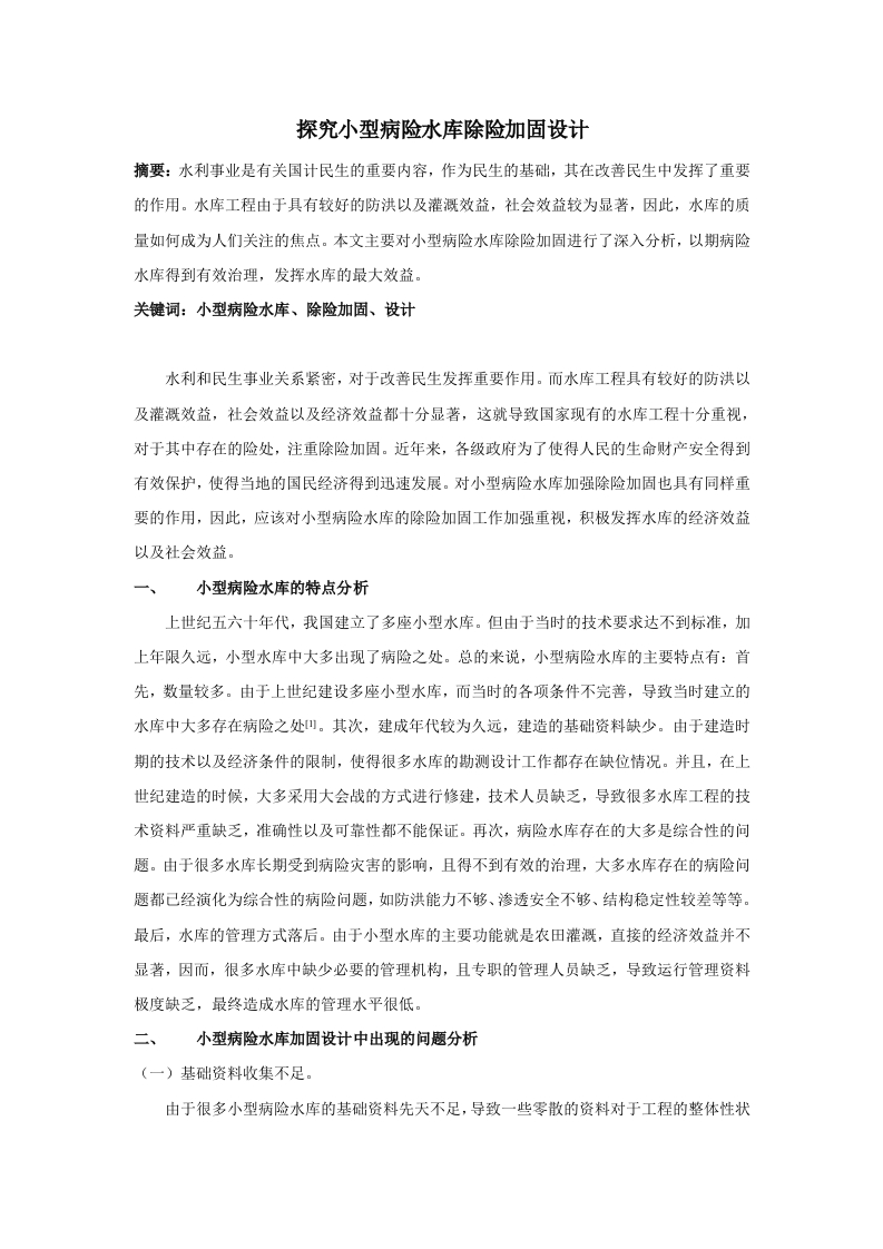 探究小型病险水库除险加固设计摘要:水利事业是有关国计民生的重要内容,作为民生的基础,其在改善民生中发挥了重要的作用。水库工程由于具有较好的防洪以及灌溉效益,社会效益较为显著,因此,水库的质量如何成为人们关注的焦点。本文主要对小型病险水库除险加固进行了深入分析,以期病险水库得到有效治理,发挥水库的最大效益。关键词:小型病险水库、除险加固、设计水利和民生事业关系紧密,对于改善民生发挥重要作用。而水库工程具有较好的防洪以及灌溉效益,社会效益以及经济效益都十分显著,这就导致国家现有的水库工程十分重视,对于其中存在的险处,注重除险加固。近年来,各级政府为了使得人民的生命财产安全得到有效保护,使得当地的国民经济得到迅速发展。对小型病险水库加强除险加固也具有同样重要的作用,因此,应该对小型病险水库的除险加固工作加强重视,积极发挥水库的经济效益以及社会效益。小型病险水库的特点分析上世纪五六十年代,我国建立了多座小型水库。但由于当时的技术要求达不到标准,加上年限久远,小型水库中大多出现了病险之处。总的来说,小型病险水库的主要特点有:首先,数量较多。由于上世纪建设多座小型水库,而当时的各项条件不完善,导致当时建立的水库中大多存在病险之处。其次,建成年代较为久远,建造的基础资料缺少。由于建造时期的技术以及经济条件的限制,使得很多水库的勘测设计工作都存在缺位情况。并且,在上世纪建造的时候,大多采用大会战的方式进行修建,技术人员缺乏,导致很多水库工程的技术资料严重缺乏,准确性以及可靠性都不能保证。再次,病险水库存在的大多是综合性的问题。由于很多水库长期受到病险灾害的影响,且得不到有效的治理,大多水库存在的病险问题都己经演化为综合性的病险问题,如防洪能力不够、渗透安全不够、结构稳定性较差等等。最后,水库的管理方式落后。由于小型水库的主要功能就是农田灌溉,直接的经济效益并不显著,因而,很多水库中缺少必要的管理机构,且专职的管理人员缺乏,导致运行管理资料极度缺乏,最终造成水库的管理水平很低。二、小型病险水库加固设计中出现的问题分析(一)基础资料收集不足。由于很多小型病险水库的基础资料先天不足,导致一些零散的资料对于工程的整体性状并不能全面地反映。而在实际工作中,很多设计人员对于调查访问工作又没有全面深入进行,在对大坝基础开挖工作以及坝体材料、大坝实际修建知识依靠自身的主观判断进行。甚至得出的有的结论和水库的实际情况完全不符,导致很多病险水库的加固设计工作缺乏一定的针对性。(二)对于水库存在的安全隐患没有仔细排查在进行加固设计工作时,很多设计人员对于水库安全鉴定结果的研究以及判断工作不进行重视,导致对于病险水库中存在的诸多安全隐患也没有进行仔细审核。还有的设计人员对于水库安全鉴定中提出的工程病害问题完全不响应。除此之外,还有的设计人员在进行水库加固设计的时候,完全按照水库安全鉴定中得出的结论,对于鉴定得出的问题没有进行进一步分析②。另外,对于鉴定未得出的问题也不去进行深入探究。这样一来,造成病险水库中存在的病险危害没有完全进行处理。(三)设计不够深入在进行加固设计工作的时候,对于其中涉及到关键问题的设计方案没有进行充分论证以及探究,就将结论确定。另外,对于设计方案中出现的问题存在估计不充分的情况,导致设计方案中存在的问题变更较多,存在严重的设计漏项问题。这样一来,就会导致设计方案超概算。在加固设计工作中存在的一个普遍问题就是对于放水洞中存在的安全隐患存在认识不透、分析不清晰的情况,很多加固方案仅仅是对放水洞的进口进行改进以及对闸门进行更换、更换启闭机上,而对于放水洞洞身所存在的安全隐患没有足够的认识。(四)设计服务和施工要求不一致很多设计单位对于施工设计图纸不够重视,对于设计服务工作也不进行重视,导致施工的各项要求不能得到满足。在实际施工过程中,很多的设计配合工作不能及时到位,经常造成在实际施工过程中出现等图施工的情况,使得水库的施工质量以及施工进度都受到严重的影响。三、对小型病险水库进行加固设计的相关对策分析小型病险水库有其自身的特点,因此,对于其中存在的常见问题也应该采取相应的措施进行有效解决,对于除险加固设计工作的水平进行有效提升。首先,应该对小型病险水库的设计工作进行重视。在进行加固设计工作的时候,应该选择有较强责任心以及技术水平高的技术人员进行设计工作的负责人。从事设计工作的相关人员对于设计中存在的各种问题以及风险都要进行充分认识,并采取相应的措施进行解决,如小型水库如果没有对其进行长期蓄水的话,在进行除险加固设计的时候就应该对加固完成之后蓄水可能出现的溃坝危险进行预防,避免因溃坝造成较大的经济损失。其次,在对病险水库进行现场检查的时候,应该坚持全面、到位的原则。在进行现场检查之前,应该对工程现状有个详细的了解。在除险加固设计工作中重要的是对水库进行现场的调查访问。如水库旁周边居住的老人一般对于水库的修建以及运行情况都有个详细的了解,因此,要向其询问关于大坝的基础开挖以