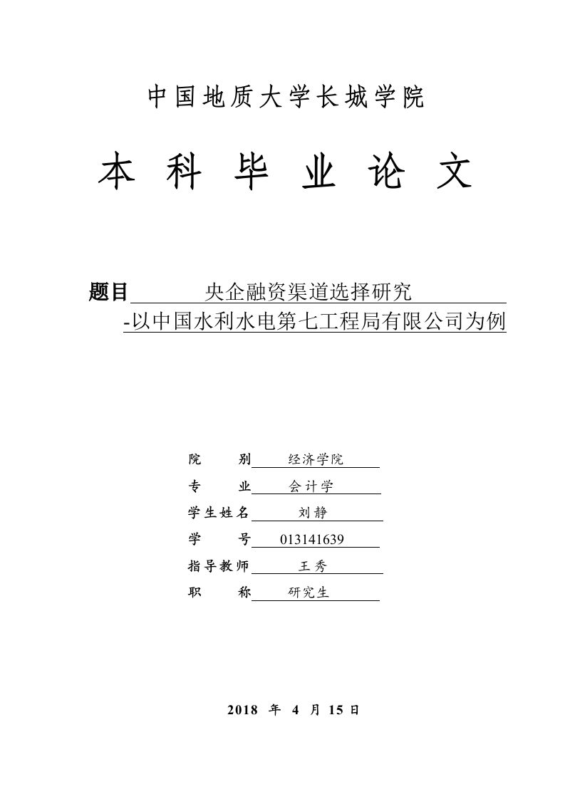 中国地质大学长城学院本科毕业论文题目央企融资渠道选择研究-以中国水利水电第七工程局有限公司为例院别经济学院专业会计学学生姓名刘静学号013141639指导教师王秀职称研究生2018年4月15日本科毕业生毕业论文(设计)诚信承诺书毕业论文央企融资渠道选择研究-以中国水利水电第七工程(设计)题目局有限公司为例学生姓名刘静专业会计学学号013141639指导老师王秀职称研究生所在院别经济学院诚信承诺本人慎重承诺和声明:我承诺在毕业论文(设计)活动中遵守学校有关规定,恪守学术规范,在本人的毕业论文中不剽窃、抄袭他人的学术观点、思想和成果,不篡改研究数据,如有违规行为发生,我愿承担一切责任,接受学校的处理。学生(签名):年月日中国地质大学长城学院毕业论文任务书学生姓名刘静学号013141639专业班级会计学十六班指导教师王秀职称研究生单位中国地质大学长城学院毕业论文央企融资渠道选择研究-以中国水利水电第七工程局有限公司为例题目毕业论文主要内容和要求:主要内容:本文主要分析央企融资渠道的选择问题,首先对央企融资的概念进行概述,分析融资方式,然后从直接融资、间接融资、以及影响融资相关指标等方面进行经营状况分析,剖析央企融资渠道存在企业融资渠道选择空间有限、融资渠道选择时效性差以及融资渠道选择后资金支用受控等原因,最后提出完善委托代理条件下的央企投融资制度、构建央企多层次的融资体系、健全投融资的市场化治理等防范措施。要求:论文撰写要求思路清晰、内容充实、论点明确,论据充分,论证严密,语言通顺。撰写论文前应首先阅读相关的研究资料,掌握学术前沿动态,对相关理论著作要很好的把握,提高理论水平及思想深度。根据开题报告和老师提出的意见对论文提纲进行修改,确定大纲后认真撰写毕业论文。撰写论文结束后要根据老师的修改意见,认真反复的修改论文,并按照要求参加毕业论文的答辩,严格按照论文进度安排进行论文的写作。论文的格式、字数等撰写方面的要求参照《中国地质大学长城学院毕业论文(设计)撰写规范》。毕业论文主要参考文献[1]徐婧,PPP模式在海绵城市建设中的应用研究).经济研究导刊,2017(36):104-105.[2]余梦阳,新常态下国企融资的对策研究).现代营销(下旬刊),201711):5[3)何鸣敏,加强国有企业资金管理的创新研究).会计师,201719)35-36.[4沈赫,国企改革背景下商业银行投行业务机会与挑战).中国市场,2017(35)39-42.[5]赵嘉,资产证券化在推进国有企业改革中的应用).财会学习,2017(23)210.[6张欣,“一带一路”背景下国有企业海外并购的趋势、挑战与对策).国际贸易,201711)3440.[7]全伟,供应链金融融资模式分析及风险控制研究).经贸实践,2018(01)127-128.[⑧]崔君平,鲁梅.公私合作PPP)对辽宁国有企业投融资模式的影响研究一一以辽宁城际铁路投融资模式为例.中国商论,2015(34):135-137.[9]杨红,国有企业投融资问题的分析与探讨凹.经贸实践,201702):59-61.[10]陈恩伍,浅谈新经济环境对国有企业融资的影响).经贸实践,2017(22):160.[11]陈宜炬.国有建筑企业参与PPP项目的融资问题及应对策略).国际商务财会,201711):27-29[12]Phua Kai Hong.Govemance Issues in Health Financing[M].Elsevier Inc.:2017(06):15.[13]Ali Mostafavi,Dulcy Abraham,Antonio Vives.Exploratory Analysis of Public Perceptions of InnovativeFinancing forInfrastructure Systems in the U.S.[J].Transportation Research Part A,2014(05):70.