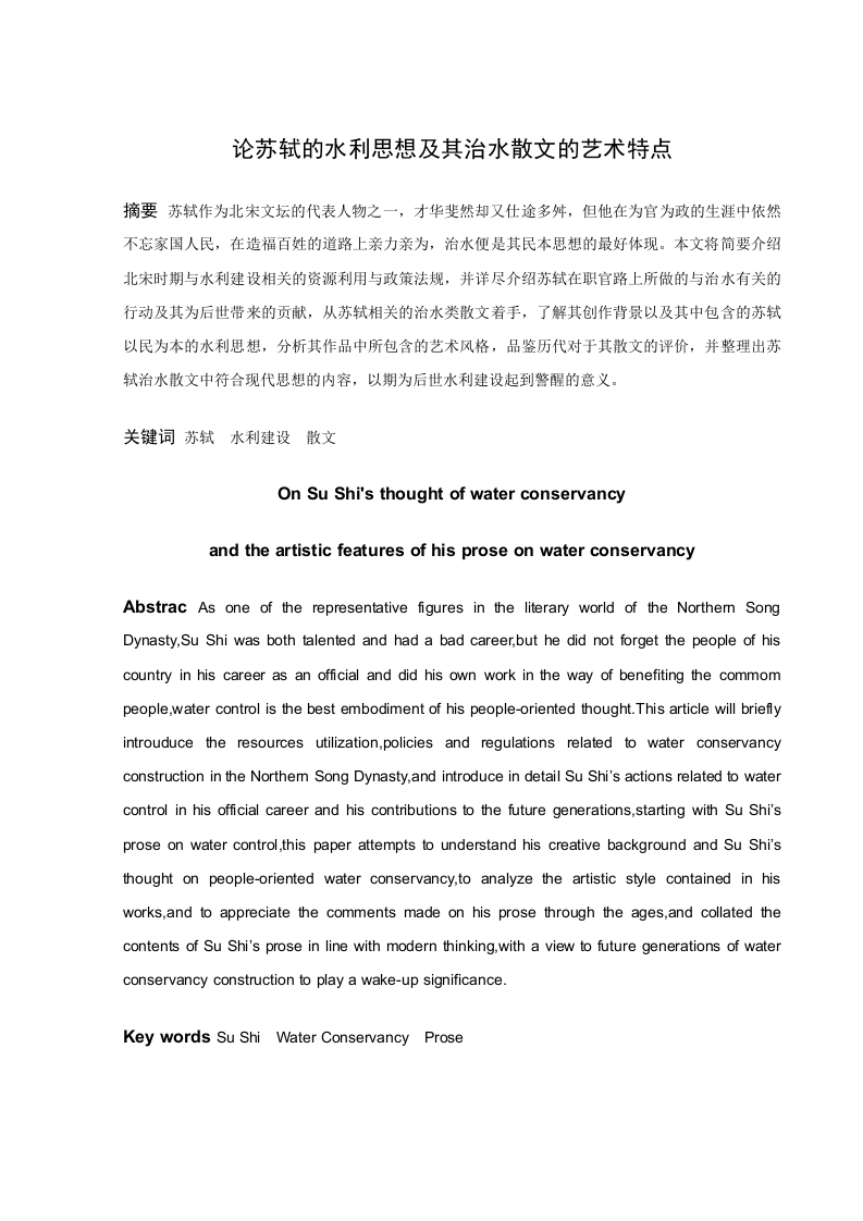 论苏轼的水利思想及其治水散文的艺术特点摘要苏轼作为北宋文坛的代表人物之一,才华斐然却又仕途多舛,但他在为官为政的生涯中依然不忘家国人民,在造福百姓的道路上亲力亲为,治水便是其民本思想的最好体现。本文将简要介绍北宋时期与水利建设相关的资源利用与政策法规,并详尽介绍苏轼在职官路上所做的与治水有关的行动及其为后世带来的贡献,从苏轼相关的治水类散文着手,了解其创作背景以及其中包含的苏轼以民为本的水利思想,分析其作品中所包含的艺术风格,品鉴历代对于其散文的评价,并整理出苏轼治水散文中符合现代思想的内容,以期为后世水利建设起到警醒的意义。关键词苏轼水利建设散文On Su Shi's thought of water conservancyand the artistic features of his prose on water conservancyAbstrac As one of the representative figures in the literary world of the Northem SongDynasty,Su Shi was both talented and had a bad career,but he did not forget the people of hiscountry in his career as an official and did his own work in the way of benefiting the commompeople,water control is the best embodiment of his people-oriented thought.This article will brieflyintrouduce the resources utilization,policies and regulations related to water conservancyconstruction in the Northem Song Dynasty,and introduce in detail Su Shi's actions related to watercontrol in his official career and his contributions to the future generations,starting with Su Shi'sprose on water control,this paper attempts to understand his creative background and Su Shi'sthought on people-oriented water conservancy,to analyze the artistic style contained in hisworks,and to appreciate the comments made on his prose through the ages,and collated thecontents of Su Shi's prose in line with modern thinking,with a view to future generations of waterconservancy construction to play a wake-up significance.Key words Su Shi Water Conservancy Prose目录引言一、苏轼治水类散文的概况(一)北宋时期的水利背景(二)治水类散文的创作过程(三)苏轼职官与水利的关系二、苏轼治水类散文的文体类型(一)策论类(二)记类(三)状类4三、苏轼治水类散文的思想内容(一)关于西湖治理问题5(二)关于水利工程问题5(三)关于治水政策问题6四、苏轼治水类散文中“情”“理”“和”“实”的艺术特点(一)“情”在苏轼治水散文中的体现6(二)“理”在苏轼治水散文中的体现7(三)“和”与“实”在苏轼治水散文中的体现7五、苏轼治水类散文的评价及其意义8(一)历代对苏轼治水类散文的评价8(二)现实启发及意义9参考文献致谢引言苏轼(1037-1101),字子瞻,号东坡居士,是北宋时期著名的文学家、政治家。他的一生中仕途之路走得尤为坎坷,显赫时曾宫至礼部尚书,落魄时则贬谪惠州、儋州。无论是处于天南的杭州、黄州,还是属于地北的凤翔、徐州,都曾留下苏轼勤政亲民的故事。苏轼并不顺利的仕途生涯导致他在政治方面的成就并不出彩,可他却是一名出色的治水大家,古往今来多数的学者对其在水利方面的贡献接触甚少,其实在阅读《苏轼评传》等史籍资料时可以发现:苏轼的一生都在关注着水利建设,兴治水利是实现其救世济民思想的重要举措,他多次参与抗洪救灾、治理河道、挖凿沟渠等治水实践,并为后人留下了宝贵的治水经验。本论文将从苏轼的治水背景出发,通过研究其治水之作以及散文中涉及到的治水政策,对其散文特点及水利思想进行探讨,让后世的人知晓苏轼不仅仅有着超然的品格,更有一颗为民治灾的爱国之心。一、苏轼治水类散文的概况在中国古代社会的发展中,北宋王朝是极为关键的一环。农业作为立国之本、强国之基,有着十分重要的地位,因此北宋政府对于农田水利的规划建设十分看重,并且修订和颁布了众多与此相关的法律条文,其规模和程度远远超过前代。在这样一个大背景下,加上苏轼本身所具有的民本思想,他对于水利建设有着独特的见解。苏轼的水利书写不仅仅是他长期任职各地经历的体现,还丰富了其散文的内容。(一)北宋时期的水利背景北宋王朝当政期间开发的水系主要有长江、淮河和黄河水系。黄河作为中华民族的母亲河,历来是执政者着重开发、经营、利用之地,而长江流域自隋唐时期迅速地发展,成为北宋财赋的主要来源,淮河水系的开发也逐渐成熟,于是这三大流域的兴建成为北宋政府水利建设的开端。从《北宋·河渠志》的有关记录来看,当时北宋的水利建设以京畿地区、河北路地区以及陕西关中平原为主的北方为重点,这与水资源的分布是息息相关的。以河北路为例,“雄州城南,陂塘数十里,芰荷极望。以小舫游其间,鸥鹭往来,红香泛于樽俎,虽江乡亦无此景。”四一句中所描述的便是该地区水资源丰富,一些地区的水生态环境甚至比有“水乡”之称的江南更为优越,因此[1]庞元英:《文昌杂录(卷四)》,郑州:大象出版社,2006年版,第157页。