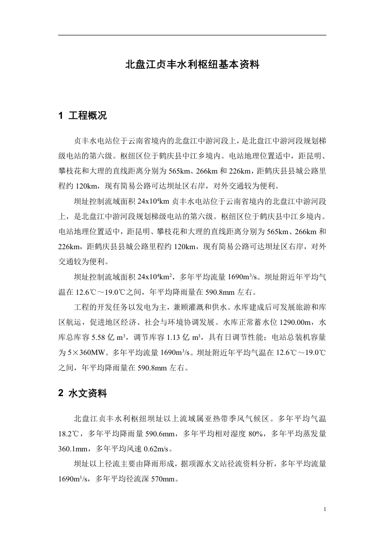 北盘江贞丰水利枢纽基本资料1工程概况贞丰水电站位于云南省境内的北盘江中游河段上,是北盘江中游河段规划梯级电站的第六级。枢纽区位于鹤庆县中江乡境内。电站地理位置适中,距昆明、攀枝花和大理的直线距离分别为565km、266km和226km,距鹤庆县县城公路里程约120km,现有简易公路可达坝址区右岸,对外交通较为便利。坝址控制流域面积24x10km贞丰水电站位于云南省境内的北盘江中游河段上,是北盘江中游河段规划梯级电站的第六级。枢纽区位于鹤庆县中江乡境内。电站地理位置适中,距昆明、攀枝花和大理的直线距离分别为565km、266km和226km,距鹤庆县县城公路里程约120km,现有简易公路可达坝址区右岸,对外交通较为便利。坝址控制流域面积24x10km2,多年平均流量1690m3/s。坝址附近年平均气温在12.6℃~19.0℃之间,年平均降雨量在590.8mm左右。工程的开发任务以发电为主,兼顾灌溉和供水。水库建成后可发展旅游和库区航运,促进地区经济、社会与环境协调发展。水库正常蓄水位1290.00m,水库总库容5.58亿m3,调节库容1.13亿m,具有日调节性能:电站总装机容量为5×360MW。多年平均流量1690ms。坝址附近年平均气温在12.6℃~19.0℃之间,年平均降雨量在590.8mm左右。2水文资料北盘江贞丰水利枢纽坝址以上流域属亚热带季风气候区。多年平均气温18.2℃,多年平均降雨量590.6mm,多年平均相对湿度80%,多年平均蒸发量360.1mm,多年平均风速0.62m/s。坝址以上径流主要由降雨形成,据项源水文站径流资料分析,多年平均流量1690ms,多年平均径流深570mm。1流域有贞丰雨量站,附近流域有中江雨量站,其中中江站距坝址较近,1957年建站至今已有近50年历史。根据气象站(台)的气象要素统计分析,流域内的主要气象要素为:气温:流域内多年平均气温为20.5℃,上游高山区年平均气温约低1一2℃:以7月份平均气温29.4℃为最高,元月份平均气温15.7℃为最低:历史极端最高气温为31.06℃(1953年8月11日),极端最低气温-3℃(1990年12月29日)。湿度:流域内多年平均相对湿度80%。蒸发:流域内多年平均蒸发量为360.1mm(¢20Cm蒸发皿)。日照:流域内多年平均日照小时数1977.6h,上游高山区约少100一200小时。无霜期:流域内多年平均无霜期252天左右,上游区略少。冰冻:每年十二月到次年二月易出现冰冻现象,每次冰冻期一般仅几十小时,连续几天冰冻的现象很少:每年的1一3月常出现降雪,但降雪量不大,形成积雪时间很短:多年平均冰冻时间为30天。风向与风速:多年平均风速0.62m/s,瞬时最大风速10.3m/s以上,各月平均风速在0-1.3ms之间,冬季盛行北风,夏季盛行偏南风,因流域四周环山,静风占各有风向一半以上。降水:本区域属季风气候区,降水丰富,多年平均降水量为590.6m,降雨年际变化较大,最大报降雨量为1954年的936.2mm,最少为1971年的356.8mm,最大年降水量为最少年降水量的2.62倍降水在年内分配不均匀,降水集中在4一6月,降水量占全年50%左右,7一9月为台风雨,降水量次之,占全年20%,1一3月份雨量占全年20%,10-12月降雨占全年10%左右坝址控制流域面积24×10km2,多年平均流量1690ms。坝址及下游控制断面不同频率下洪水流量见表1。表1不同频率下来流洪水流量表洪水频率5P(%)0.020.10.20.52050流量(m3/s)193001690015900145001340010800836064302本阶段各坝、厂址水位流量关系曲线均采用水力学公式计算。河道大断面采用实测的大断面,中、低水部分以实测水面线为控制,糙率按实地踏勘了解的河段地形、河床组成、植被等情况,结合《天然河道糙率表》取值为0.042。推算的水位流量关系曲线见表2,表中下游控制断面在坝线下游900m,水位库容关系见表3。表2北盘江贞丰电站坝址水位流量关系曲线水位(m)1212.501218.91225.11230.881231.51233.621236.46流量(m/s)01960463064307560836010800水位(m)1239.281240.381241.481242.811243.931244.891245.25流量(m/s)13400145001590016900178001850019800表3北盘江贞丰电站坝址水位库容关系曲线单位:ms水位(m)库容(亿m)水位(m)水位(m)0.00061212.50.68711245.03.21061281.00.01511214.00.84191249.03.72671285.00.05551217.01.01991253.04.30631289.00.10741221.01.22341257.05.33431293.00.17001225.01.45331261.05.67721297.00.24461229.01.71231265.06.47951301.00.33211233.02.01001269.07.37461305.00.43471237.02.35691273.08.38291309.00.55251241.02.75541277.03