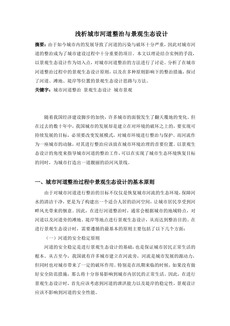 浅析城市河道整治与景观生态设计摘要:由于如今城市内的发展导致了河道的污染与破坏十分严重,因此对城市河道的整治成为了城市建设过程中十分重要的项目。本文以理论结合实例的手段,以景观生态设计作为切入点,对城市河道整治的方法进行了讨论。分析了在城市河道整治过程中的景观生态设计原则,以及在多种原则影响下的整治措施,探讨了河道、滩地、堤岸等位置的景观生态设计思路与方法。关键字:城市河道整治景观生态设计城市景观随着我国经济建设脚步的加快,许多城市的面貌发生了翻天覆地的变化。但在过去的数十年中,我国城市的发展却是建立在对环境的破坏之上的,要实现可持续发展的目标,必须要改变发展模式,对城市环境进行整治与保护。而河流作为一座城市的动脉,对其进行整治应该放在城市环境治理的首要位置。以景观生态设计的角度来指导城市河道的整治工作,可以在实现了城市生态环境恢复目标的同时,为城市打造出一道靓丽的沿河风景线。一、城市河道整治过程中景观生态设计的基本原则由于对城市河道进行整治的目标不仅仅是恢复城市河流的生态环境,保障河水的清洁干净,更是为了构建出一个适合人居的沿河空间,让城市居民享受到河畔风光带来的惬意。因此,在进行河道整治时,通常会根据城市的地域特点,对河道以及河道旁的难地、堤岸等地点进行景观生态设计,从而达到整治目的。在进行景观生态设计时,需要遵循的最基本的原则主要包括了以下几个方面:(一)河道的安全稳定原则河道的安全稳定是进行景观生态设计的基础,也是保证城市居民正常生活的根本。从古至今,我国就有许多城市建立在河流旁,河流是城市发展的源动力,但同时也对城市带来了一定的破坏作用。特别是在汛期来临的时候,如果没有做好安全防范措施,那么将十分容易影响到城市内居民的正常生活。因此,在进行景观生态设计时,首先应该考虑到河道的泄洪能力以及堤岸的稳定性,景观设计应该不影响到河道的安全性能。(二)河道的自然生态原则在当今城市工业发展的影响下,有许多河道的自然生态环境都发生了很大程度上的改变,生态环境的破坏达到了难以恢复的地步。在进行景观生态设计时,最为重要的就是要让河道的自然生态环境恢复正常,保证河道的生态性。对于存在着自然蜿蜒曲折现象的河道以及深浅不一的河床,在一般情况下并不进行大幅度的改动,突出河流的自然特性。而在此基础之上,河道两旁的自然群落应该尽可能丰富,满足多种动植物的栖息要求,让河道两旁的环境能够达到最适宜人类居住的目标。(三)河道的美学观赏原则当今人们的生活水平得到了提高,在茶余饭后,于河道旁欣赏河畔景色,流连于河水之上的美景,成为了许多人的共同追求。因此,在进行景观生态设计时,满足河道的安全性与生态性只能够让河道治理具有了基本骨架,在充分考虑到河道的观赏价值之后,才能够让河道治理变得有血有肉,让河畔美景成为城市中最为独特的一道风景线。在有条件的情况下,对河道景观的设计不仅仅局限于河畔,还存在于河流之上,通过在河流之上进行景观设计的方法,可以让河道景色更加迷人。(四)河道的历史文化原则如果说安全性、生态性以及美观性等让河道的治理具有了骨架与血肉的话,那么历史文化就能够让河道的治理具有灵魂。自古以来,河流就养育了无数的城市人,河流在人们心目中的地位不仅仅是排放生活污水的通道或者观赏河畔景色的媒介,更是许多城市的象征。特别是在一些依河而建的城市中,河流更是成为了城市居民心中的图腾,具有不可替代的地位。在进行河道的景观生态设计时,不仅要考虑到许多河道所共有的安全、生态、美观特点,更要结合城市的历史文化特点,在河道中以及河道两旁突出文化特色,让人们在看到河畔景色的第一眼,就能够发现这座城市所具有的特点。二、城市河道治理景观生态设计的主要内容在上文所提到的几点原则的基础上,可进行城市河道景观生态的设计,并根据设计内容实施具体的治理措施。在本文中,所选取的研究对象为我国南方某建立在一条河流之上的中型城市,在进行景观生态设计时,主要从河道的不同位置,将设计内容分为了河道、难地以及堤岸等三个部分。(一)河道上的景观生态设计与治理对河道部分的设计主要指的是河流区域的设计,也就是对河床以及河流水质的改善。在一般情况下,对河床进行设计最为重要的就是保证河流的自然特性,对于存在着蜿蜒曲折的河段,应该保持其特性,尽量不做较大的改变。在此基础之上,可以针对于河流的具体情况,进行淤泥的清除,让河流的泄洪能力能够得到恢复。在条件允许的前提下,可以在河流之上建立水上公园,为人们提供水上休闲、划船、游泳等娱乐活动服务。另外,对于河床滩涂高低深浅不一致的现象,通常并不进行很大的干预,而是在原有河床的基础上进行景观设计,保持河道生态的多样性。同时,要对河道中出现了堵塞的区域进行及时的疏通,让河水真正变为流动的“活水”,恢复河流的生命活力。(二)滩地上的景观生态设计与治理在河道系统中,滩地是非常特殊的一部分,在进行设计时通常需要根据具体的滩地类型特殊对待。一般将河道中的滩地分为两类,一类是常年被少量河水淹没的低滩地,另一类是只在汛期才被