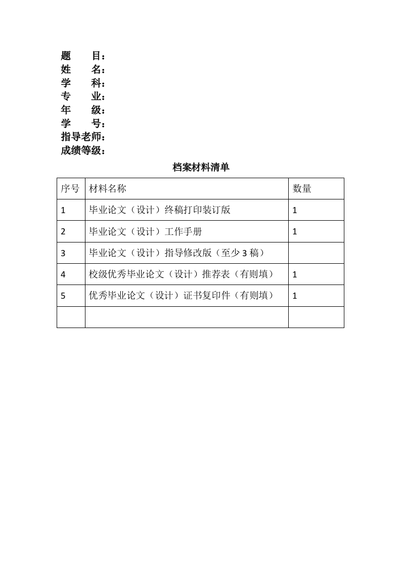 题姓学专年名:科级指导老师:成绩等级:档案材料清单序号材料名称数量1毕业论文(设计)终稿打印装订版12毕业论文(设计)工作手册13毕业论文(设计)指导修改版(至少3稿)校级优秀毕业论文(设计)推荐表(有则填)15优秀毕业论文(设计)证书复印件(有则填)1
