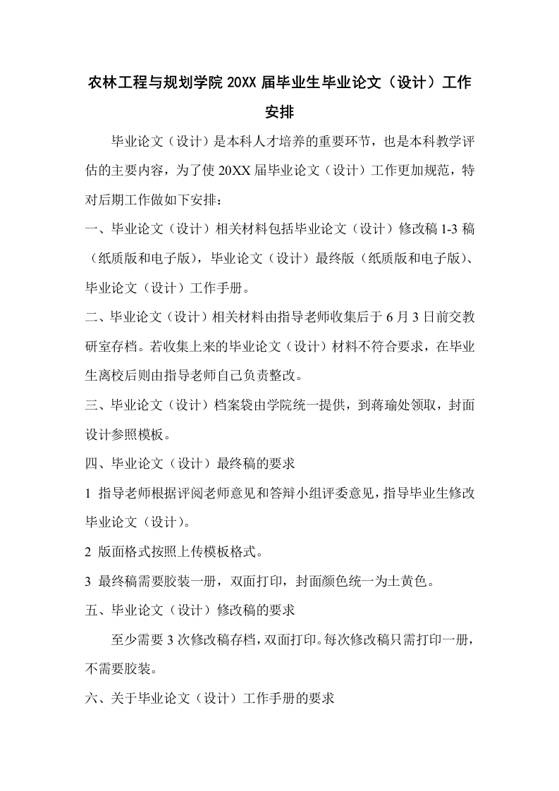 农林工程与规划学院20X届毕业生毕业论文(设计)工作安排毕业论文(设计)是本科人才培养的重要环节,也是本科教学评估的主要内容,为了使20XX届毕业论文(设计)工作更加规范,特对后期工作做如下安排:一、毕业论文(设计)相关材料包括毕业论文(设计)修改稿1-3稿(纸质版和电子版),毕业论文(设计)最终版(纸质版和电子版)、毕业论文(设计)工作手册。二、毕业论文(设计)相关材料由指导老师收集后于6月3日前交教研室存档。若收集上来的毕业论文(设计)材料不符合要求,在毕业生离校后则由指导老师自己负责整改。三、毕业论文(设计)档案袋由学院统一提供,到蒋瑜处领取,封面设计参照模板。四、毕业论文(设计)最终稿的要求1指导老师根据评阅老师意见和答辩小组评委意见,指导毕业生修改毕业论文(设计)。2版面格式按照上传模板格式。3最终稿需要胶装一册,双面打印,封面颜色统一为土黄色。五、毕业论文(设计)修改稿的要求至少需要3次修改稿存档,双面打印。每次修改稿只需打印一册,不需要胶装。六、关于毕业论文(设计)工作手册的要求1按照专业模板进行,不要调整模板的字体、行间距。2单面打印,不需要添加页码。3注意时间节点。七、评为优秀毕业论文的需及时填写优秀毕业论文推荐表,经学校审核后,连同优秀毕业论文证书装入毕业论文档案袋中。八、毕业生把毕业论文(设计)相关材料全部上交后,指导老师才能在《农林工程与规划学院20X届毕业生毕业论文材料上交清单》上签字,毕业生必须拿有指导老师签字的《清单》才能到李兢处办理离校手续。农林工程与规划学院学院教务科2017.3.13