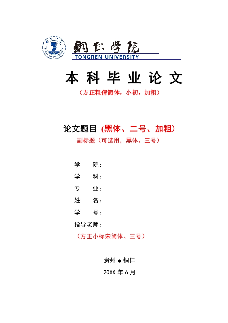 TONGREN UNIVERSITY本科毕业论文(方正粗倩简体,小初,加粗)论文题目(黑体、二号、加粗)副标题(可选用,黑体、三号)学院:学科:专业:姓名:学号:指导老师:(方正小标宋简体、三号)贵州·铜仁20XX年6月TONGREN UNIVERSITY水利水电工程专业本科华业论文贵州。铜仁20XX年6月水利水电工程专业20XX届本科毕业论文目录摘要………………………………………………………………………I文献综述……………………正文………………………………………………………2附录…1