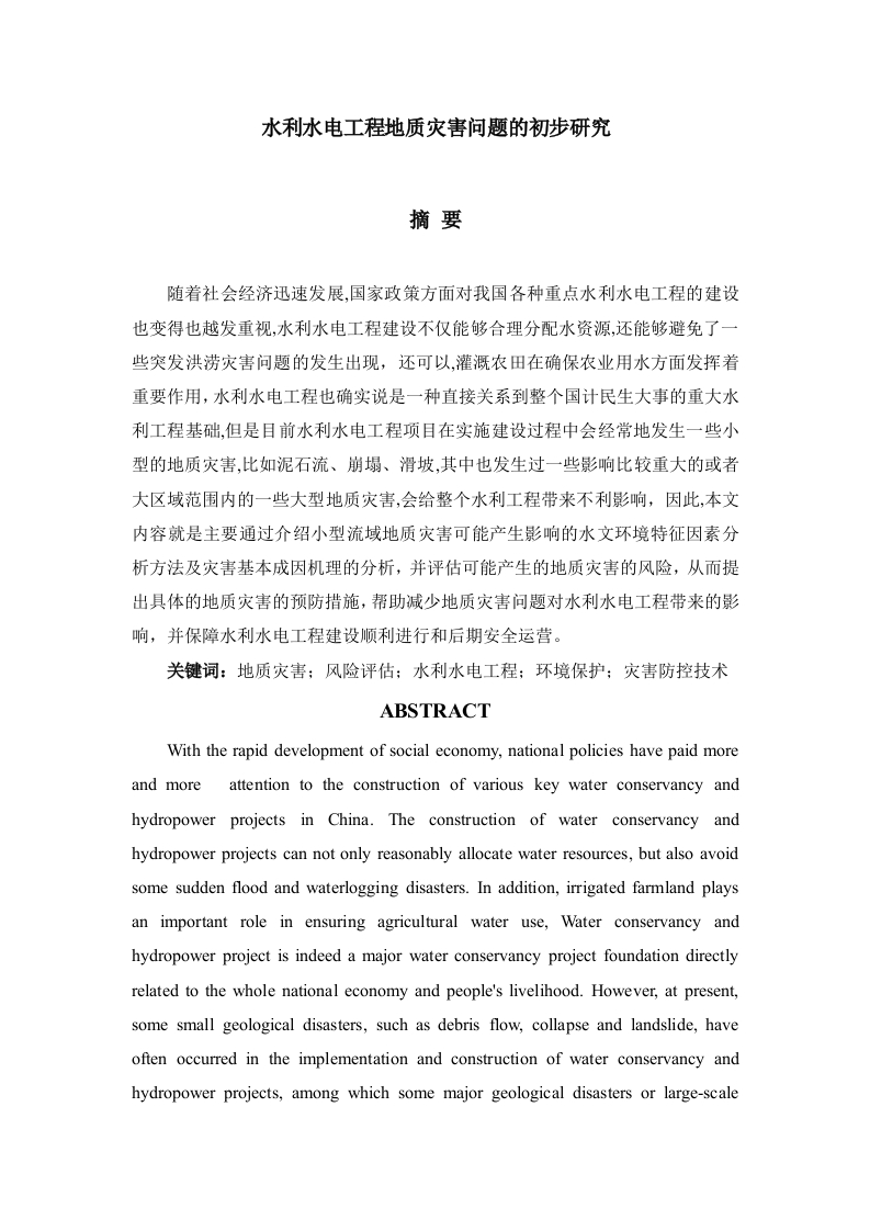 水利水电工程地质灾害问题的初步研究摘要随着社会经济迅速发展,国家政策方面对我国各种重点水利水电工程的建设也变得也越发重视,水利水电工程建设不仅能够合理分配水资源,还能够避免了一些突发洪涝灾害问题的发生出现,还可以,灌溉农田在确保农业用水方面发挥着重要作用,水利水电工程也确实说是一种直接关系到整个国计民生大事的重大水利工程基础,但是目前水利水电工程项目在实施建设过程中会经常地发生一些小型的地质灾害,比如泥石流、崩塌、滑坡,其中也发生过一些影响比较重大的或者大区域范围内的一些大型地质灾害,会给整个水利工程带来不利影响,因此,本文内容就是主要通过介绍小型流域地质灾害可能产生影响的水文环境特征因素分析方法及灾害基本成因机理的分析,并评估可能产生的地质灾害的风险,从而提出具体的地质灾害的预防措施,帮助减少地质灾害问题对水利水电工程带来的影响,并保障水利水电工程建设顺利进行和后期安全运营。关键词:地质灾害:风险评估:水利水电工程:环境保护:灾害防控技术ABSTRACTWith the rapid development of social economy,national policies have paid moreand more attention to the construction of various key water conservancy andhydropower projects in China.The construction of water conservancy andhydropower projects can not only reasonably allocate water resources,but also avoidsome sudden flood and waterlogging disasters.In addition,irrigated farmland playsan important role in ensuring agricultural water use,Water conservancy andhydropower project is indeed a major water conservancy project foundation directlyrelated to the whole national economy and people's livelihood.However,at present,some small geological disasters,such as debris flow,collapse and landslide,haveoften occurred in the implementation and construction of water conservancy andhydropower projects,among which some major geological disasters or large-scalegeological disasters within a large area have also occurred,which will have anadverse impact on the whole water conservancy project.Therefore,The content ofthis paper is mainly to introduce the analysis method of hydrological environmentcharacteristics and basic cause mechanism of geological disasters in small watershed,and evaluate the risk of possible geological disasters,so as to put forward specificpreventive measures for geological disasters,help reduce the impact of geologicaldisasters on water conservancy and hydropower projects,and ensure the smoothprogress of water conservancy and hydropower project construction and safeoperation in the later stage.Keywords:geological disaster;Risk assessment;Water conservancy andHydropower projects;environmental protection;Disaster prevention and controltechnology目录摘要…ABSTRACT...1第一章绪论,第二章水利水电工程地质灾害特征分析42.1水利水电工程地质灾害发育分类42.2水利水电工程地质灾害成因初步分析…5第三章水利水电工程对环境的影响分析…73.1水利水电工程建设项目对自然环境的影响73.2水利水电工程环境保护措施8第四章水利水电工程地质灾害风险评估…94.1地质灾害危险性评估概念和内容94.2水利工程地质危害风险评估等级和适用范围94.3水利工程实例分析…10第五章水利水电工程地质灾害防控技术和方法1251进行地质勘察,因地制宜工程设计…5.2进行地质评估,落实防控方法…125.3有效保障地质环境的基础上,完善工程建设质量管理制度135.4做好预测预报,进行有效处理13第大章结论致谢…16