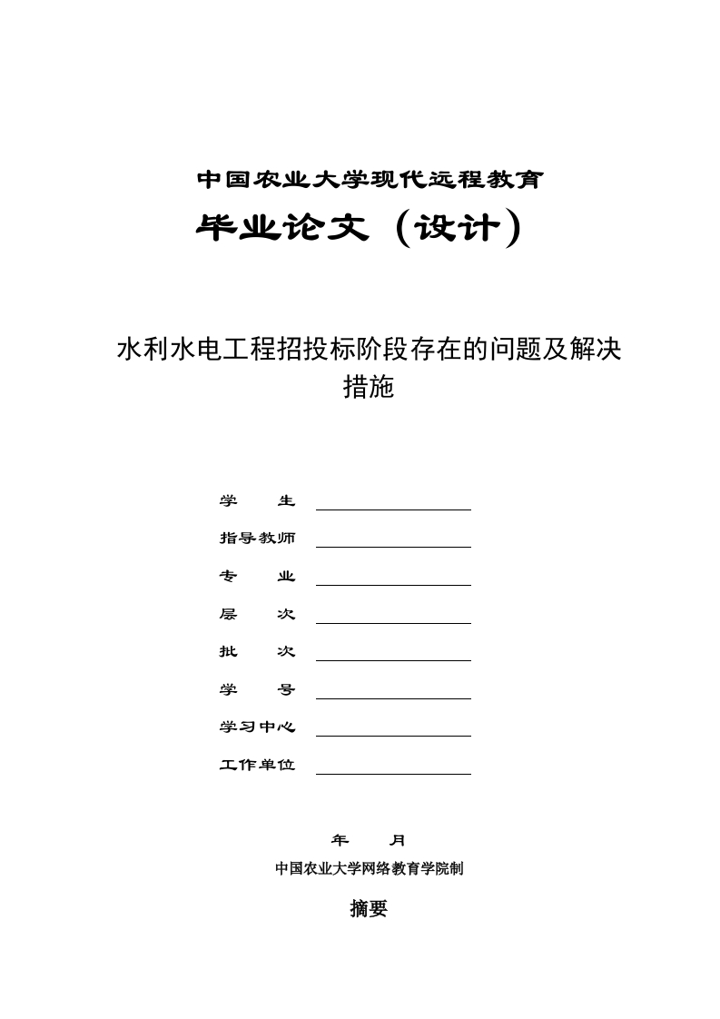 中国农业大学现代远程教育毕业论文(设计)水利水电工程招投标阶段存在的问题及解决措施学生指导教师专业层次批次学号学习中心工作单位年月中国农业大学网络教育学院制摘要在市场经济的发展下,我国建设工程招投标制度不断成熟。建设单位可以从中选择成本最低的承包商。承包商能够与其他企业公平竞争,从而使利益最大化。虽然水利水电工程行业在我国越来越好,但是在频繁的经济交易下水利水电工程招投标隐藏着很多的问题。本文就招投标案例入手,先介绍水利水电工程招投标相关概述进行,然后基于建设工程招投标模式在国际中带来的启示,简要分析了我国水利水电工程招投标中各参与方出现的问题。接着简要剖析产生问题的原因,为后期措施的提出提供一定支撑。最后,根据上述分析的影响因素,提出建议,以期达到让水利水电工程各参与方意识到违规行为所带来的影响,从而规范招投标活动中各参与方的行为,预防腐败行为避免违规现象,让水利水电工程建设更加科学、规范、有序地发展。关键词:水利水电工程:招标:投标:监管目录1绪论…1.1水利水电工程招投标阶段的研究背景..0 ...............1.3水利水电工程招投标阶段的研究意义…1.3.1保障建设项目按照规定流程实施.1.3.2建立市场竞争机制米提升企业竞争力.。21.3.3有利于我国建筑企业融入国际建筑市场22222.1.2水利水电工程招投标…2.1.3水利水电工程招标投标流程.2.1.4水利水电工程的招标方式。452.2.1提高工程建设质量....52.2.2降低工程成本.…62.2.3提高项承包方工作积极性..2.2.4实现建设单位的目标.…62.2.5促进工程建设工作创新和发展62.2.6促使施工单位不断提高自己63水利水电工程招投标阶段的主要问题..·3.1.1限制招标信总发布范围..73.1.2招标代理机构选择不规范.·73.1.3千方百计规避招标…3.2投标单位存在违规操作…3.2.1投标单位存在围标、串标的现象83.3.1执业水平低,专业水平差..83.3.2招标代理机构存在虚假招标的行为...3.3.3执业不规范,违规违纪…84解决水利水电工程招投标阶段主要问题的对策.941完善监管机制。94.1.1设立管理机制.9