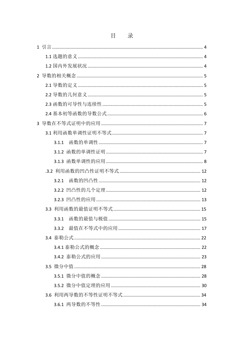 录1引言…1.1选题的意义…1.2国内外发展状况.42导数的相关概念.…2.1导数的定义…2.2导数的几何意义…2.3函数的可导性与连续性.52.4基本初等函数的导数公式.…63导数在不等式证明中的应用.…73.1利用函数单调性证明不等式…73.1.1函数的单调性…73.1.2函数的单调性证明…3.1.3函数单调性的应用….3.2利用函数的凹凸性证明不等式..123.2.1函数的凹凸性123.2.2凹凸性的几个定理…123.2.3凹凸性的应用.133.3利用函数的最值证明不等式…3.3.1函数的最值与极值….153.3.2最值在不等式中的应用..173.4泰勒公式…3.4.1泰勒公式的概念…223.4.2泰勒公式的应用.…233.5微分中值3.5.1微分中值的概念…283.5.2微分中值定理的应用.…3.6利用两导数的不等性证明不等式.343.6.1两导数的不等性…343.6.2两导数不等性的应用353.7利用导数的定义证明不等式.353.7.1导数的定义…3.7.2两种形式…3.8利用导数的几何意义证明不等式.373.8.1导数的几何意义37结论39参考文献40致谢41摘要:导数不管是在初等或是高等数学中都具备十分关键的地位。其关键作用就表明其具备非常广泛的使用范围。本文重点叙述导数在不等式证明中的使用。本文利用多道例题开展分析用导数高效证明不等式的多种方式,因此指出导数在不等式证明中的关键影响。关键词:导数:不等式证明:泰勒公式:微分中值定理:函数性质Abstract Derivative in elementary mathematics and higher mathematics plays a veryimportant role.In this paper,by way of example,summarizes three kinds of methods ofproving inequalities by this effective tool derivative,indicating the important role of derivativein the proof of inequality,Key words:derivatives the proof of inequality taylor formula the differential meanvalue theorem properties of function