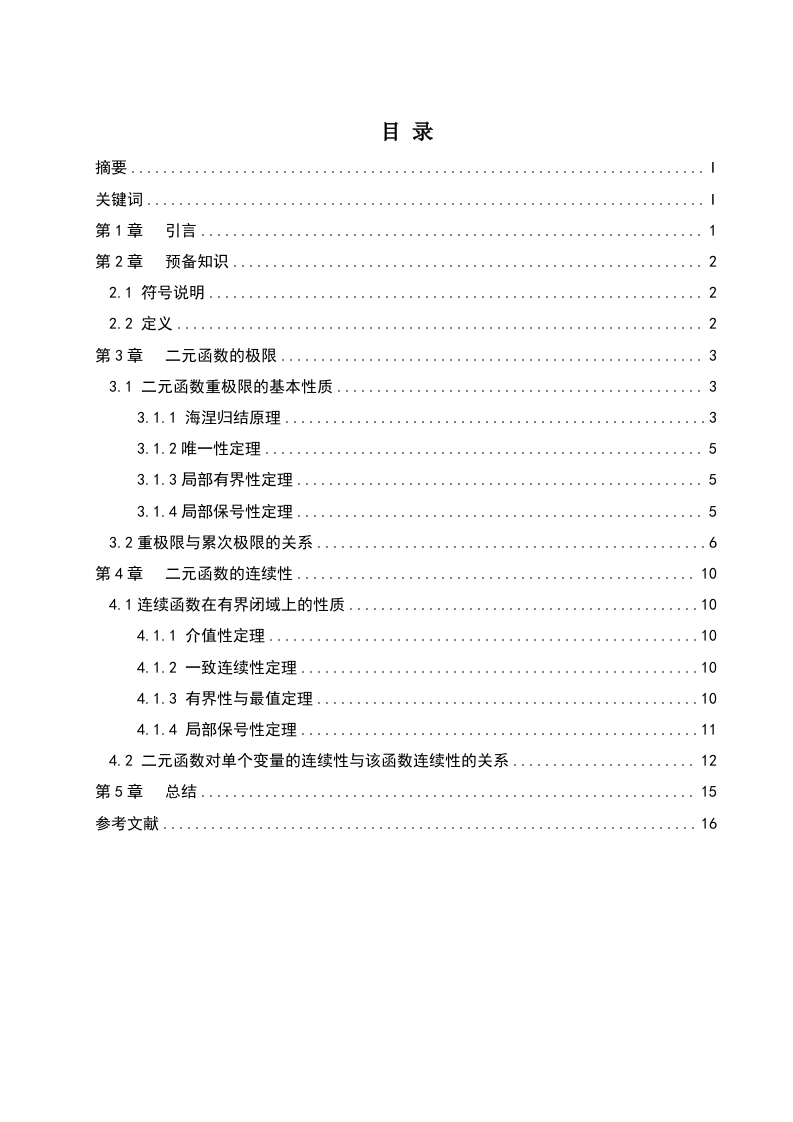 目录摘要第1章第2章预备知识22.1符号说明2第3章二元函数的极限3.1二元函数重极限的基本性质33.1.1海涅归结原理..53.1.3局部有界性定理...3.1.4局部保号性定理....5第4章二元函数的连续性....104.1连续函数在有界闭域上的性质104.1.1介值性定理104.1.2一致连续性定理..4.2二元函数对单个变量的连续性与该函数连续性的关系...…121516二元函数的极限与连续性狄花(数学与统计学院,2016级数学与应用数学3班)摘要:在多元函数的极限与连续性中,着重讨论了二元函数的极限与连续性.本文全面整理了二元函数的极限性质与连续性质,试讨论了二元函数的两个极限关系与连续性问题关键词:二元函数;极限;连续性Limit and Continuity of Binary FunctionsDI Hua(Class three,Grad 2016,Major of Mathematics and Applied Mathematics,College ofMathematics and Statistics)Abstract:In the Limit and Continuity of Multivariate Functions,The Limit and Continuity ofBinary Functions are discussed emphatically.In this paper,The Limit Properties and ContinuousProperties of Binary Functions are comprehensively sorted out,Two Limit relations andContinuity problems of Binary Functions are discussed.Keywords:Binary Functions;Limit;Continuity西北师范大学本科毕业论文第1章引言函数是数学领域的一个主要研究对象,作为多元函数中最简单的一类函数,二元函数一直用来当作打开多元函数领域的敲门砖.例如在多元函数的极限与连续性以及多元函数微分学中,都以二元函数为研究对象,建立了二元函数的相关概念二元函数的极限与连续性是多元函数领域的基础,因此许多文献也对其进行了论述,研究方向大多围绕二元函数极限的求法,二元函数的重极限与累次极限的关系[5],二元函数的极限与连续的关系,二元函数的单个变量连续与函数连续的关系[4]等,也有些文献对一元函数和二元函数的相关概念进行了对比,得出了一元函数和二元函数的一些异同点.在《数学分析》一书中,也将重点放在了二元函数的极限求法和几个重要问题上,并未对二元函数的极限性质与连续性质进行系统的总结,凡是有关内容都进行了简写,或者让读者对比一元函数的相关性质自行进行补充.由于二元函数产生了一些自己所独有的性质,因此需要我们在一元函数相关性质的基础上,探讨一下二元函数的连续性质与极限性质.与此同时,对二元函数的两个极限问题和二元函数的单个变量连续性与函数连续性问题进行探讨,从而更好的掌握二元函数的极限与连续性,这也有有助于快速打开多元函数领域的大门