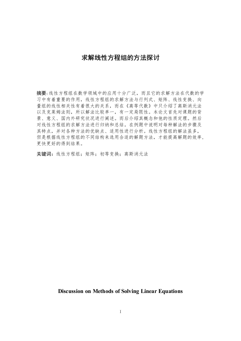 求解线性方程组的方法探讨摘要:线性方程组在数学领域中的应用十分广泛,而且它的求解方法在代数的学习中有着重要的作用,线性方程组的求解方法与行列式、矩阵、线性变换、向量组的线性相关性有着很大的关系,而在《高等代数》中只介绍了高斯消元法以及克莱姆法则,所以解法比较单一,有一定局限性。本论文首先对课题的背景、意义、国内外研究状况进行阐述。而后介绍其概念和他的性质定理。然后对线性方程组的求解方法进行归纳和总结。在例题中说明对每种解法的步骤及其特点,并对各种方法的优缺点、适用性进行分析。线性方程组的解法虽多,但是根据线性方程组的不同结构来选用合适的解题方法,才能提高解题的效率,更快更好的得到结果。关键词:线性方程组;矩阵;初等变换;高斯消元法Discussion on Methods of Solving Linear EquationsAbstarct:Linear equations are widely used in mathematics,and its solution plays an important role in learning algebra.The method of solving linear equations has a great relationship with determinant,matrix,linear transformation and linear correlation of vector groups.However,only gauss elimination and Cramer's Law are introducedin Advanced Algebra,so the solution is relatively simple and has certain limitations.Firstly,this paper expounds the background,significance and research status at home and abroad of the subject.Then the concept and his property theorem are introduced.Then,the methods of solving the linear equations are summarized.In the examples,the steps and characteristics of each method are explained,and the advantages,disadvantages and applicability of each method are analyzed.Although there are many solutions tolinear equations,only by choosing appropriate solutions according to different structures of linear equations can we improve the efficiency of solving problems and get better and faster results.Key words:linearequations;matrix;Elementary transformation;gausselimination目录1.1线性方程组的求解的背景及意义......1.2线性方程组国内外研究现状及评价·122.2线性方程组有无解的判定定理)2.3线性方程组的解的结构....32.3.1齐次方程组的解的结构..32.3.2非齐次方程组的解的结构..3.1高斯消元法......573.3克莱姆(Cramer)法则...·83.4逆矩阵解法103.5分块矩阵解法5-)123.6齐次线性方程组的基础解系求解方法.·133.7非齐次线性方程组化为齐次线性方程组方法网.…1417181.绪论1.1线性方程组的求解的背景及意义线性方程组求解在中国有着悠久历史,对线性方程组的研究,中国比欧洲至少早一千多年,记载于我国古代第一部数学专著《九章算术》的方程章。现行的《高等代数》及线性代数教材中只用高斯消元法和克莱姆法则来求解线性III