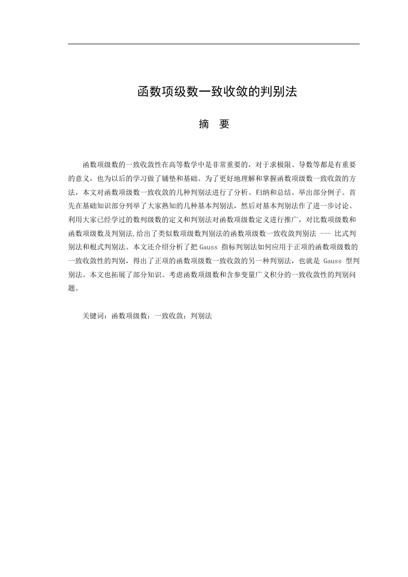 函数项级数一致收敛的判别法摘要函数项级数的一致收敛性在高等数学中是非常重要的,对于求极限、导数等都是有重要的意义,也为以后的学习做了铺垫和基础。为了更好地理解和掌握函数项级数一致收敛的方法,本文对函数项级数一致收敛的几种判别法进行了分析、归纳和总结。举出部分例子。首先在基础知识部分列举了大家熟知的几种基本判别法,然后对基本判别法作了进一步讨论。利用大家己经学过的数列级数的定义和判别法对函数项级数定义进行推广,对比数项级数和函数项级数及判别法,给出了类似数项级数判别法的函数项级数一致收敛判别法一比式判别法和根式判别法。本文还介绍分析了把Guss指标判别法如何应用于正项的函数项级数的一致收敛性的判别,得出了正项的函数项级数一致收敛的另一种判别法,也就是Guss型判别法。本文也拓展了部分知识。考虑函数项级数和含参变量广义积分的一致收敛性的判别问题。关键词:函数项级数:一致收敛:判别法目录引言…基础知识:正文内容5函数项级数的基本一致收敛性判别法.5比式判别法、跟式判别法.6正项级数收敛性Gauss指标判别法.11函数项级数一致收敛柯西准则的改进形式15结语参考文献:.17Discriminant Method For Uniform Convergence Of Series Of Function TermsABSTRACTIn order to better understand and master the method of uniform convergence offunction series,several discriminant methods of uniform convergence of functionseries are analyzed,summarized and summarized.First,the introduction lists severalbasic discriminant methods which are well known,and then discusses the basicdiscriminant methods further.In this paper,the definition of series of functionterms is generalized and compared with series of function terms and discriminantmethod.The discriminant method of uniform convergence of series of function termssimilar to series of number terms is given,which is ratio discriminant method androot discriminant method.This paper also introduces the Gauss index discriminantmethod applied to the discriminant of the uniform convergence of the series of positiveterms,and gives the Gauss type discriminant of the uniform convergence of the seriesof positive terms.In addition,the problem of judging the uniform convergence ofthe series of function terms and the generalized integral with parameter variablesis also considered.Key words:series of function terms;uniform convergence;discriminant method1