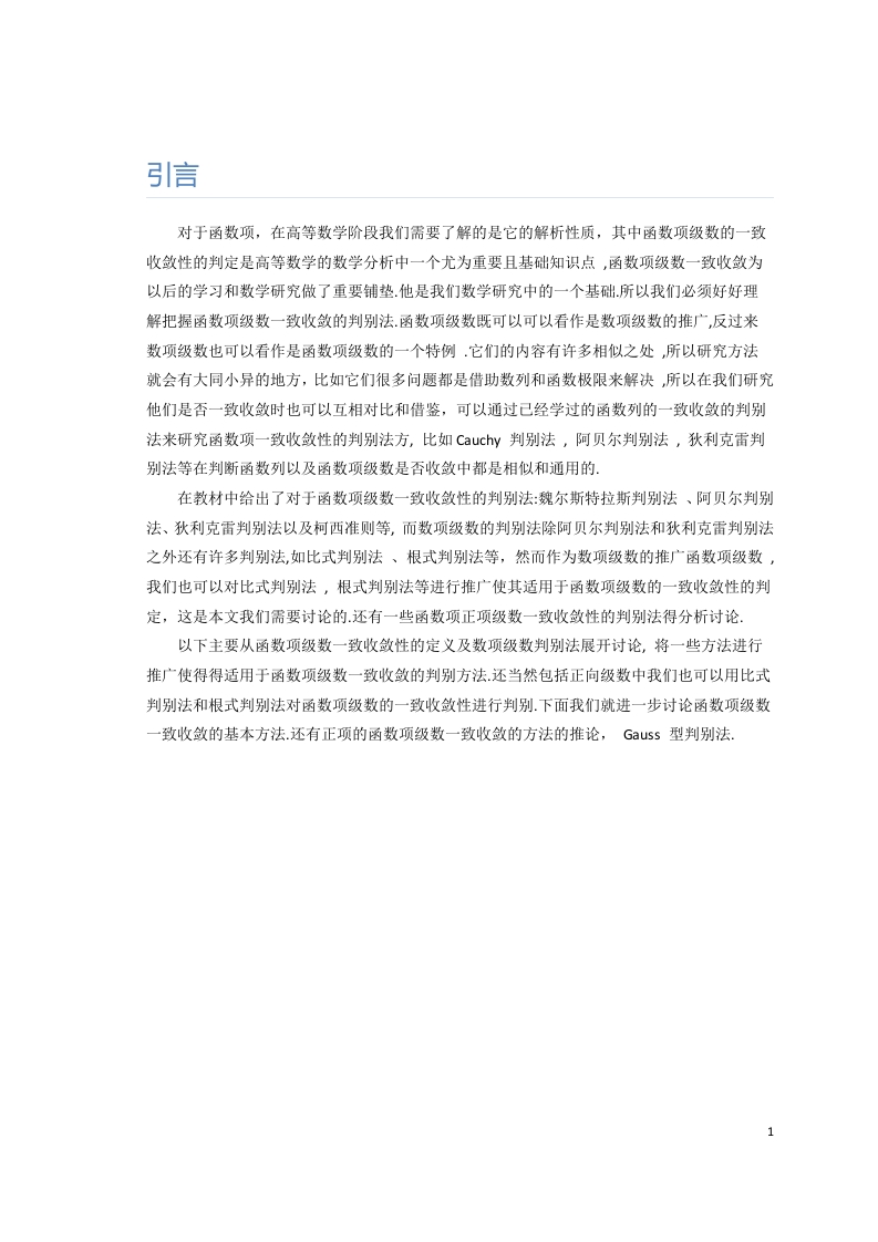 引言对于函数项,在高等数学阶段我们需要了解的是它的解析性质,其中函数项级数的一致收敛性的判定是高等数学的数学分析中一个尤为重要且基础知识点,函数项级数一致收敛为以后的学习和数学研究做了重要铺垫.他是我们数学研究中的一个基础.所以我们必须好好理解把握函数项级数一致收敛的判别法.函数项级数既可以可以看作是数项级数的推广,反过来数项级数也可以看作是函数项级数的一个特例.它们的内容有许多相似之处,所以研究方法就会有大同小异的地方,比如它们很多问题都是借助数列和函数极限来解决,所以在我们研究他们是否一致收敛时也可以互相对比和借鉴,可以通过己经学过的函数列的一致收敛的判别法来研究函数项一致收敛性的判别法方,比如Cauchy判别法,阿贝尔判别法,狄利克雷判别法等在判断函数列以及函数项级数是否收敛中都是相似和通用的.在教材中给出了对于函数项级数一致收敛性的判别法:魏尔斯特拉斯判别法、阿贝尔判别法、狄利克雷判别法以及柯西准则等,而数项级数的判别法除阿贝尔判别法和狄利克雷判别法之外还有许多判别法,如比式判别法、根式判别法等,然而作为数项级数的推广函数项级数,我们也可以对比式判别法,根式判别法等进行推广使其适用于函数项级数的一致收敛性的判定,这是本文我们需要讨论的还有一些函数项正项级数一致收敛性的判别法得分析讨论,以下主要从函数项级数一致收敛性的定义及数项级数判别法展开讨论,将一些方法进行推广使得得适用于函数项级数一致收敛的判别方法还当然包括正向级数中我们也可以用比式判别法和根式判别法对函数项级数的一致收敛性进行判别.下面我们就进一步讨论函数项级数一致收敛的基本方法.还有正项的函数项级数一致收敛的方法的推论,Gauss型判别法.1基础知识:函数项级数及其一致收敛性1.函数项收敛与函数项一致收敛的概念设{S,(x)}是定义在数集E上的函数项级数Σun(x)的部分和函数列,记的和函数,记为lim S(x)=S(x),x∈DCE,并称D为函数项级数的收敛域.类似{Sn(x)}}若D在上一致收敛于D,则称函数项级数∑u(x)在D上一直收敛2.一致收敛的柯西准则.函数项级数Σu(x)在数集D上一致收敛的充要条件为:对任给的正数&,总存在某自然数N,使得当n>N时,对一切x∈D和一切自然数p,都有S(x)-S,(x)<由此我们得到函数项级数∑u(x)在数集D上一致收敛的必要条件是函数列{un(x)}在D上一致收敛于零3.函数项级数在数集上一致收敛于的充要条件是:级数∑un(x)的余项.2正文内容对于函数项级数,研究其是否收敛非常关键,判断函数项级数是否具有一致收敛性在大学阶段是一个很重要的部分,可是在实际问题中判断函数项的一致收敛性也是很复杂的,所以我们需要重点研究该部分知识点,为以后的进一步的数学研究打下牢固的基础.当然利用上面的定义可以用来判别函数项是否一致收敛,但是一般情况下我们很难得到函数项级数的部分和,或无法得到函数项级数得部分和时就要寻找其他的方法,所以有的题目不能用定义来判别,故针对不同得题目就要用不同的方法,所以不能用定义来判断时就可以用下面几种判别函数项一致收敛的方法首先给出我们熟知的几种函数项级数一致收敛的判别法.在教材中学习过的几种对于函数项级数一致收敛性的熟知判别法:除定义法,柯西准则外,常用的方法有:魏尔斯特拉斯判别法、阿贝尔判别法、狄利克雷判别法等.还有推广的Dii定理.这些定理是我们己经学过和熟知地几种判别法.下面我们先复习巩固一下这些基本判别法.函数项级数的基本一致收敛性判别法1.维尔斯特拉斯判别法(或称判别法,优先级判别法)设函数项级数定义在数集D上,∑Mn为收敛的正项级数,若对一切x∈D,有2.阿贝尔判别法设1)2)对于每一个x∈I,{yn(x)}是单调的,(即y(x)≤y(x)≤…或3){yn(x)}在I上一致有界,即对一切x∈I和自然数n,存在正数M,3