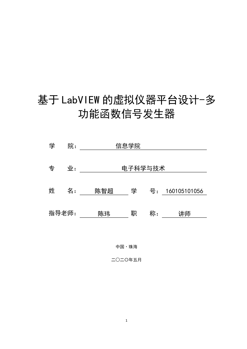 基于LabVIEW的虚拟仪器平台设计-多功能函数信号发生器学院:信息学院专业:电子科学与技术姓名:陈智超学号:160105101056指导老师:陈玮职称:讲师中国·珠海北京理工大学珠海学院2020届本科生毕业设计诚信承诺书本人郑重承诺:本人承诺呈交的毕业设计《基于LabVIEW的虚拟仪器平台设计-多功能函数信号发生器》是在指导教师的指导下,独立开展研究取得的成果,文中引用他人的观点和材料,均在文后按顺序列出其参考文献,设计使用的数据真实可靠。承诺人签名:北京理工大学珠海学院2020届本科生毕业设计基于LabVIEW的虚拟仪器平台设计-多功能函数信号发生器摘要函数信号发生器(Function Signal Generator)是一种信号发生装置,能产生某些特定的周期性时间函数波形(正弦波、方波、三角波、锯齿波等)信号,频率范围可从少则几微赫兹到几十兆赫兹,它在实验和研究中得到了广泛的应用。本课题的任务是自行研究设计出一种基于labview的虚拟仪器平台的函数信号发生器。主要思路是用LabVIEW设计好程序框图里的信号发生器模块,通过程序框图加上频率、周期、占空比等控件,设计出一个简单美观、功能齐全的前面板,通过示波器观察最后得到的波形。关键词:信号发生器:虚拟仪器实验平台:产生信号