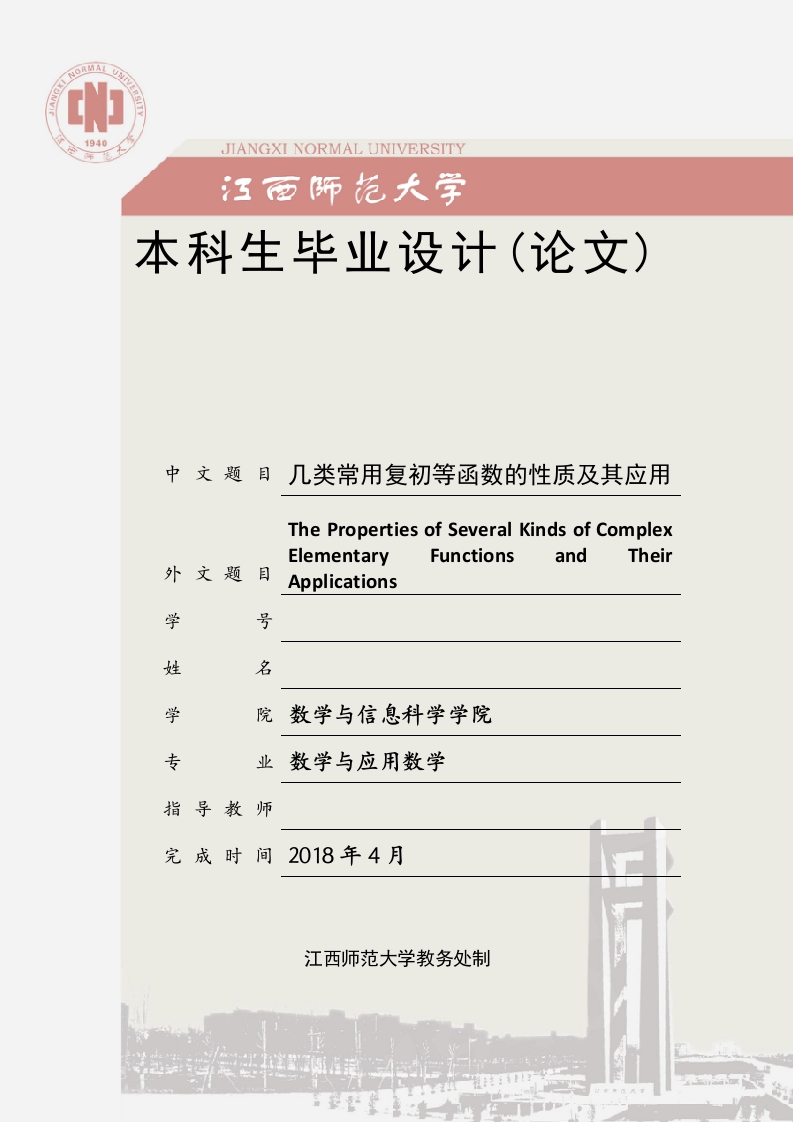 1940JIANGXI NORMAL UNIVERSITY本科生毕业设计(论文)中文题目几类常用复初等函数的性质及其应用The Properties of Several Kinds of ComplexElementaryFunctionsandTheir外文题Applications学号姓名学院数学与信息科学学院专业数学与应用数学指导教师完成时间2018年4月江西师范大学教务处制独创性声明本人郑重声明:1.此毕业论文是本人在指导教师指导下独立进行研究取得的成果。除了特别加以标注地方外,本文不包含其他人或其它机构已经发表或撰写过的研究成果。对本文研究做出重要贡献的个人与集体均已在文中作了明确标明。本人完全意识到本声明的法律结果由本人承担。2.本人完全了解学校、学院有关保留、使用学位论文的规定,同意学校与学院保留并向国家有关部门或机构送交此论文的复印件和电子版,允许此文被查阅和借阅。本人授权江西师范大学可以将此文的全部或部分内容编入有关数据库进行检索,可以采用影印、缩印或扫描等复制手段保存和汇编本文。3.若在江西师范大学毕业论文审查小组复审中,发现本文有抄袭,一切后果均由本人承担,与毕业论文指导老师无关。学位论文作者(签名):年月日