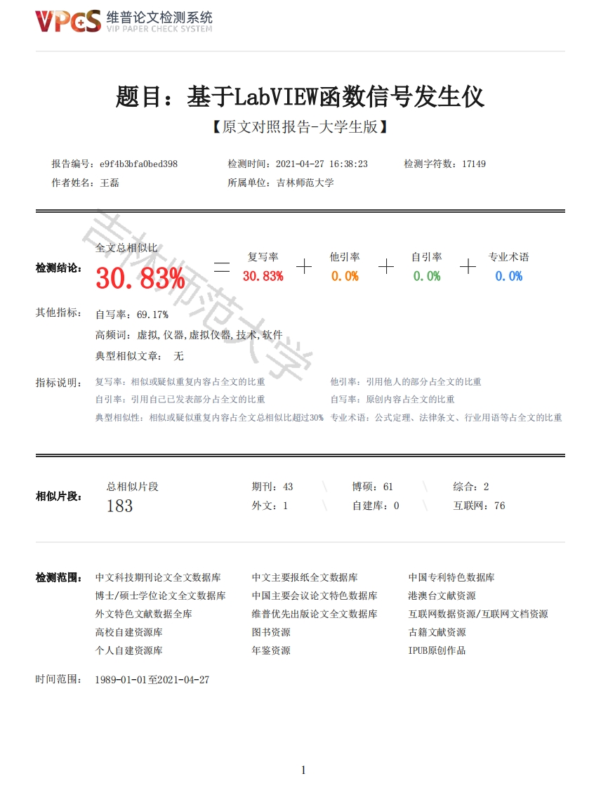 维普论文检测系统/IP PAPER CHECK SYSTEM题目:基于La.bVIEW函数信号发生仪【原文对照报告-大学生版】报告编号:e9f4b3bfa0bed398检测时间:2021-04-2716:38:23检测字符数:17149作者姓名:王磊所属单位:吉林师范大学全文总相似比复写率他引率自引率专业术语检测结论:30.83%30.83%0.0%0.0%0.0%其他指标:自写率:69.17%高频词:虚拟,仪器,虚拟仪器,技术,软件典型相似文章:无指标说明:复写率:相似或疑似重复内容占全文的比重他引率:引用他人的部分占全文的比重自引率:引用自己已发表部分占全文的比重自写率:原创内容占全文的比重典型相似性:相似或疑似重复内容占全文总相似比超过30%专业术语:公式定理、法律条文、行业用语等占全文的比重总相似片段期刊:43博硕:61综合:2相似片段:183外文:1自建库:0互联网:76检测范围:中文科技期刊论文全文数据库中文主要报纸全文数据库中国专利特色数据库博士/硕士学位论文全文数据库中国主要会议论文特色数据库港澳台文献资源外文特色文献数据全库维普优先出版论文全文数据库互联网数据资源/互联网文档资源高校自建资源库图书资源古籍文献资源个人自建资源库年鉴资源IPUB原创作品时间范围:1989-01-01至2021-04-27维普论文检测系统VIP PAPER CHECK SYSTEM原文对照颜色标注说明:■自写片段■复写片段(相似或疑似重复)口引用片段(引用)■专业术语(公式定理、法律条文、行业用语等)学士学位毕业论文(设计)题目:基于LabVIEW函数信号发生仪学生姓名:王磊学号:20192076108指导教师:耿晓琪所在学院:电气与信息学院专业:通信工程2021年5月黑龙江八一农垦大学本科毕业论文(设计)任务书论文(设计)题目基LabVIEW的函数信号发生仪姓名王磊学院名称电气与信息学院专业班级通信S19学号20192076108指导教师耿晓琪课题类型应用型研究口理论研究口基础研究毕业论文(设计)基本要求(1)通过获取时间模块和输出模块把数值显示在前面板上:(2)检测设定的时间来实现闹钟的功能:(3)通过软件把显示板设置更加美观:(4)实现正弦波,三角板,锯齿波的显示:工作量要求(1)毕业论文形成过程中,至少查阅5篇中外文教材:(2)毕业论文形成过程中,查阅20篇左右中外文参考文献:2维普论文检测系统VIP PAPER CHECK SYSTEM(3)毕业论文的正文内容不少于15000字或30页(含软件、硬件):(4)设计仿真图、软件编写与调试等。毕业论文(设计)的主要阶段规划(分前期、中期、后期)前期:查找资料,选择方案,进行方案对比,最后确定方案;中期:确定方案后,利用开发环境进行软件编写。后期:软件调试,编写论文,进行答辩。任务下发日期2020年11月18日完成日期2021年5月29日系主任签字:摘要本设计为基于虚拟仪器平台一LabVIEWE的函数信号发生仪设计,使用图形化语言编程的方式,设计了一款虚拟函数信号发生仪。虚拟信号发生器就是利用高性能的模块化硬件,结合高效灵活的Labview软件来完成各种测试,测量和自动化应用。该设计可以使虚拟函数限号发生仪能够产生正弦波,三角波,锯齿波等波形,其中输出信号的频率,增幅,相位,偏移量以及方波的占空比等都可以在较宽的范围内动态的调节程序,能够更好的得到满意的波形关键词:虚拟仪器:函数信号发生仪:LabVIEWABSTRACTThis design is based on the virtual instrument platform LabVIEW function signal generatordesign,using the graphical language programming way,designed a virtual function signal generator.Virtual signal generator is the use of high-performance modular hardware,combined with efficientand flexible LabVIEW software to complete a variety of testing,measurement and automationapplications.The design enables the virtual function limit generator to generate sine wave,triangular wave,sawtooth wave and other waveforms,in which the frequency,increment,phase,offsetand duty cycle of the output signal can be ad justed dynamically in a wide range,and thesatisfactory waveforms can be obtained better.Keywords:Virtual Function signal generator clock;LabVIEW目录摘要IIABSTRACTIII前言VI1绪论11.1课题研究的背景和意义11.2国内外虚拟仪器的发展形势11.2.1国外发展形势11.2.2国内发展形势22虚拟仪器32.1虚拟仪器技术发展现状32.2虚拟仪器的展望52.3后续发展的虚拟仪器技术62.4虚拟仪器与传统仪器相比的优缺点72.5虚拟仪器的应用82.6本章小结83虚拟仪器的开发平台-LabVIEW程序93.1虚拟仪器的开发语言93.2图形化虚拟仪器开发平台-LabVIEW93.3 LabVIEW的主要特点103