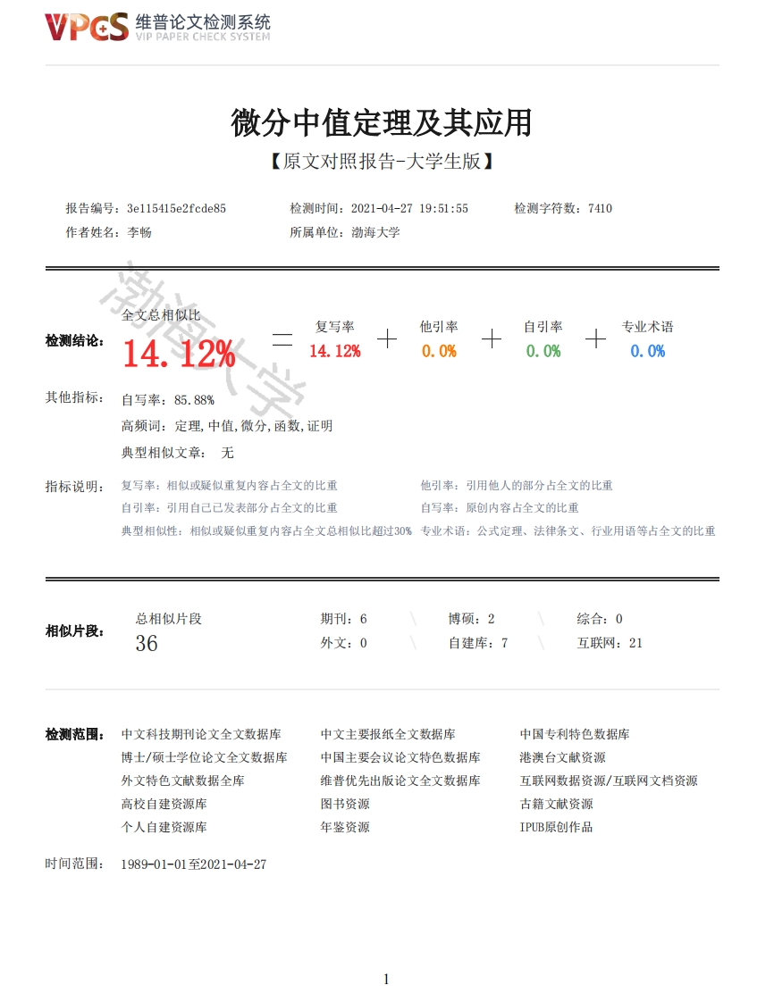 维普论文检测系统VIP PAPER CHECK SYSTEM微分中值定理及其应用【原文对照报告-大学生版】报告编号:3e115415e2fcde85检测时间:2021-04-2719:51:55检测字符数:7410作者姓名:李畅所属单位:渤海大学全文总相似比复写率他引率自引率专业术语检测结论:14.12%14.12%0.0%0.0%0.0%其他指标:自写率:85.88%高频词:定理,中值,微分,函数,证明典型相似文章:无指标说明:复写率:相似或疑似重复内容占全文的比重他引率:引用他人的部分占全文的比重自引率:引用自己已发表部分占全文的比重自写率:原创内容占全文的比重典型相似性:相似或疑似重复内容占全文总相似比超过30%专业术语:公式定理、法律条文、行业用语等占全文的比重总相似片段期刊:6博硕:2综合:0相似片段:36外文:0自建库:7互联网:21检测范围:中文科技期刊论文全文数据库中文主要报纸全文数据库中国专利特色数据库博士/硕士学位论文全文数据库中国主要会议论文特色数据库港澳台文献资源外文特色文献数据全库维普优先出版论文全文数据库互联网数据资源/互联网文档资源高校自建资源库图书资源古籍文献资源个人自建资源库年鉴资源IPUB原创作品时间范围:1989-01-01至2021-04-27维普论文检测系统VIP PAPER CHECK SYSTEM原文对照颜色标注说明:■自写片段■复写片段(相似或疑似重复)引用片段(引用)■专业术语(公式定理、法律条文、行业用语等)渤海大学本科毕业论文(设计)微分中值定理及其应用Differential Mean-Value Theorem and Its Application学院:数学科学学院专业:数学与应用数学(师范)学号:17021067学生姓名:李畅入学年度:2017指导教师:安立奎完成日期:2021年5月20日渤海大学承诺书本人承诺:所呈交答辩的毕业论文(设计)与通过学校查重检测的毕业论文(设计)为同一版本,提交电子文档的内容和纸质论文(设计)的内容完全一致。并且在毕业论文(设计)撰写期间,指导教师已对本人进行了学术规范和学术诚信教育,学习了《学位论文作假行为处理办法》(教育部令第34号)、《高等学校预防与处理学术不端行为办法》(教育部令第40号)、《渤海大学预防和处理学术不端行为办法》《渤海大学本科生毕业论文(设计)管理办法》等文件,并严格遵照文件执行,如未遵照文件执行,所产生的后果和责任由本人承担。毕业论文(设计)作者签名:摘要《数学分析》是数学专业的一门重要基础课,对于提高学生的数学分析能力有着重要的作用,学习数学分析可以锻炼逻辑思维能力。微分中值定理是数学分析中不可或缺的活动中心,是研讨函数的有力工具,使导数的局部性与函数的整体性之间的关系被明显地展示出来,具有十分广泛的用途。本文的第一部分介绍了微分中值定理的基本内容,即罗尔中值定理,拉格朗日中值定理,柯西中值定理和泰勒定理,对各个定理在概念和公式上加以区别,避免在学习的第一步糊里糊涂,以及讲述了它们的几何意义,便于更直观形象地理解,接下来介绍这些微分中值定理的联系,关系。第二部分是最主要的,根据题型问法应该运用哪个微分中值定理更好地解决问题,列举对应的各类题型,详细地解答。比如,用微分中值定理证明根的存在性,证明不等式,计算极限和讨论函数的单调性等方面应用。还有在具体问题中构造辅助函数能够巧妙地解决问题,它起着事半功倍的作用。关键词:微分中值定理;联系;应用Differential Mean-Value Theorem and Its ApplicationAbstract2维普论文检测系统VIP PAPER CHECK SYSTEMMathematical analysis is an important basic course for mathematics majors,which plays animportant role in improving students'mathematical analysis Learning mathematical analysis canexercise logical thinking ability.Differential mean value theorem is an indispensable part ofmathematical analysis and a powerful tool to study functions,which reflects the relationshipbetween the locality of derivatives and the integrity of functions and is widely used.The first part of this paper introduces the basic contents of differential mean value theorem,namely Roller mean value theorem,Lagrange mean value theorem,Cauchy mean value theorem and Taylortheorem,distinguishes each theorem in concept and formula,avoids being confused in the first stepof learning,and tells their geometric meanings,which is convenient for more intuitive and vividunderstanding.The next is the connection and relationship of these differential mean valuetheorems.The second part is the most important.According to which differential mean value theoremshould be used to better solve the problem,list the corresponding types of questions and answerthem in detail.For example,the application of differential mean value theorem to prove theexistence of roots,inequality,calculation limit and monotonic of functions is discussed.Also,constructing auxiliary functions in specific problems can skillfully solve problems,which plays amultiplier role.Key words:Differential Mean-Value theorem:Contact:Application目录摘要IAbstractII引言11.微分中值定理的基本内容21.1罗尔(Rol1er)中值定理21.2拉格朗日(Lagrange)中值定理31.3柯西(Cauchy)中值定理31.4泰勒(Taylor)定理41.5微分中值定理之间的关系52.微分中值定理的应用62.1利用微分中值定理罗尔定理证明根的存在性62.2利用微分中值定理拉格朗日定理和柯西中值定理证明问题62.3利用微分中值定理泰勒定理证明不等式72.4利用微分中值定理讨论函数的单调性92.5利用微分中值定理计算极限102.6利用微分中值定理确定方程根的个数112.7构造函数解决微分中值定理有关问题11结论13参考文献14引言我们学完数学