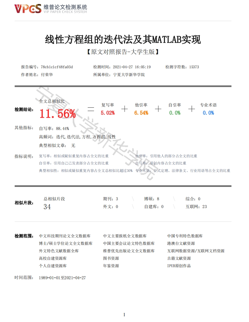 维普论文检测系统VIP PAPER CHECK SYSTEM线性方程组的迭代法及其MATLAB实现【原文对照报告-大学生版】报告编号:78cb1clcf48fa03d检测时间:2021-04-2716:05:19检测字符数:15373作者姓名:付荣华所属单位:宁夏大学新华学院全文总相似比复写率他引率自引率专业术语检测结论:11.56%5.02%6.54%0.0%0.0%其他指标:自写率:88.44%高频词:迭代,迭代法,方程,方程组,线性典型相似文章:无指标说明:复写率:相似或疑似重复内容占全文的比重引用他人的部分占全文的比重自引率:引用自己已发表部分占全文的比重自写率:原创内容占全文的比重典型相似性:相似或疑似重复内容占全文总相似比超过30%专业术语:公式定理、法律条文、行业用语等占全文的比重总相似片段期刊:3博硕:8综合:0相似片段:34外文:0自建库:0互联网:23检测范围:中文科技期刊论文全文数据库中文主要报纸全文数据库中国专利特色数据库博士/硕士学位论文全文数据库中国主要会议论文特色数据库港澳台文献资源外文特色文献数据全库维普优先出版论文全文数据库互联网数据资源/互联网文档资源高校自建资源库图书资源古籍文献资源个人自建资源库年鉴资源IPUB原创作品时间范围:1989-01-01至2021-04-27维普论文检测系统VIP PAPER CHECK SYSTEM原文对照颜色标注说明:■自写片段■复写片段(相似或疑似重复)口引用片段(引用)■专业术语(公式定理、法律条文、行业用语等)宁夏大学新华学院本科毕业论文(华文隶书,45号字,段前段后0行,单倍行距)(2021届)题目线性方程组的迭代法及其MATLAB实现系别信息与计算机科学系专业数学与应用数学年级2017级学生学号12017247812学生姓名付荣华指导教师王艳新华学院2021年5月9日摘要在实际问题中,如很多工程学,计算数学,物理及大型工程设计等最终都可归结为解线性方程组x=b,迭代法是求解线性方程组非常重要并且实用的一种方法.本文首先介绍了求解线性方程组的迭代法的基本思想,直接解法以及雅可比迭代法,高斯-赛德尔迭代法,逐次超松驰迭代法三种经典方法,其次借助MATLAB软件就三种迭代法所涉及的例题进行求解,并编写程序在MATLAB中实现,对三种迭代法的收敛性收敛速度进行了比较,最后得出高斯-塞德尔迭代法比雅可比迭代法收敛速度快,迭代次数少,以及松弛因子的选取,会影响迭代次数的结论.通过此次研究对线性方程组的迭代法有了充分的了解,能够为科学研究提供一定的理论参考价值.关键词:线性方程组:雅可比高斯-赛德尔逐次超松弛迭代法:MATLAB软件AbstractIn practical problems,such as many engineering,computational mathematics,physics and large-scale engineering design,all boil down to solving linear equations.Iterative method is a veryimportant and practical method to solve linear equations.This paper first introduces the basic ideaof iterative method for solving linear equations,direct solution and three classical methods:Jacobi iterative method,Gauss Seidel iterative method,successive over relaxation iterative method.Then,with the help of MATLAB software,we solve the examples involved in the three iterativemethods,and write programs to realize them in Matlab.The convergence and convergence speed of thethree iterative methods are compared,Finally,it is concluded that Gauss Seidel iterative methodhas faster convergence speed than Jacobi iterative method,fewer iterations,and the selection ofrelaxation factor will affect the number of iterations.Through this study,we have a fullunderstanding of the iterative method of linear equations,which can provide certain theoreticalreference value for scientific.2维普论文检测系统VIP PAPER CHECK SYSTEMKey words:linear equations;Jacobi,Gauss-Seidel,successive over relaxation iterative method;MATLAB software.目录第1章绪论11.1研究背景及研究意义11.1.1研究背景11.1.2研究意义11.2研究现状21.3研究内容与方法21.3.1研究内容21.3.2研究方法3第2章线性方程组的迭代法42.1迭代法的基本思想42.2迭代法收敛性的判别42.2.1收敛性基本定理52.2.2收敛速度及迭代法的收敛条件52.3线性方程组的迭代法72.3.1雅可比迭代法72.3.2高斯-塞德尔迭代法82.3.3逐次超松弛迭代法9第3章线性方程组迭代法的MATLAB实现13.1 MATLAB软件简介113.2雅可比迭代法MATLAB程序113.3高斯-塞德尔迭代法的MATLAB实现133.4逐次超松弛迭代法的MATLAB实现15学新华学院第4章结论与展望19参考文献20致谢21附录22第1章绪论1.1研究背景及研究意义1.1.1研究背景在学习高等代数时,我们已经初步接触了线性方程组的相关内容,线性方程组主要是通过求解来判断方程组的三种解的情况,对于低阶的线性方程组,可以通过直接法求解,但是对于高阶线性方程组,通过大量实验表明,求解线性方程组在数值模拟计算中要花费大量的时间,过程复杂,因此寻找求解线性方程组有效方法十分重要,体现了在数学计算中具有特殊地位求解线性方程组的方法有直接法和迭代法两种:直接法的优点是不存在舍入误差,但当系数矩阵的阶数和误差较大时,直接法就会受诸多限制,虽然近年来对直接法的研究较少,但随着计算机的出现和计算机技术的快速发展,迭代法得到了广泛的应用,主要解决电力,程序设计,热传导,振动以及社会科学中的各种问题[1].它已成为求解大型稀疏矩阵线性方程组的重要方法之一.可以说,线性方程组的求解在现代科学领域中占有相当重要的地位.1.1.2研究意义在现实生活中,经常遇到求解线性方程组的数学问题,例如在研究应用科学,数学,物理这些问题往往需要求数值解.在进行数