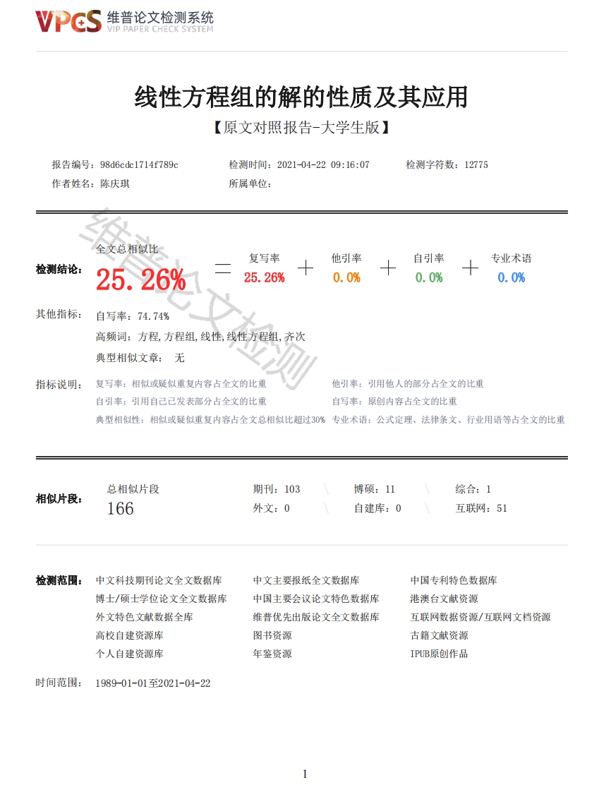 维普论文检测系统线性方程组的解的性质及其应用【原文对照报告-大学生版】报告编号:98d6cdc1714f789c检测时间:2021-04-2209:16:07检测字符数:12775作者姓名:陈庆琪所属单位:全文总相似比复写率他引率自引率专业术语检测结论:25.26%25.26%0.0%0.0%0.0%其他指标:自写率:74.74%高频词:方程,方程组,线性,线性方程组,齐次典型相似文章:无指标说明:复写率:相似或疑似重复内容占全文的比重他引率:引用他人的部分占全文的比重自引率:引用自己已发表部分占全文的比重自写率:原创内容占全文的比重典型相似性:相似或疑似重复内容占全文总相似比超过30%专业术语:公式定理、法律条文、行业用语等占全文的比重总相似片段期刊:103博硕:11综合:1相似片段:166外文:0自建库:0互联网:51检测范围:中文科技期刊论文全文数据库中文主要报纸全文数据库中国专利特色数据库博士/硕士学位论文全文数据库中国主要会议论文特色数据库港澳台文献资源外文特色文献数据全库维普优先出版论文全文数据库互联网数据资源/互联网文档资源高校自建资源库图书资源古籍文献资源个人自建资源库年鉴资源IPUB原创作品时间范围:1989-01-01至2021-04-22维普论文检测系统VIP PAPER CHECK SYSTEM原文对照颜色标注说明:■自写片段■复写片段(相似或疑似重复)引用片段(引用)■专业术语(公式定理、法律条文、行业用语等)摘要本文分为三个部分进行,第一部分是预备知识,讲述线性方程组的历史背景、概念、表述方式、常见的几种解法,为后文打下知识地基。在这部分里,将会讲解线性方程组的起源,通过深挖各国各个时代数学家对线性方程组的研究来探索它的由来、形式、概念。也不拘泥于线性方程组的一种形式,围绕它的三种形式来展开对它的解法解释。另外,还提及了在第三章应用中所需要的知识补充。第二部分是线性方程组的解的性质,该部分是分成齐次线性方程组和非齐次线性方程组两大基调,并通过研究线性方程组的几何意义来证明它的解的性质。在文献[5]中,证明线性方程组的解的性质是在向量组的线性相关性的基础下证明的,私认为方法是更为简单,但是也没有很大地凸显出线性方程组的几何意义,导致几何与代数的衔接没有更为融洽。在这部分里,运用线性方程组的几何意义去解释了它的解的性质,这为接下来的文献[5]中的第四章“几何空间中的平面与直线”的中提及的性质、概念和定义提供更为密切的联系。第三部分是线性方程组的应用,通过利用线性方程组的相关性质和理论在高等代数、数学分析、初等数学、解析几何、生活中等例子加以理解。在不同的学科中、生活上总是少不了线性方程组的身影,学习线性方程组的实际运用才能对线性方程组的概念、性质等记忆更为深刻。能有效地运用知识解决问题,正是我国高等教育的含义所在。关键词线性方程组的解应用性质目录引言第一章:预备知识1.1线性方程组的历史背景1.2线性方程组的概念1.3线性方程组的三种表述方式1.3.1一般形式1.3.2矩阵形式1.3.3向量形式1.4简述线性方程组常用的方法1.4.1消元法1.4.2克莱姆法则1.4.3迭代法1.5矩阵秩的概念1.6线性方程组的解的存在定理1.7多项式的带余除法第二章:线性方程组的性质2.1齐次线性方程组的解的性质2维普论文检测系统VIP PAPER CHECK SYSTEM2.2非齐次线性方程组的解的性质第三章:线性方程组的应用3.1在高等代数中的应用3.1.1在线性空间里的应用3.1.2在求解抽象矩阵与行列式计算中的应用3.1.3在多项式里的应用3.2在解析几何中的应用3.2.1在共线问题中3.2.2在共面问题中3.2.3在曲线问题中3.3在初等数学中的应用3.3.1在等式证明中3.3.2在证明三角恒等式中3.4在生活中的应用、03.5在中学其他课程上的应用3.6在数学分析上的应用参考文献致谢引言众所周知,线性方程组无论是在线性代数还是高等代数,都起着重要的作用,特别是线性方程组的解的性质。另外,线性方程组的应用中也要大量用到其性质。线性方程组的应用十分广泛,无论是在学科之间还是在生活之中,它的出现频率都较为频繁,比如,线性方程组在线性代数中就起到非常重要的作用,如果理解了有关线性方程组与矩阵与向量之间的联系,那么对于攻克该学科的难点就不成问题。同时,它在工程技术中的计算问题,经济管理中的规划问题,网络流模型问题等也占了很大的比重,故研究它的应用就变得非常有意义。另外,大部分的教材中很多只是涉及它的基础理论,对于它的应用方面,教材只是一笔带过,这样会使学生更注重理论不注重实际应用,所学的知识仅仅是停留在理论表面,忽略内里,不利于学生更深层次地掌握线性方程组的本质。而且我国高等教育的实际和特点是:力图让学生“掌握基本概念,理论,方法和使用技能,强化实际应用”。故在本文中着重对线性方程组的应用来展开课题讨论,进而增强学生的实际运用能力。第一章:预备知识1.1线性方程组的历史背景线性方程组最早出现是在中国的著作一一《九章算术》中,“今有上禾二秉,中禾三秉,下禾四秉,实皆不满斗。上取中,中取下,下取上,各一秉而实满斗。问上、中、下禾实一秉各几何”便是对线性方程组最初的描述。该书中还附贴着解法:“置上禾三秉,中禾二秉,下禾一秉。实三十九斗,于右方。中、左禾列如右方”。在这本书中出现的有关于线性方程组的大部分问题是来源于生