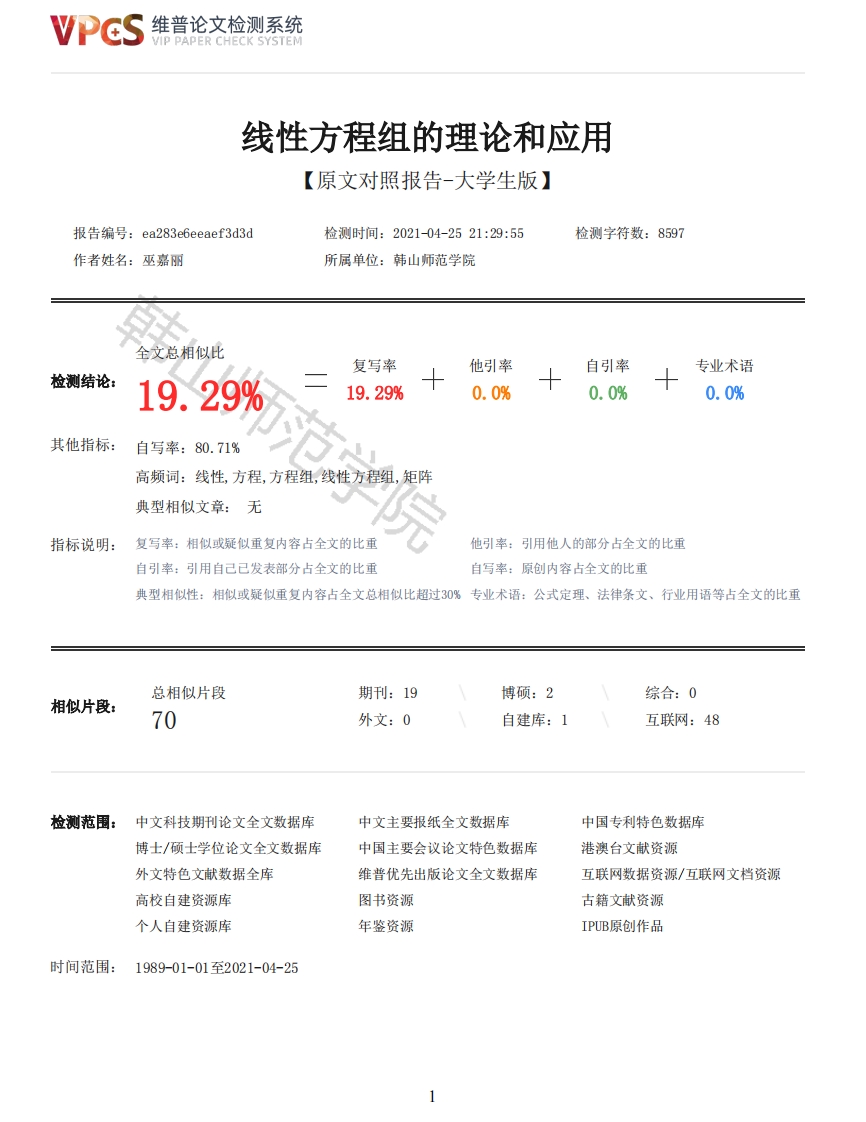 维普论文检测系统VIP PAPER CHECK SYSTEM线性方程组的理论和应用【原文对照报告-大学生版】报告编号:ea283e6 eeaef:3d3d检测时间:2021-04-2521:29:55检测字符数:8597作者姓名:巫嘉丽所属单位:韩山师范学院全文总相似比复写率他引率自引率专业术语检测结论:19.29%19.29%0.0%0.0%0.0%其他指标:自写率:80.71%高频词:线性,方程,方程组,线性方程组,矩阵典型相似文章:无指标说明:复写率:相似或疑似重复内容占全文的比重他引率:引用他人的部分占全文的比重自引率:引用自己已发表部分占全文的比重自写率:原创内容占全文的比重典型相似性:相似或疑似重复内容占全文总相似比超过30%专业术语:公式定理、法律条文、行业用语等占全文的比重总相似片段期刊:19博硕:2综合:0相似片段:70外文:0自建库:1互联网:48检测范围:中文科技期刊论文全文数据库中文主要报纸全文数据库中国专利特色数据库博士/硕士学位论文全文数据库中国主要会议论文特色数据库港澳台文献资源外文特色文献数据全库维普优先出版论文全文数据库互联网数据资源/互联网文档资源高校自建资源库图书资源古籍文献资源个人自建资源库年鉴资源IPUB原创作品时间范围:1989-01-01至2021-04-25维普论文检测系统VIP PAPER CHECK SYSTEM原文对照颜色标注说明:■自写片段■复写片段(相似或疑似重复)口引用片段(引用)■专业术语(公式定理、法律条文、行业用语等)韩山师范学院学生毕业论文(2021届)题目(中文)线性方程组理论和应用(Theory and Application of Linear Equations学院:数学与统计学院专业:数学与应用数学班级:20171113姓名:巫嘉丽学号:2017111348指导教师:王卫红讲师韩山师范学院教务处制诚信声明我声明,所呈交的毕业论文是本人在老师指导下进行的研究工作及取得的研究成果。据我查证,除了文中特别加以标注和致谢的地方外,论文中不包含其他人已经发表或撰写过的研究成果,我承诺,论文中的所有内容均真实、可信。毕业论文作者签名:巫嘉丽签名日期:2021年5月1日摘要:从初中开始我们已经学习数与代数的知识了,高等代数在大学里面作为一门基础性课程,线性方程组的理论以及应用则是高等代数里边比较重要的内容。随着线性代数的不断发展,线性方程组主要讨论齐次线性方程组和非齐次线性方程组在理论和生活中的应用,在理论上分为三种形式,第一种形式为一般形式,第二种形式为矩阵形式,第三种以向量形式呈现,在应用过程中,主要讨论齐次线性方程组的一般解法,基础解系,如何判断向量的相关性,解的判定,矩阵的秩以及线性方程组有非零解的条件,除此之外,线性方程组为线性代数与解析几何架起了桥梁,与其它学科之间也有着密切的联系。结合生活实例,让我们感受到数学知识的妙处,体会到生活中处处有数学。关键词:理论:解的判定:矩阵:应用Abstract:Since junior high school,we have learned the knowledge of number and algebra.Higheralgebra is a basic course in university.The theory and application of linear equations are moreimportant contents in higher algebra.With the continuous development of linear algebra,linearequations are mainly divided into homogeneous linear equations and nonhomogeneous linear equations,which are presented in three forms:general form,matrix form and vector form.In addition,linearequations are a bridge between linear algebra and analytic geometry and are closely related to otherdisciplines.Combined with life examples,let us feel the beauty of mathematical knowledge,experience that there is mathematics everywhere in life.Key words:homogeneous system of linear equations:determination of solution;Matrix:Application目录2维普论文检测系统VIP PAPER CHECK SYSTEM1.绪论(1)1.1发展现状(1)1.2研究目的与意义(1)1.3研究现状(1)2.线性方程组的理论(2)2.1线性方程(2)2.2线性方程组的几种表现形式(2)2.3向量组的线性相关与线性无关(3)2.4线性方程组解的情况及其判定(3)3.线性方程组的一些应用(3)3.1线性方程组在理论上的应用(4)3.2线性方程组在实际生活中的魅力(10)结束语(12)参考文献(18)致谢(19)线性方程组的理论和应用1.绪论1.1发展状况我们所学线性方程组的有关问题,最初来源于生活实践,正如我们现在在大学所学的高等代数课程里面以及其他学科领域也有涉及到相关的知识内容,线性方程组的解法首先出自于中国古代刘薇的作品《九章算术》一书中,其主要核心就是使用高斯消元法来进行求解。随着线性代数的不断发展,线性方程组的理论和性质增加了不少新的内容,使得线性方程组的应用范围得到明显扩大,当然在我们日常生活当中,遇到的实际问题是多种多样的,因此,在我们学习的过程中应严格要求自己了解和掌握更多有效的方法来求解线性方程组。1.2研究目的与意义高等代数在大学里面是一门比较重要的课程,然而线性方程组则是高等代数中一个核心的内容,其主要是讨论齐次线性方程组和非齐次线性方程组求解问题,解的判定,如何判断线性方程组有非零解以及在生活实际中的一些应用,同时,线性方程组也广泛应用于其他学科之中,它沟通了线性方程组与解析几何之间的内在联系,透视了代数与几何之间是相互渗透的,利用线性方程组理论解题,可以把复杂的几何问题简单化,因此,在学习该知识点的时候应熟练掌握线性方程组的理论并能够正确运用,以发挥其最大意义。1.3研究现状1.3.1国外研究现状线性方程组的研究起源于古代中国,由刘撰写的《九章算术注》一书中,已经提