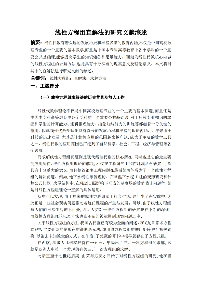 线性方程组直解法的研究文献综述摘要:线性代数有着久远的发展历史和丰富多彩的教育内涵,不仅是中国高校数理专业的一个重要的基本教学,而且是中国本专科高等教育中各个学科的一个重要公共基础课,能够提高学生的知识储备和思维能力。而最为线性代数核心内容的线性方程组的求解方法,也是具有十分深刻的现实意义及理论意义。本文将对其中的直解法进行研究文献的综述。关键词:线性方程组:直解法:求解方法一、主题部分(一)线性方程组求解法的历史背景及前人工作线性代数学理论不仅是中国高校数理专业的一个主要的基本课题,而且还是中国本专科高等教育中各个学科的一个重要公共基础课,对于后续专业知识的掌握和学生的计算能力、逻辑推理能力、抽象归纳能力的训练等都起着十分关键的作用。因此线性代数学理论具有漫长的发展历程和丰富的理论内涵。近年来由于科技的迅速发展,尤其是计算机应用的范围越来越广泛,成为了主要的数学工具之一。线性代数的应用范围已广泛到了自然科学、社会、工程、经济与管理等各个领域。而求解线性方程组问题则是现代线性代数的核心所在,同时也是它的最主要的应用所在。线性方程组理论的解决,不仅在工程研究上和在环境科学研究上,都具有十分重大的意义,而且使得很多工程问题在最后都可能成为了一个线性方程组的解决问题。例如,地下水线性渗流理论、在常温下水泥T柱的变形研究和计算公式问题、房屋结构中,在强烈日照影响下形成的温度场的数值估计问题等,都是对线性方程组理论一直解的具体运用。从中可以发现,由于原来的线性方程组源于社会生活,并产生了在实践中,因此正是一些社会现实问题推动着这门课程的产生与发展。所以,由于线性方程组与人们的日常生活密不可分,因此人类对于线性方程组的研究也在不断的深化,而线性方程组理论以及方法也在不断的被运用到现实问题之中。关于线性方程组的方法,我国古代就已有较为全面的阐述。在《九章算术方程式》中,主要介绍的是现在的高斯消元法,即用原方程式组的增广矩阵进行初等转换,以消去未知数量的方式。在印度,于梵藏的算书中很早就存在了方程式组。在西欧,法国人几何家彪特在一五五九年提出了三元一次方程组的求解,这就是欧洲人中第一个发现的有关三元一次方程组的求解。此后直至十七世纪后期,由莱布尼茨才开始了对线性方程组的研究,他在当时研究的主要是含有二个未知数的三个由线性方程组所组成的方程,同时通过对线性方程组的深入研究还促成了他提出了行列式算法。后来,俄国的几何学家培祖根用序列形式给出了线性方程组的清晰定义。在十八世纪上零点五叶,麦克劳林通过对含有第二、第三、最后四个未知数的线性方程组的研究,最后确定了如今的克莱姆法则,而这个结果则在一七四八年时被收录于了他的主要作品《代数论著》中。在一七五零年前,克莱姆就提出了更为普遍的关于多重次未知量线性微分方程组的行列式求解的基本规则。在十八世纪后半叶,法兰西现代数学研究家贝祖证实了多重齐次线性方程组的非零解的必然性:系数矩阵必须等于零。到十九世纪,微分方程组论研究也获得了很大成果。有关微分方程组的增广矩阵和非增广矩阵的定义,正是在那段时期由英格兰现代数学家史密斯所引入的。另外,英格兰现代数学家道奇森也证实了:与n个不知道数或个微分方程的微分方程组相容的充要前提条件便是系数矩阵必须与增广矩阵的秩一致。随着线性方程组理论的深入发展和计算方法的不断进步,其在处理理论或实践问题中的运用也将日益深入。特别是由于当下计算机的快速发展,以及科技进步,线性方程组理论与方法,对于当下的很多实际领域,包括飞机、造船、化工还有其他的结构与工程技术领域中,也起到了日益巨大的影响。通过对线性方程组基础理论及方法的进一步认识与研究,其在人们日常生活中各个领域的意义逐步的凸显了起来。如今,线性方程组理论正逐步完善,而各种方法也不断的被摸索出并逐步完善,今天将对其直解法相关计算方法进行研究文献综述。(二)线性方程组直解法的研究现状及研究成果在社会生产生活中的各个领域,都常会遇到求解阶线性方程组(1.2.1)的问题,方程组(1.2.1)可简记为Ax=b。(1.2.1)a其中A=X2b=b线性方程中的计算方式分成二大类,一种是直法,另一类是迭代法。而本次会议重点研究的就是直分析方法。所谓直解,是指通过有限步算术运算,得到正确解的办法。在实际运算过程中由于舍入误差的出现与干扰,只得求出近似解。直解中,最基本的方法是高斯消元法以及某些变换,是解低阶稠密矩阵方程组及其部分系数方程的最有效方式。具体如下:2.1高斯消去法高斯消去法(Gauss Elimination Method)是一个高度规律化的加减消元法。基本思路是,利用逐次消元算法把将要解决的一般线性方程组转换为上三角方程,再即将一般线性方程组的系数矩阵转换为上三角矩阵,进而将一般线性方程组的求解转换为等价(同解)的上三角方程的求解。著名的线性方程组的最直接方法是高斯消去法,它是在国际上的普遍叫法,以法国数学家高斯为名,约于一八零零年,高斯(Guss)发明了高斯消元法,利用它解答了天体的运动难题。而高斯先生的消去法实为中国古代法,最