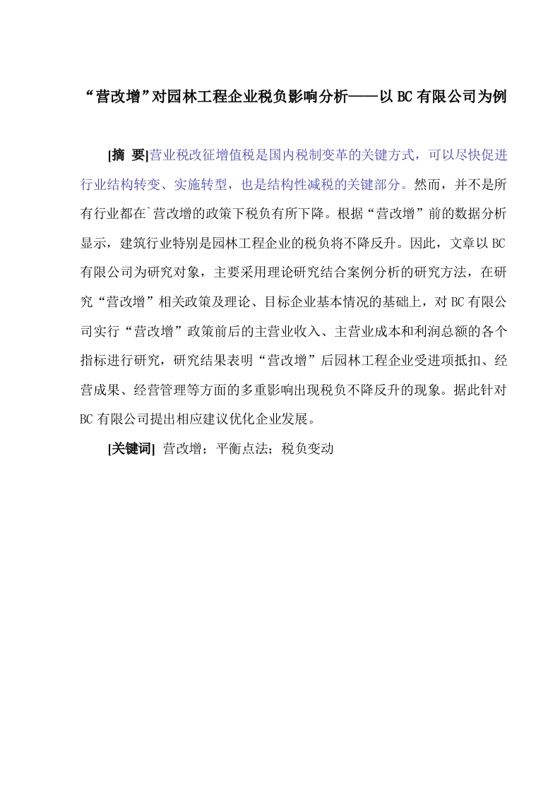 “营改增”对园林工程企业税负影响分析一一以BC有限公司为例摘要]营业税改征增值税是国内税制变革的关键方式,可以尽快促进行业结构转变、实施转型,也是结构性减税的关键部分。然而,并不是所有行业都在`营改增的政策下税负有所下降。根据“营改增”前的数据分析显示,建筑行业特别是园林工程企业的税负将不降反升。因此,文章以BC有限公司为研究对象,主要采用理论研究结合案例分析的研究方法,在研究“营改增”相关政策及理论、目标企业基本情况的基础上,对BC有限公司实行“营改增”政策前后的主营业收入、主营业成本和利润总额的各个指标进行研究,研究结果表明“营改增”后园林工程企业受进项抵扣、经营成果、经营管理等方面的多重影响出现税负不降反升的现象。据此针对BC有限公司提出相应建议优化企业发展。关键词1营改增:平衡点法:税负变动Analysis on the Influence of "Business tax reform VAT"onthe Tax Burden of Landscape Engineering EnterpriseTaking BC Limited Company as an ExampleAbstract:The change of sales tax is an important measure of China's taxsystem reform.It can promote the adjustment of industrial structure and promotethe economic restructuring.It is also the main content of structural tax reduction.However,not all of the industry in the business tax policy under the change hasdeclined.According to the "business change"before the data analysis shows thatthe construction industry,especially the tax burden of garden engineeringenterprises will not fall but rise.Therefore,the article takes BC LimitedCompany as the research object,mainly uses the research method combining thetheory research with the case analysis,on the basis of studying the relevantpolicies and theories of "business change"and the basic situation of the targetenterprise,The main operating costs and the total profits of the variousindicators of the study,the results show that "business change after the"gardenproject by the deduction of income,operating results,management and otheraspects of the impact of the emergence of tax Negative rise instead of fallingphenomenon.According to the BC Company Limited to make correspondingrecommendations to optimize enterprise development.Keywords:Business tax reform VAT;Equilibrium point method;Changes intax burden目录1“营改增”政策相关概述.11.3园林工程企业“营改增”后的税制变化....22BC有限公司的税负现状2.1BC有限公司的简介...2.4BC有限公司“营改增”后的税负变化....63“营改增”对BC有限公司的税负影响分析,3.1BC有限公司税负变化的原因分析3.2“营改增”对BC有限公司的不利影响3.3“营改增”对BC有限公司的有利影响..4针对BC有限公司调整措施的建议..…参考文献…12