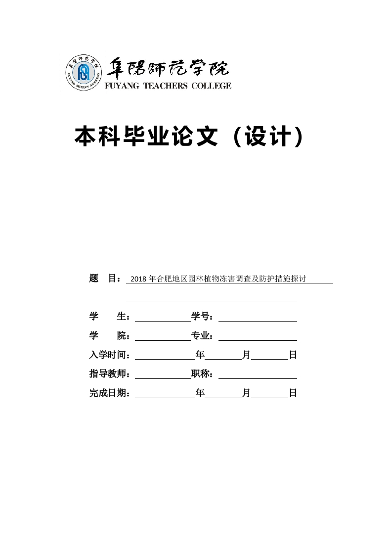 FUYANG TEACHERS COLLEGE本科毕业论文(设计)题目:2018年合肥地区园林植物冻害调查及防护措施探讨学生:学号:学入学时间:年月日指导教师:职称:完成日期:年月日2018年合肥地区园林植物冻害调查及防护措施探讨摘要:2018年1月2325日,合肥市连续3d最低温一89℃许多园林植物遭受不同程度冻害。本文对其受冻害情况及其冻后养护恢复情况进行调查分析。结果表明,共有19科34属41种园林植物遭受不同程度的冻害,其中约83%为引种植物:66%的植物冻害等级为轻度或中度,不需人为干预或适度修剪就能恢复正常生长:27%的植物冻害等级为重度,长势明显趋弱:7%的植物出现受冻死亡的现象。建议在森林城市建设中,植物的引种遵循科学规律,重视别化,尽量选用乡土植物与外来植物相搭配的配置方式,加强日常管护,降低低温逆境胁迫对园林植物的影响。关键词:园林植物:冻害:调查:防护Study on the investigation and protection measures ofgarden plants in hefei area in 2018Abstract:From January 23 to 25,2018,the lowest temperature of 3d in hefei is 8~9.Manygarden plants suffer from different degrees of frost damage.In this paper,the investigation andanalysis of the freezing damage and the recovery of the post-frozen maintenance were carried out.The results showed that there were a total of 41 species of garden plants in 19 families withdifferent degrees of frost damage,about 83%of which were introduced plants.66 percent of plantdamage was mild or moderate,and normal growth was restored without human intervention ormoderate pruning.27%of plant freeze damage grade was severe,and the growth was significantlyweaker.Seven percent of plants die from freezing.Suggestions in the construction of urban forest,plant introduction,follow the scientific laws,attaches great importance to the domestication,trychoosing local plants and alien plants are tie-in way of configuration,strengthen dailymanagement,reduce the effects of low temperature adversity stress on garden plants.Key words:Garden plants:Cold injury.Survey:protective目录1极寒天气概况132.1调查地点与调查对象32.2调查时间32.3调查方法3调查的意义及目的43.1意义…43.2目的4调查研究的现状54.1国外研究现状54.2国内研究现状55调查结果与分析75.1调查结果75.2i95.2.2植物自身特性及生存环境决定了其冻害程度95.2.3115.2.4受冻害程度措施可降低植物的冻害等级116防护措施.12126.2强化日常养护管理.……126.4克服盲目跟风和比新、比奇比特心理,不废弃常规种类的应用...141617
