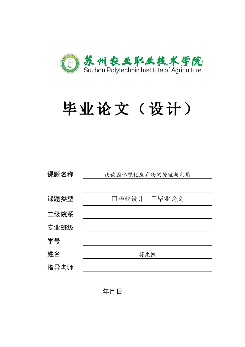 Suzhou Polytechnic Institute of Agriculture毕业论文(设计)课题名称浅谈园林绿化废弃物的处理与利用课题类型口毕业设计口毕业论文二级院系专业班级学号姓名蒋忠帆指导老师年月日摘要摘要:园林绿化丢弃物基本上是指园林绿化自己凋谢或人工修剪所制造的绿化残体,基本上包括叶片、废草、树木与灌木剪枝等,其基本上组分为木质纤维。因为城市园林植物的进展。植物面积一直增加,所以,所制造的园林绿化丢弃物也一直增加,如果不进行解决,随意放置,不但影响园林景观效果,又易引起生态污染。文章简要介绍了国内外园林绿化丢弃物的解决办法,并对重复运用园林绿化丢弃物的必要性和环境效益进行了说明,为我国进展园林绿化丢弃物的产业化供给参考。园林丢弃物的运用问题日益引起人们的重视。说明了园林植物丢弃物运用的现状,表明了园林植物丢弃物处置运用存在的问题,简述了园林植物丢弃物的应用方向关键词:园林绿化丢弃物重复运用装订线ABSTRACTABSTRACT:Landscape greening discards basically refer to the greening debrisproduced by landscape greening withering or artificial pruning,basically includingleaves,waste grass,trees and shrubs pruning,and its basic components are woodfiber.Because of the progress of urban landscape plants.The plant area has beenincreasing,so the gardening waste has been increasing.If it is not solved,it will notonly affect the landscape effect,but also easily cause ecological pollution.This paperbriefly introduces the solutions of gardening waste at home and abroad,and explainsthe necessity and environmental benefits of reusing gardening waste,which canprovide reference for the industrialization of gardening waste in China.The use of装garden discards has attracted increasing attention.This paper describes the currentsituation of the application of garden plant discards,points out the problems existingin the disposal and application of garden plant discards,and outlines the applicationdirection of garden plant discards.订KEYWORDS:reuse of gardening waste线